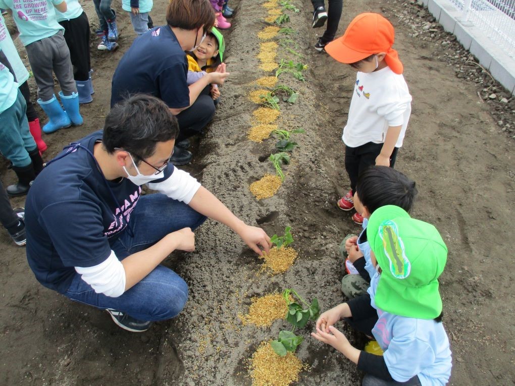 えだまめの種とさつまいもの苗を「早く大きくなあれー!」と優しく土をかけ、