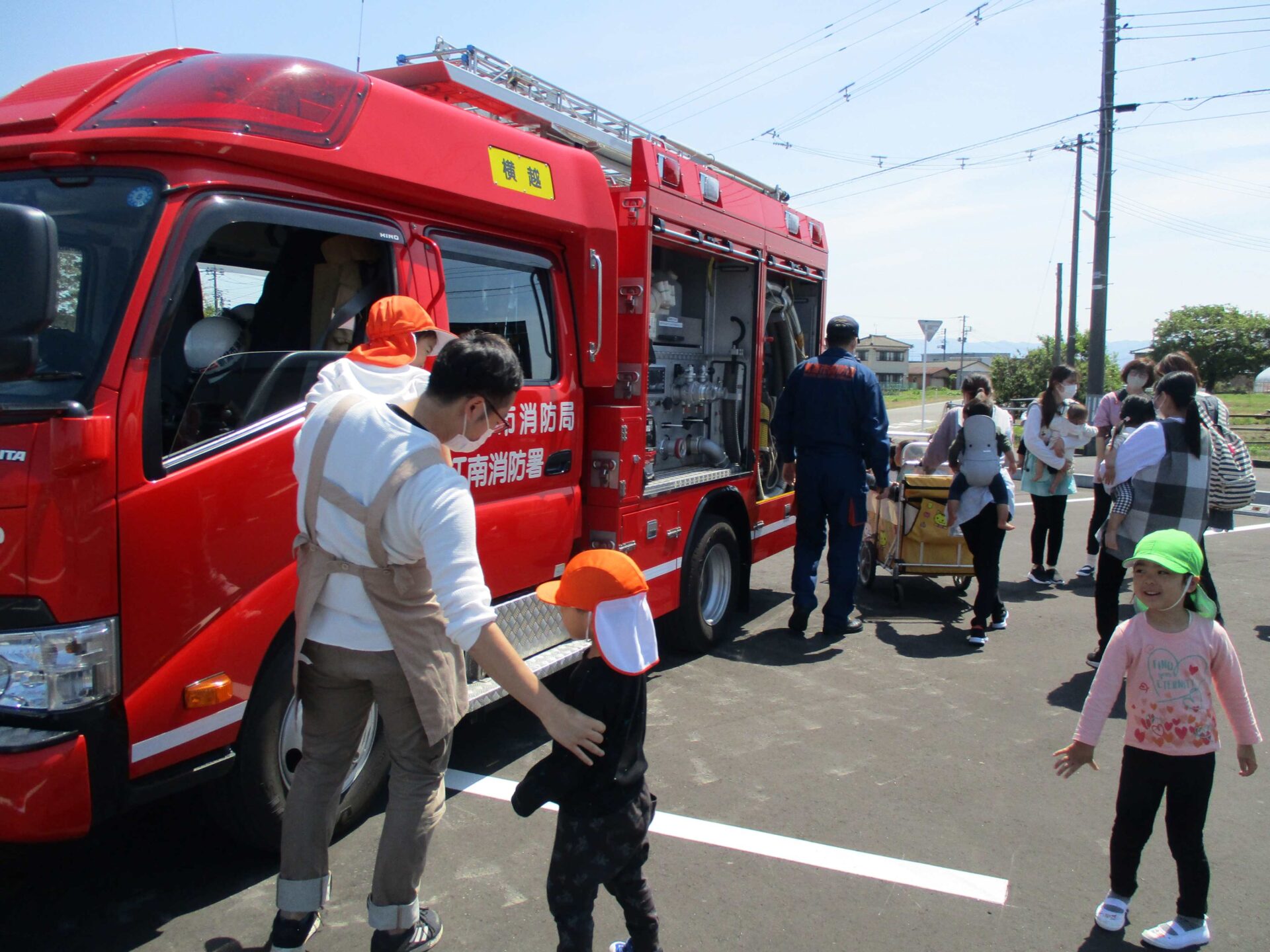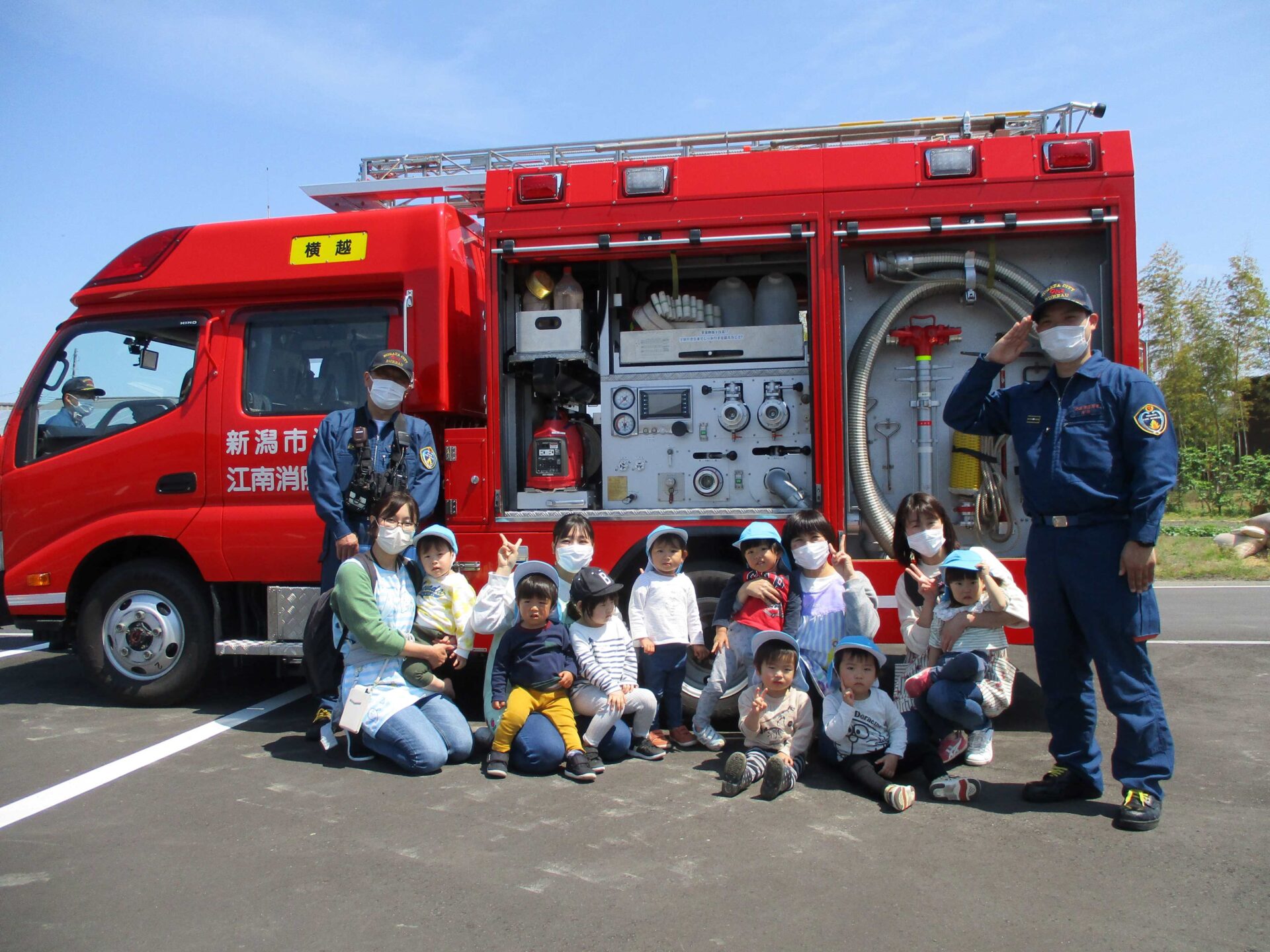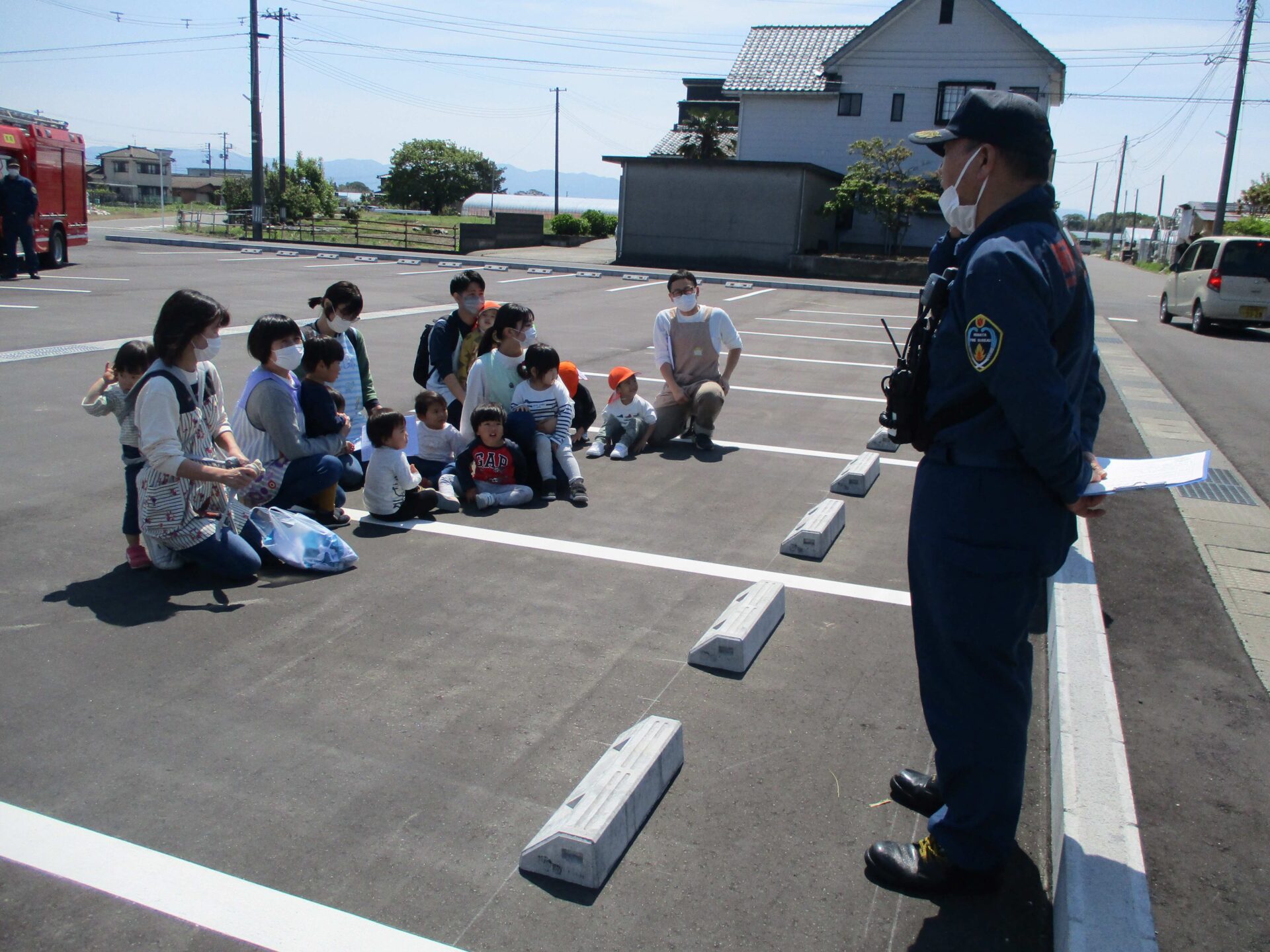 消防士さんたちが見守る中、無事に避難できました!