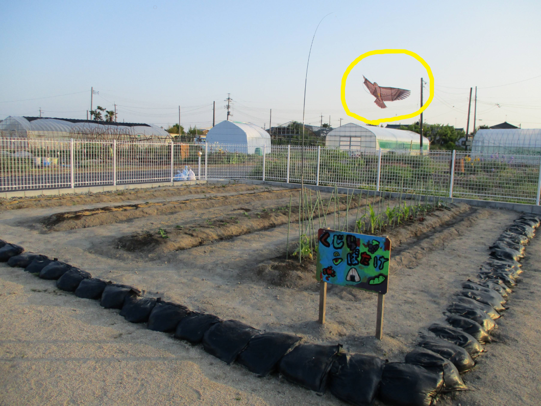 畑の見張り番が、登場しました。鷹(タカ)の形のカイト(凧)です。