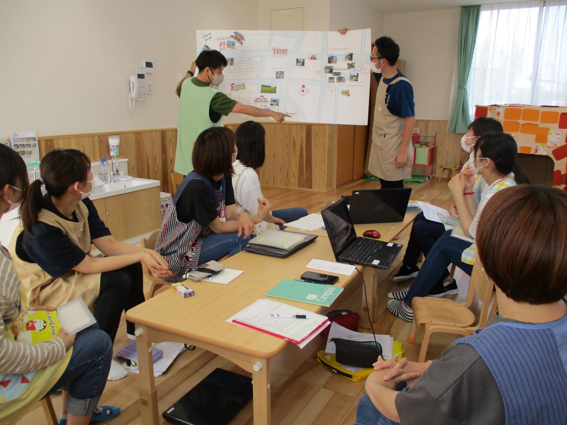 職員会議では、外へ出た時の注意点や、お散歩コースの確認をしました。