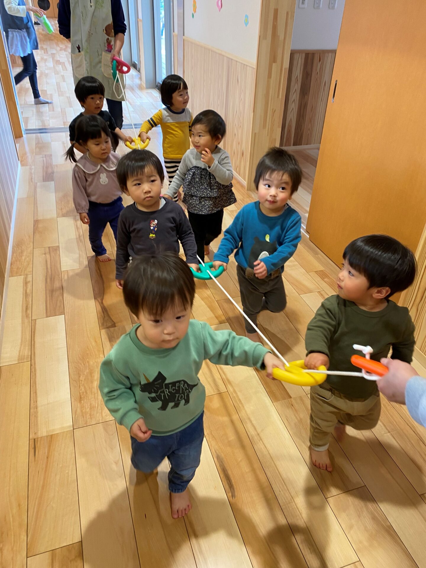 にじ組(2歳児)は、廊下でお散歩用の誘導リングにつかまり、