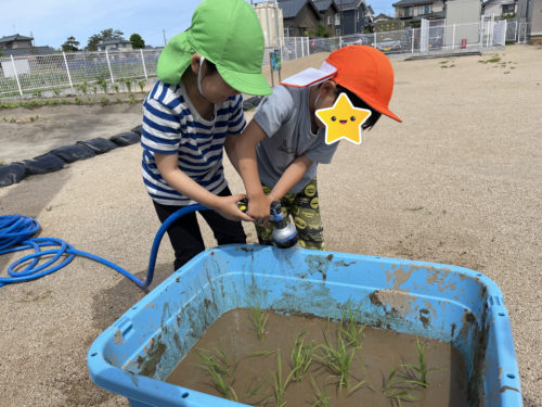 4月27日に姉妹園である、すいか保育園さん(つきぐみ5歳児)、おむすびこども園さん(つきぐみさん5歳児)と行った、3園合同苗植えをきっかけに野菜を育てることや成長に興味を持ち始め、くじらばたけに様々な野菜を育てているそらぐみさん(4歳児)。