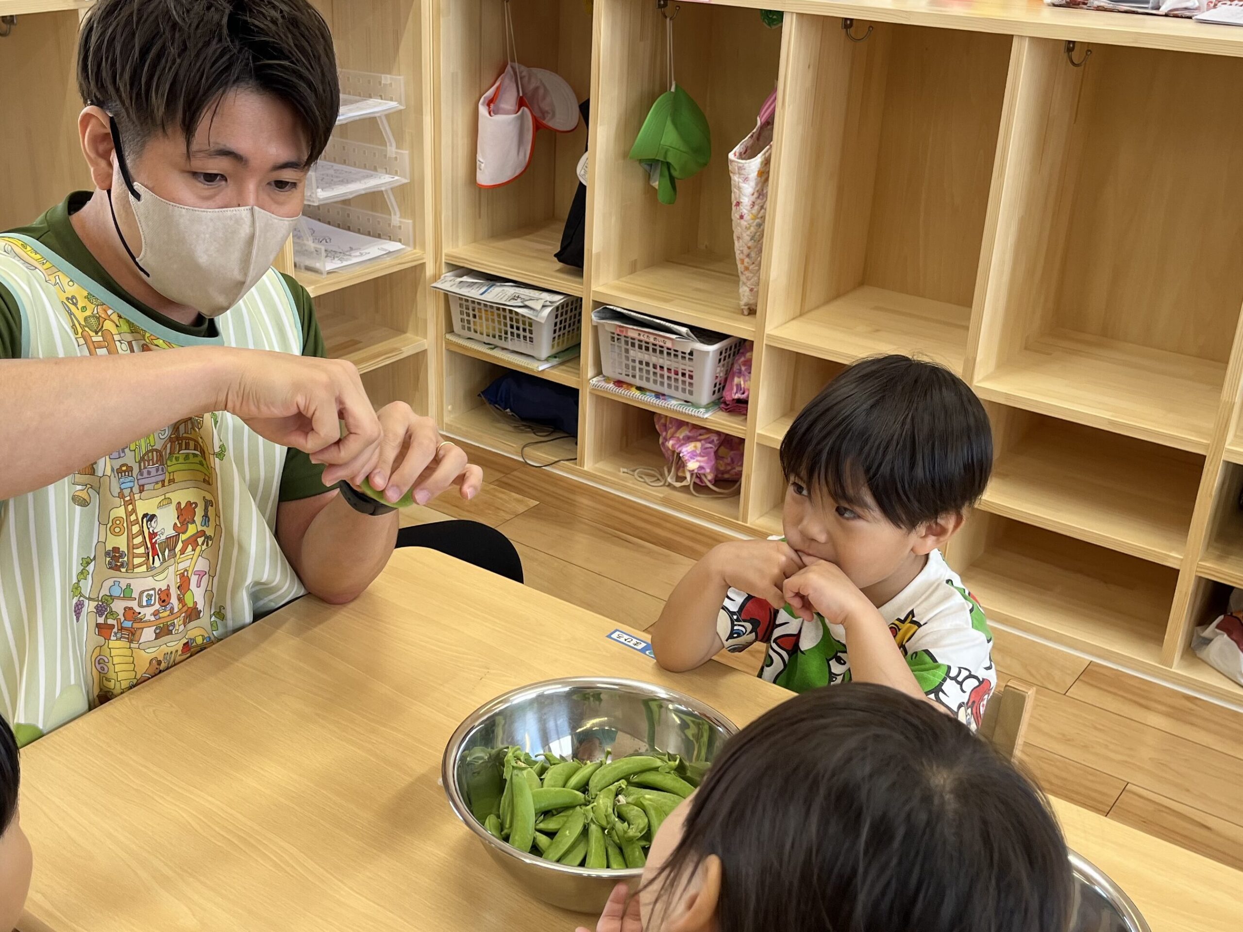 興味が持てればとスナップエンドウの、すじ取りお手伝いをしました。