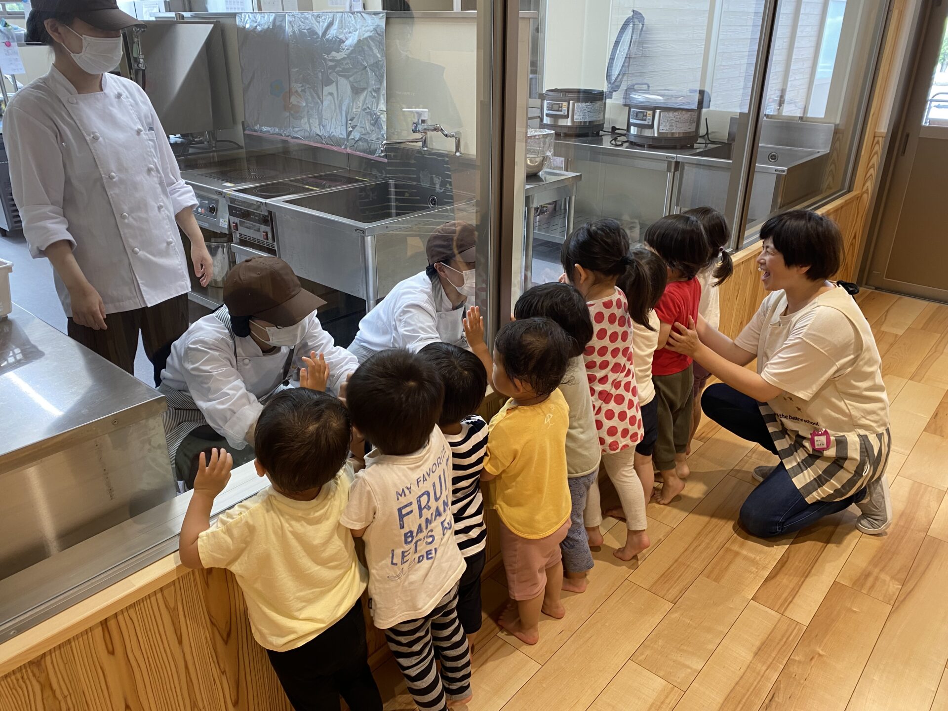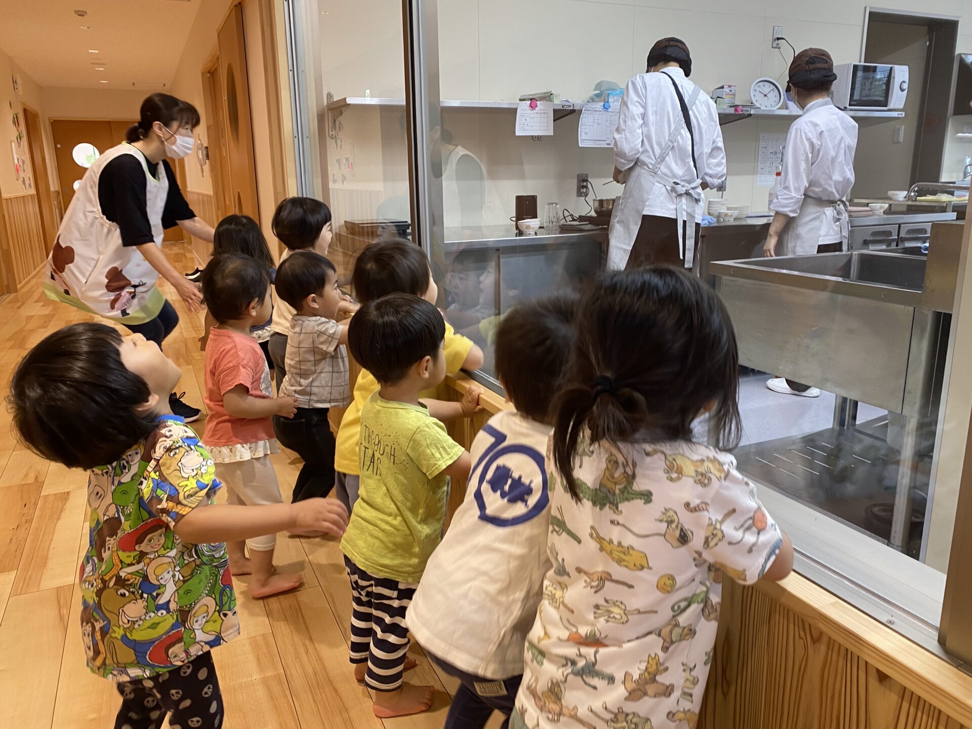 調理員さんに「がんばれ~!」と熱い声援を送ったり「きょうのごはんは、なに~??」と話したり、興味津々な、にじぐみさんです。