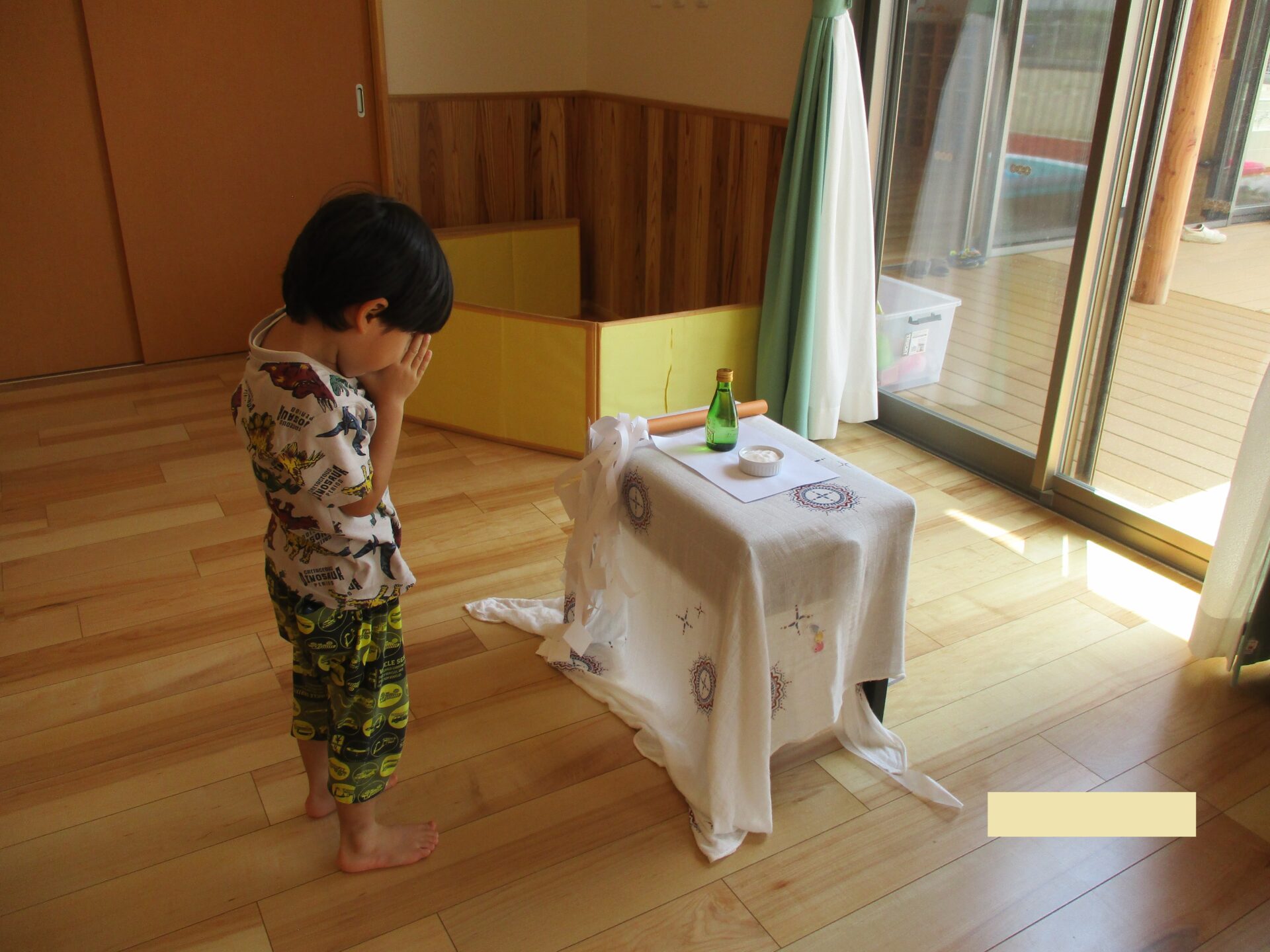 神主さんが退場後、自らお参りに来てくれたそら組(4歳児)のHくん。