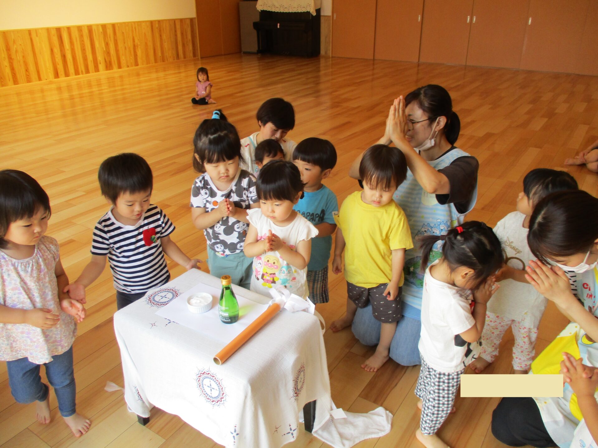 みんなが元気で怪我もなく水あそびを楽しめるよう、お祓いをしてもらいました。