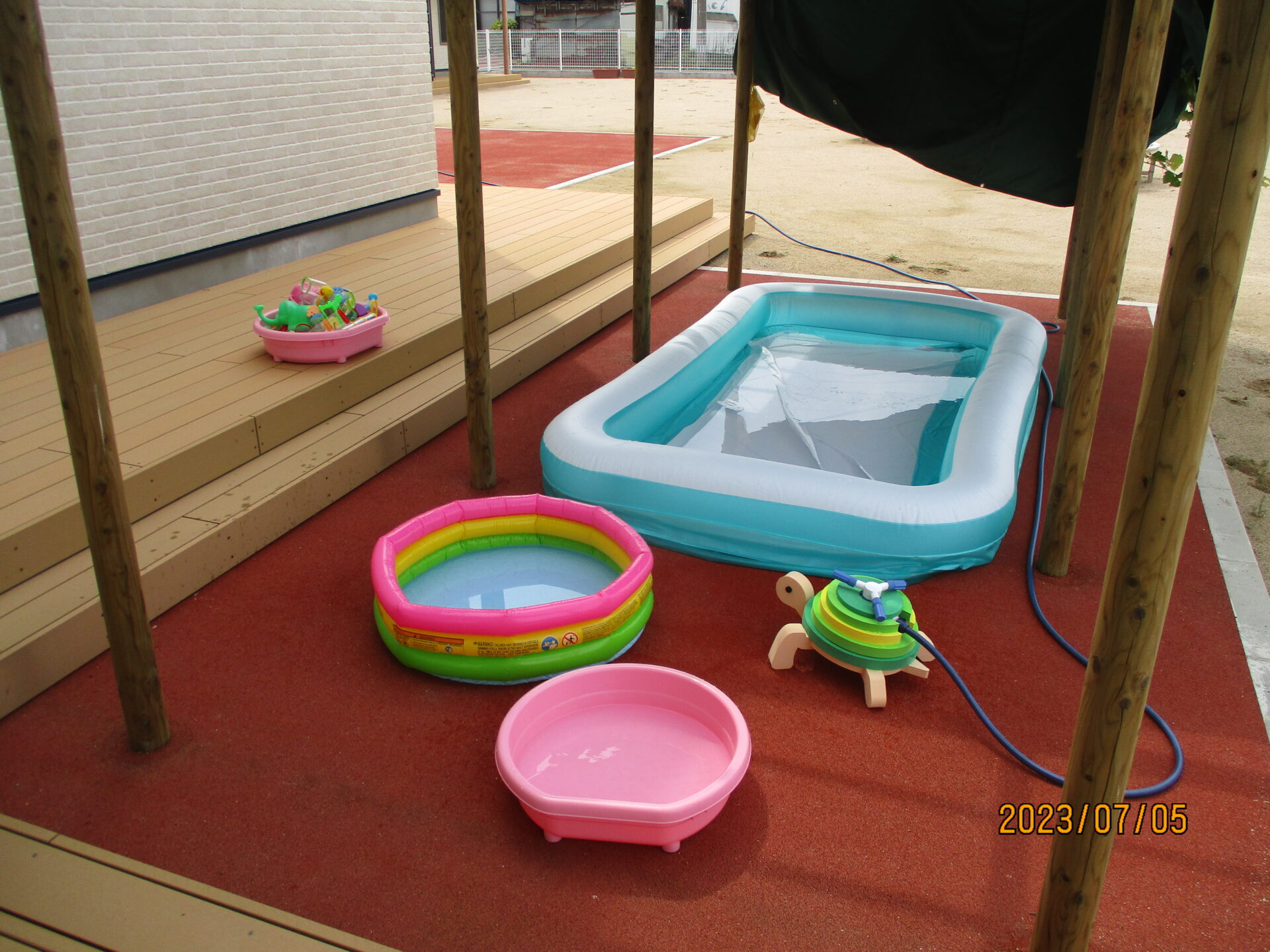 本日、えだまめこども園の園庭にも、巨大なプールがお目見えしました!!