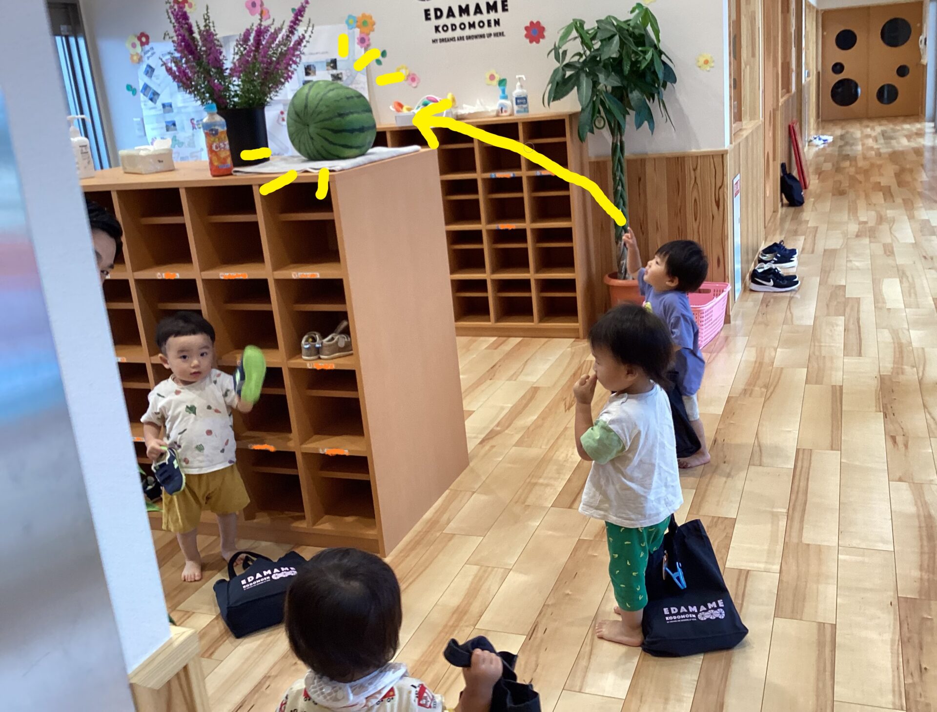 誕生会まで3日間、大玉スイカは展示されていました。玄関を通るたびに気になっていた子どもたちです。