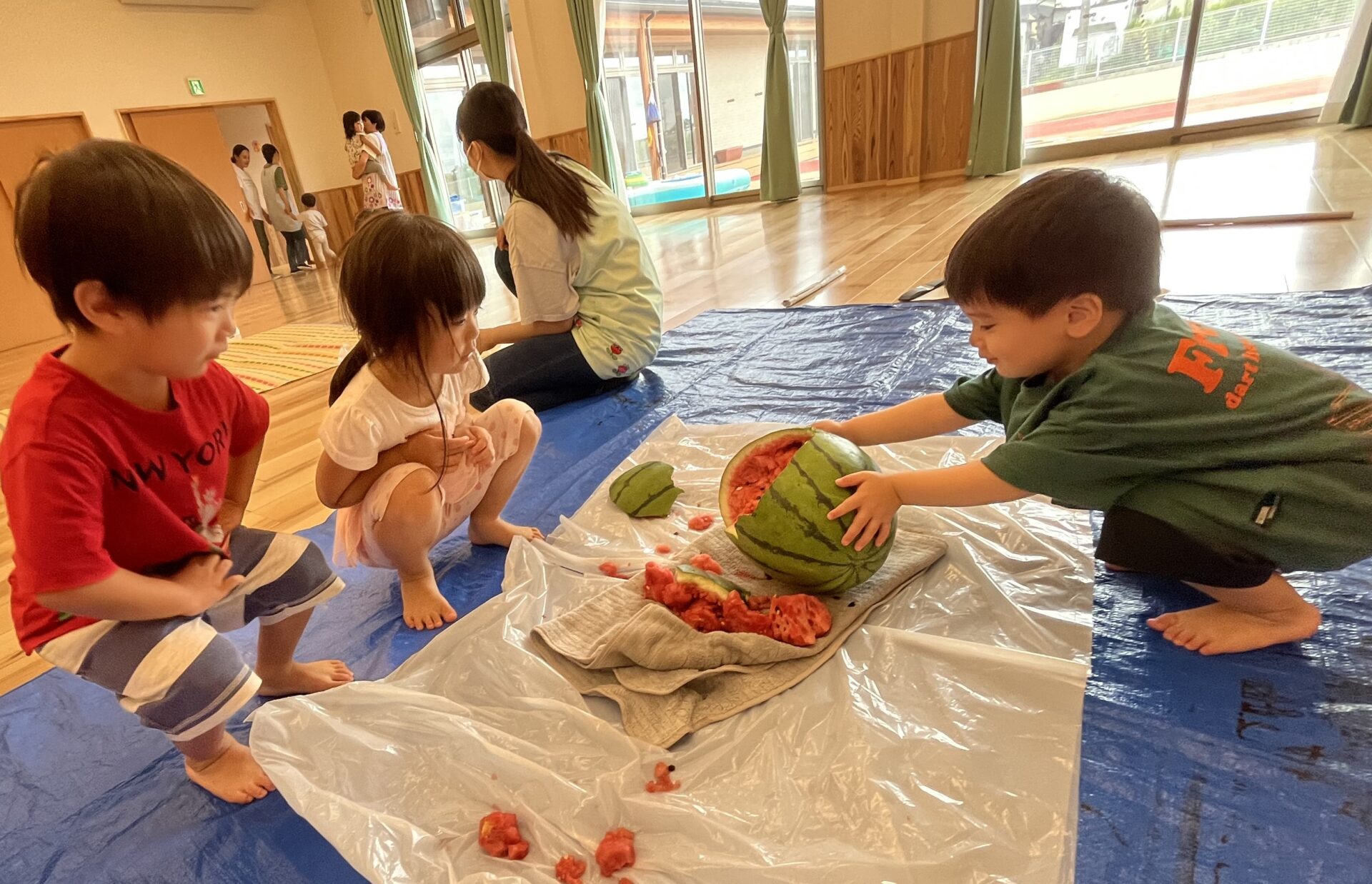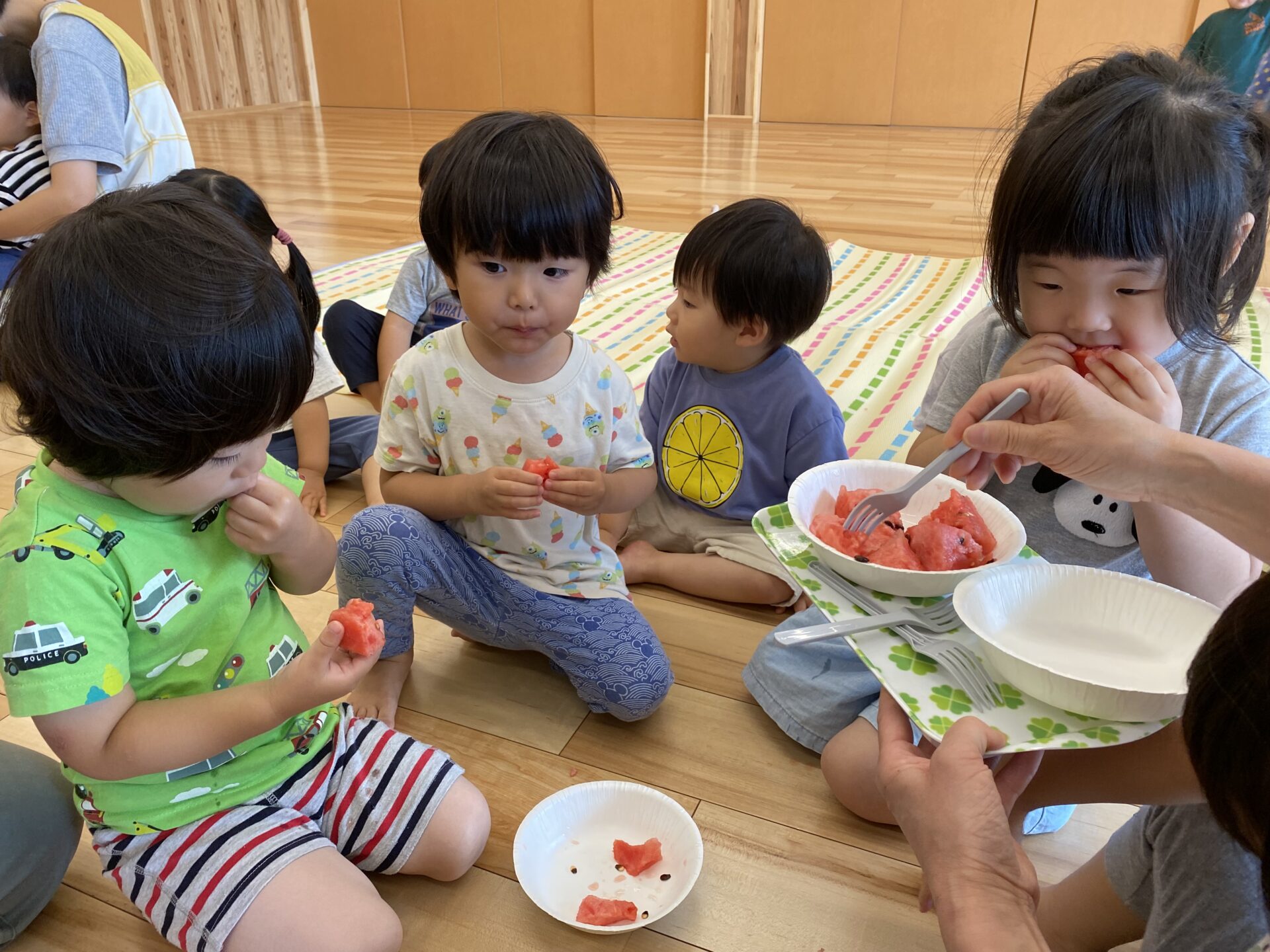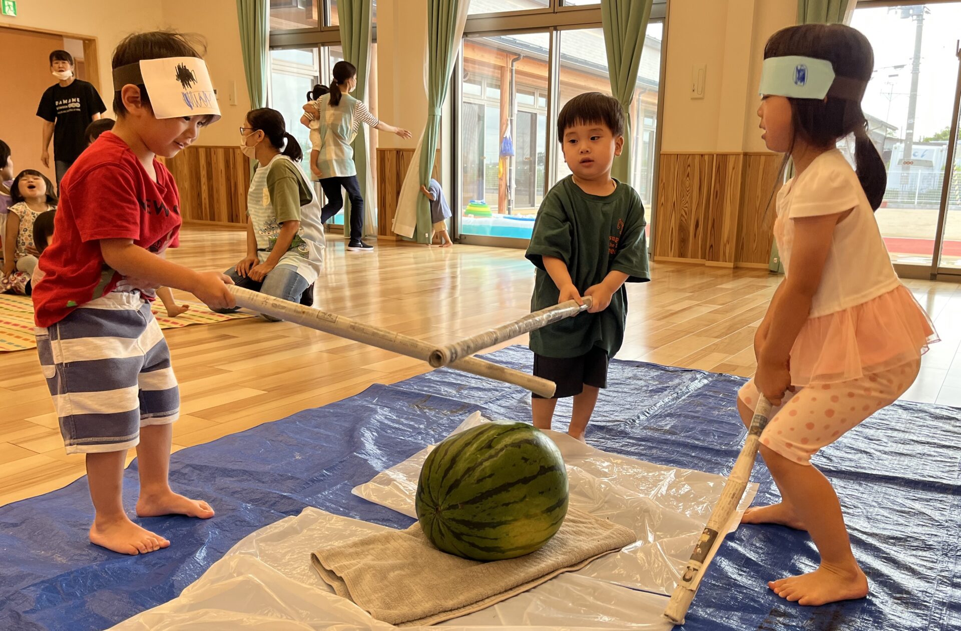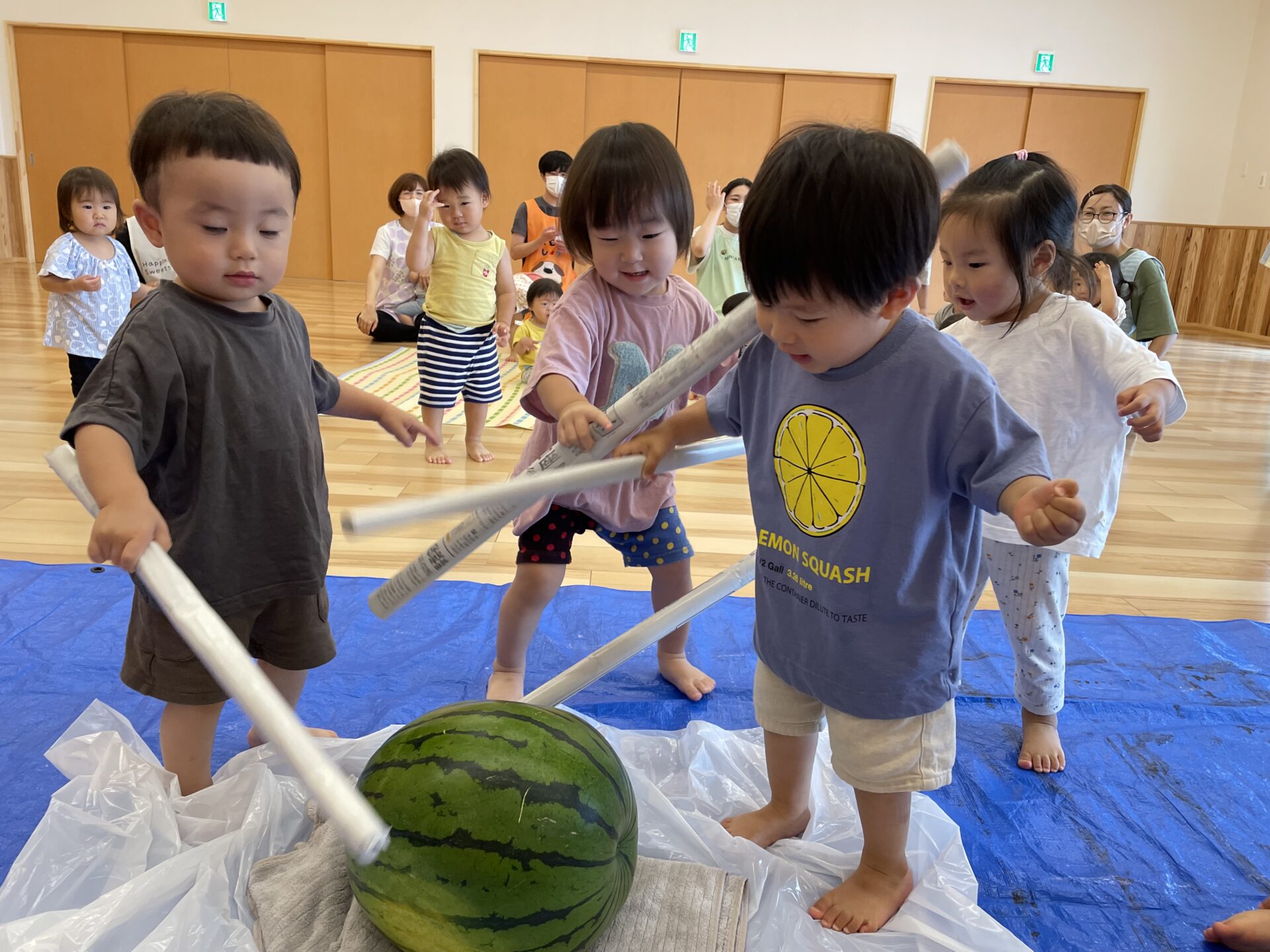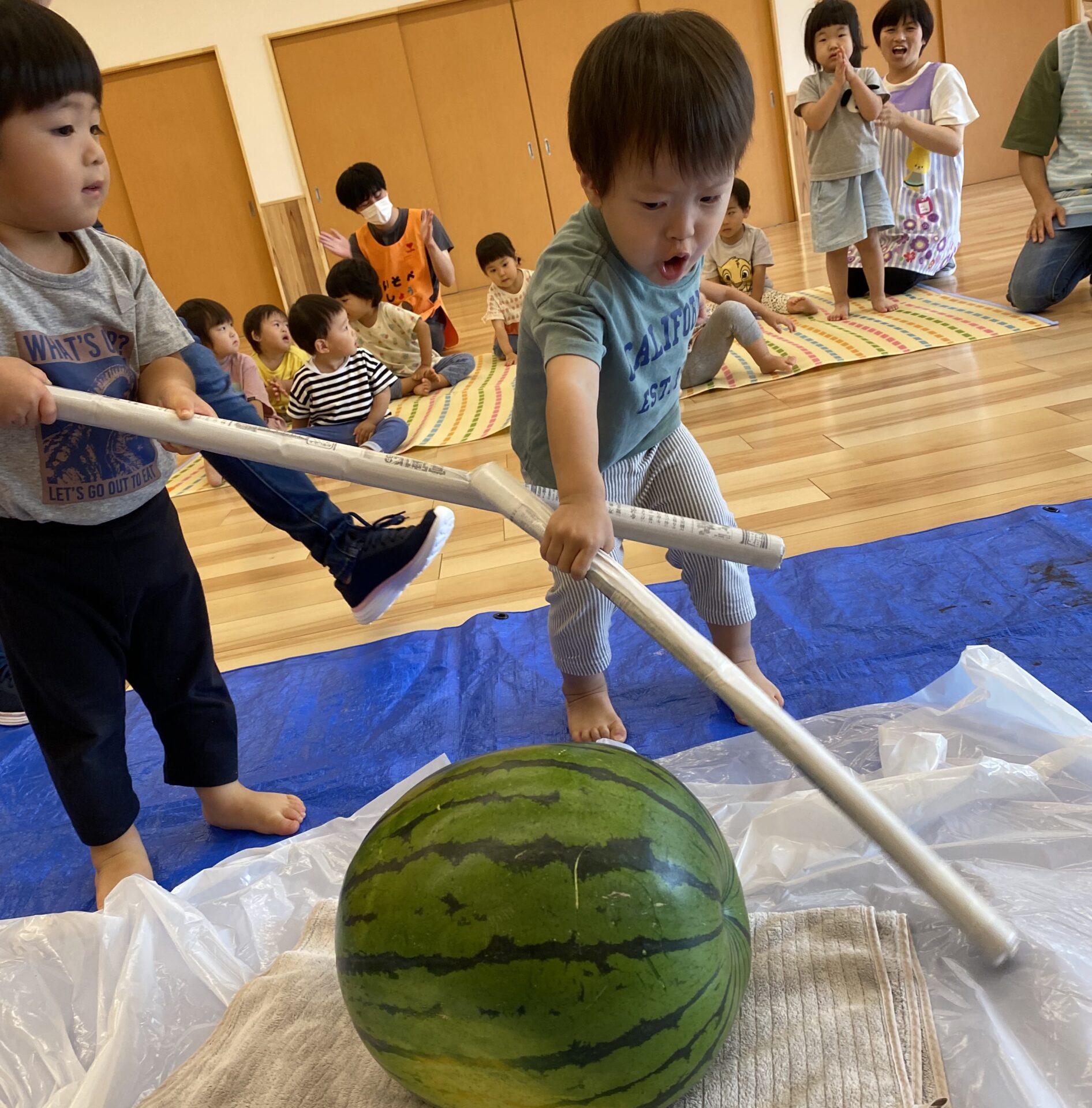 そして本日、7月誕生会「スイカ割り」始まりました。