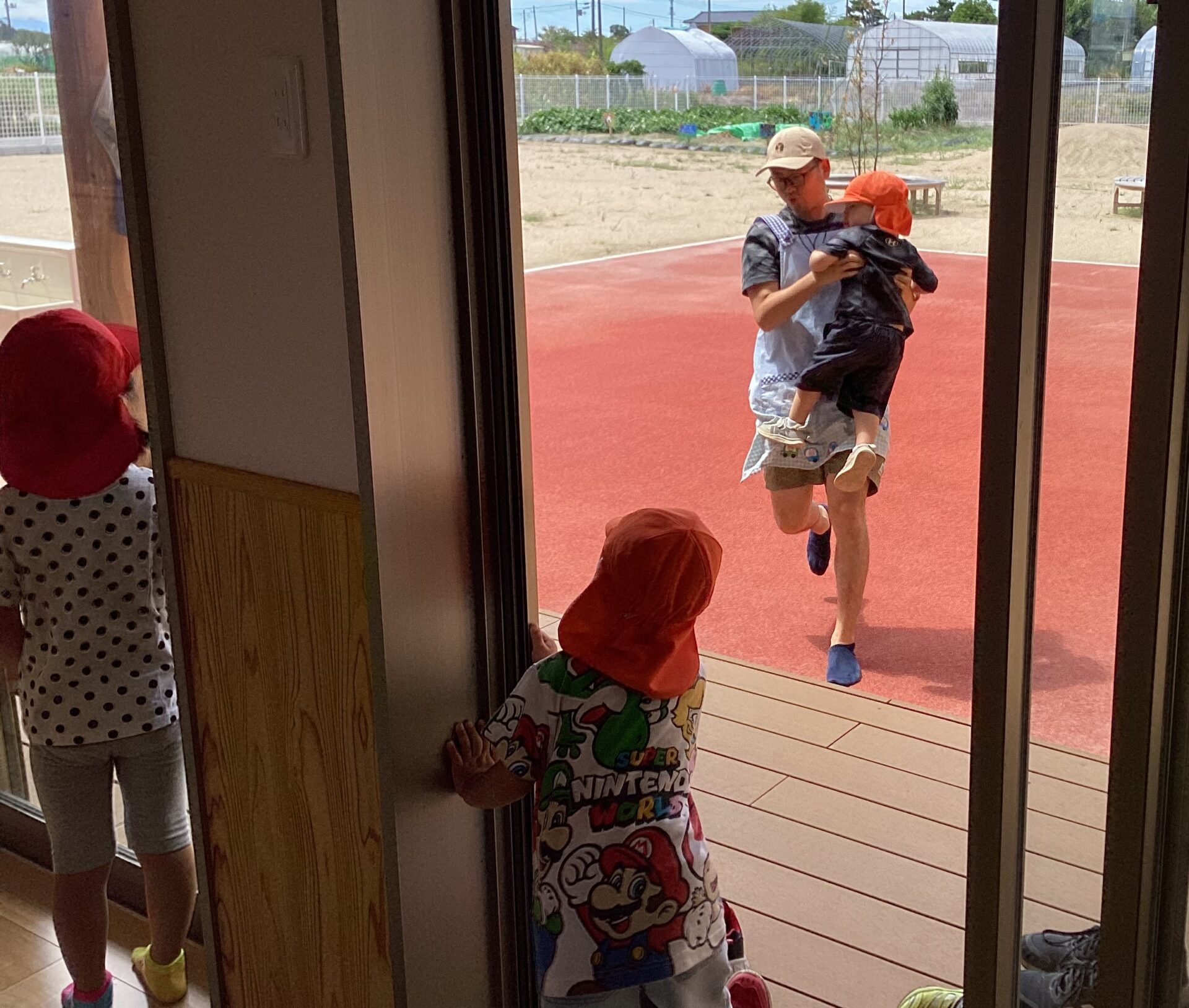 保育者は、子どもたちが怖がらないように、園舎内へと誘導します。