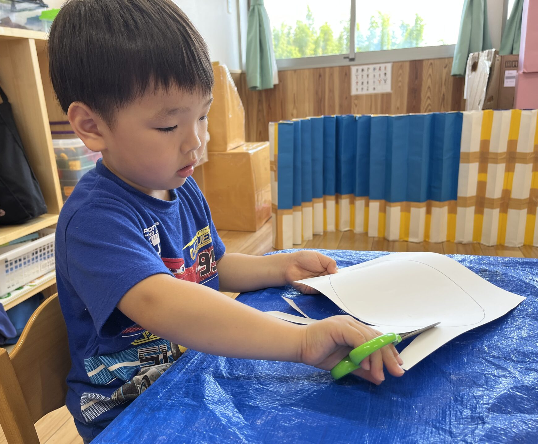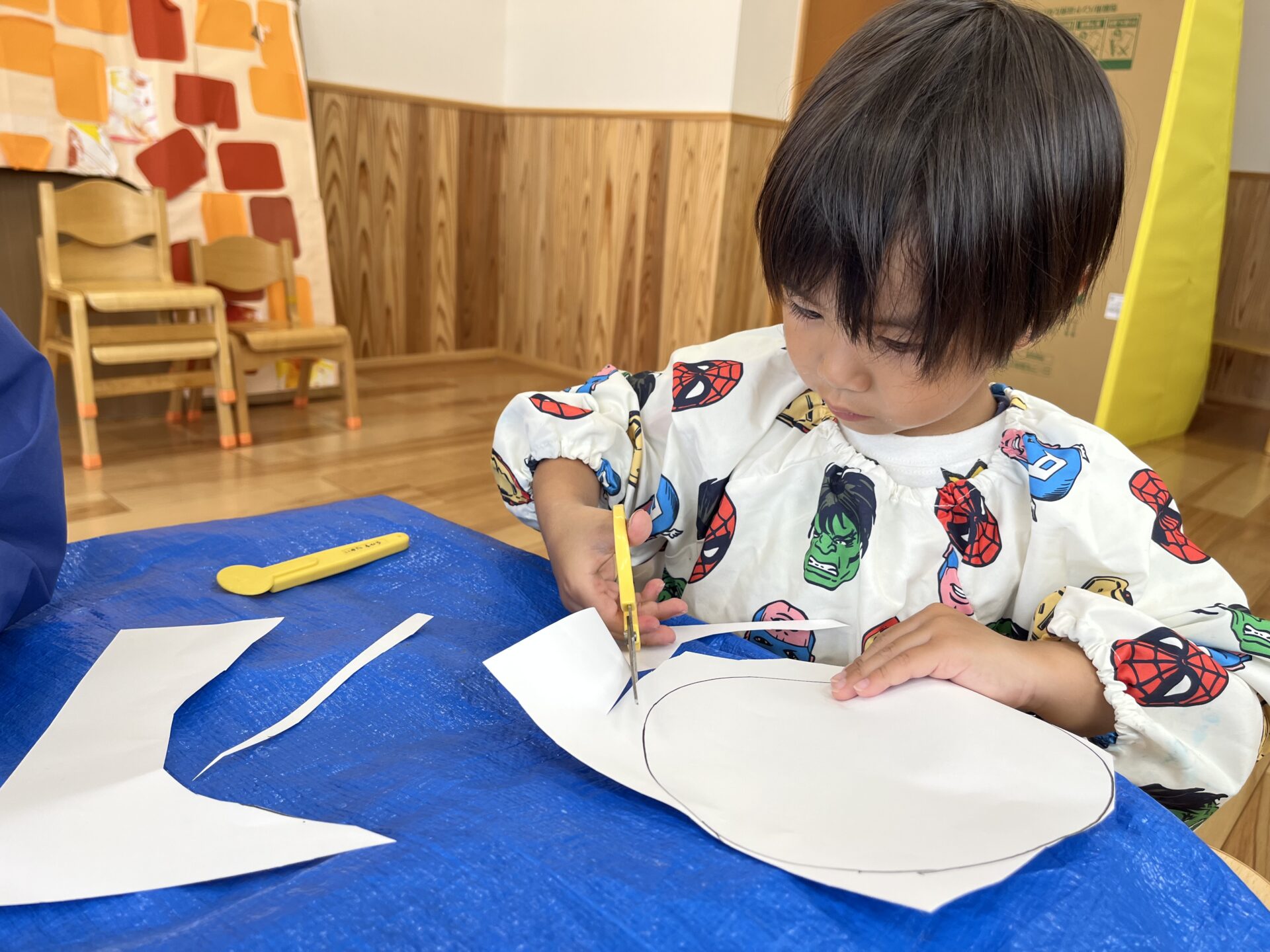 ハサミを使って、線の上を切っていきます。「ちょっとむずかしいなぁ・・」