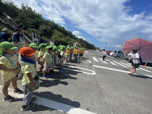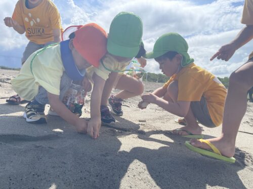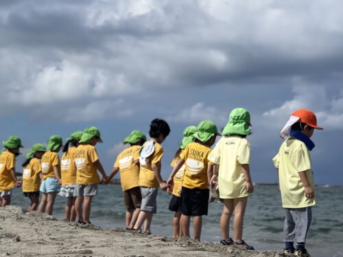 今日は、すいか保育園、おむすびこども園のお友だちと「碧(あお)い海」へ、
