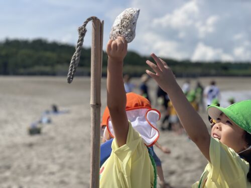 「貝殻おっきい✨」「誰がこんなところに置いたのかな~?カラスじゃない?」