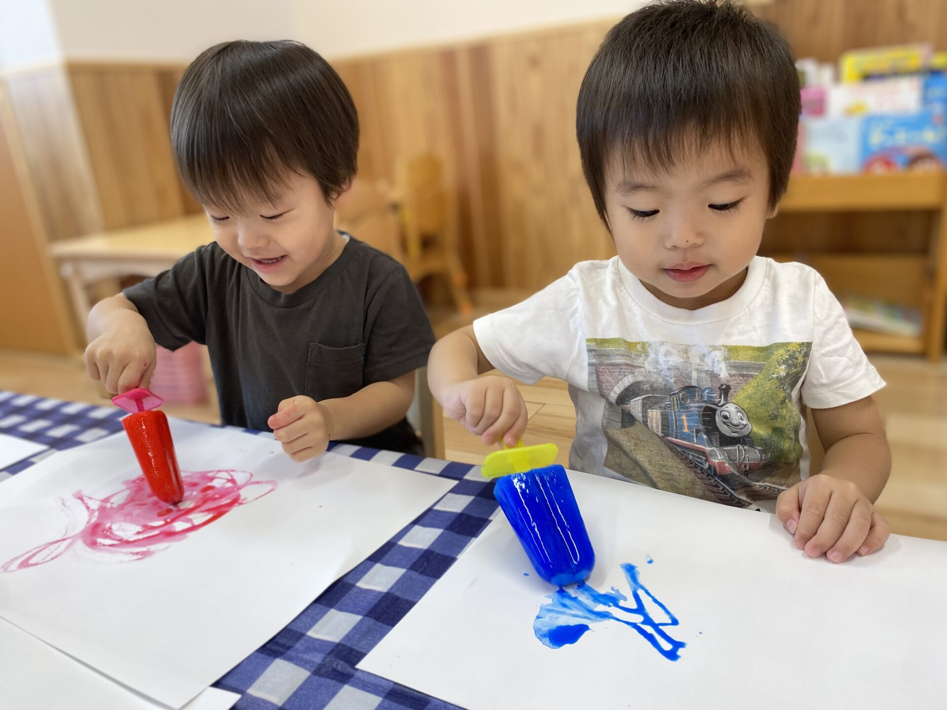 凍らせた色水での、お絵描きです。きれいなアイスの登場に、目がキラキラしてしまいました🍧