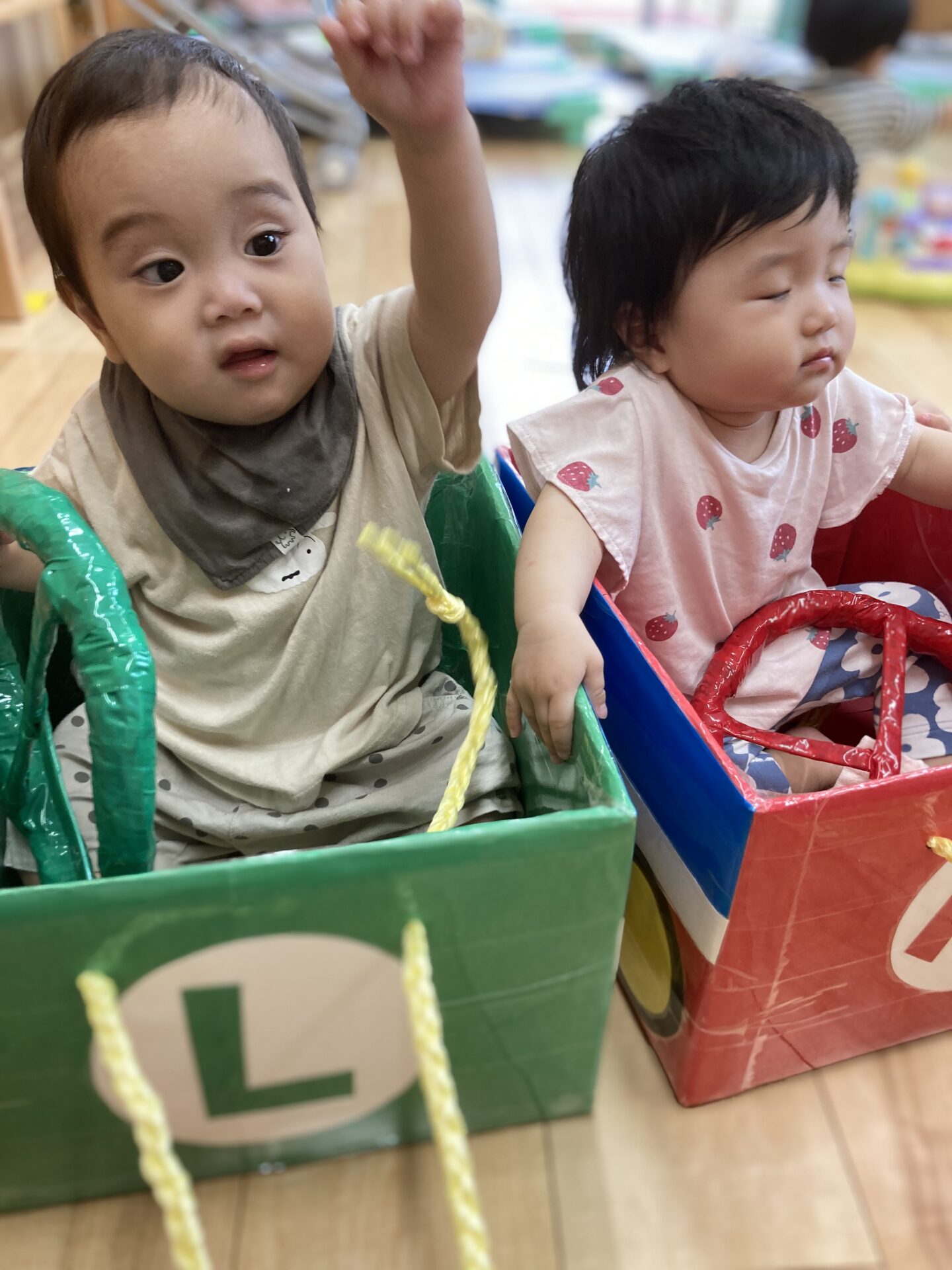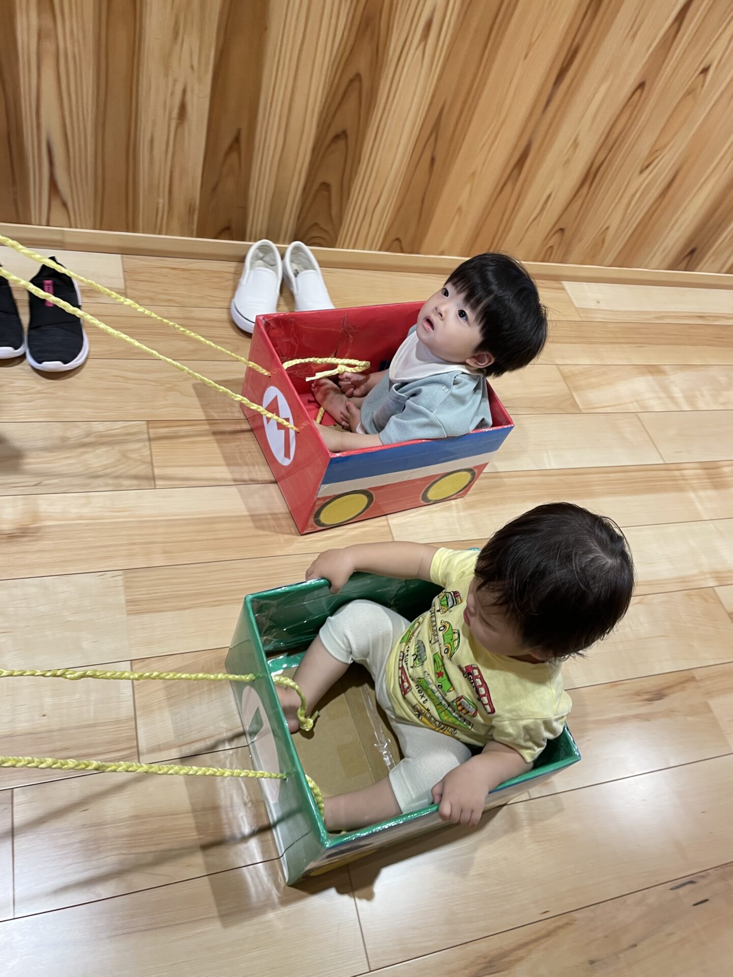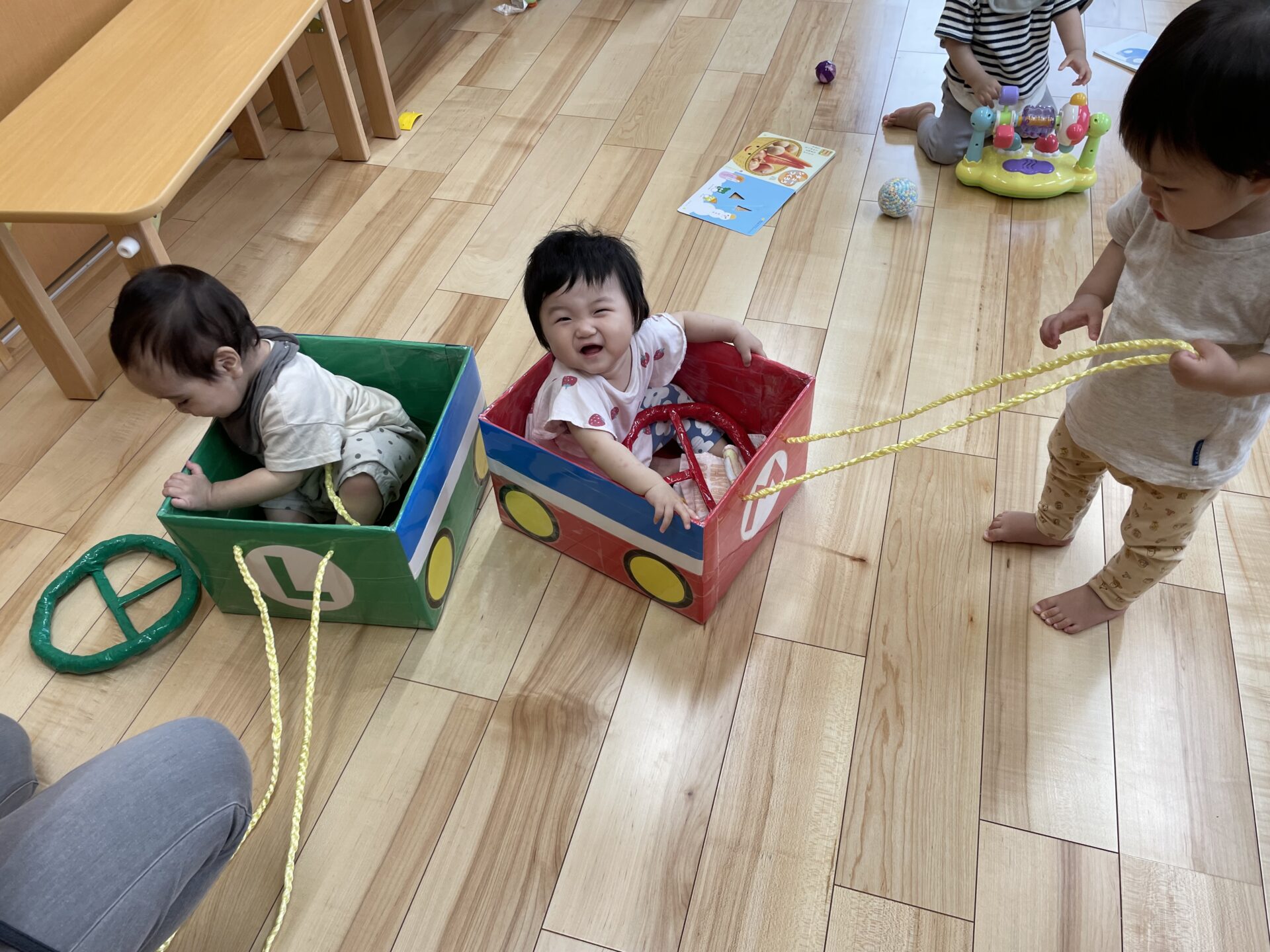 中には、お友だちが乗っている車の紐を引っ張って、動かしてくれるお友だちもいます😊