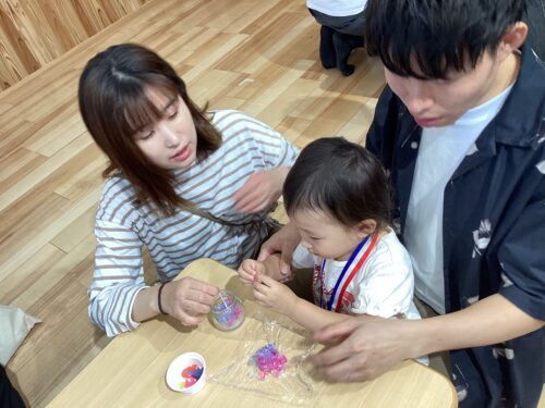 3、4歳児の親子競技は「えだまめ隊・心を燃やせ!」