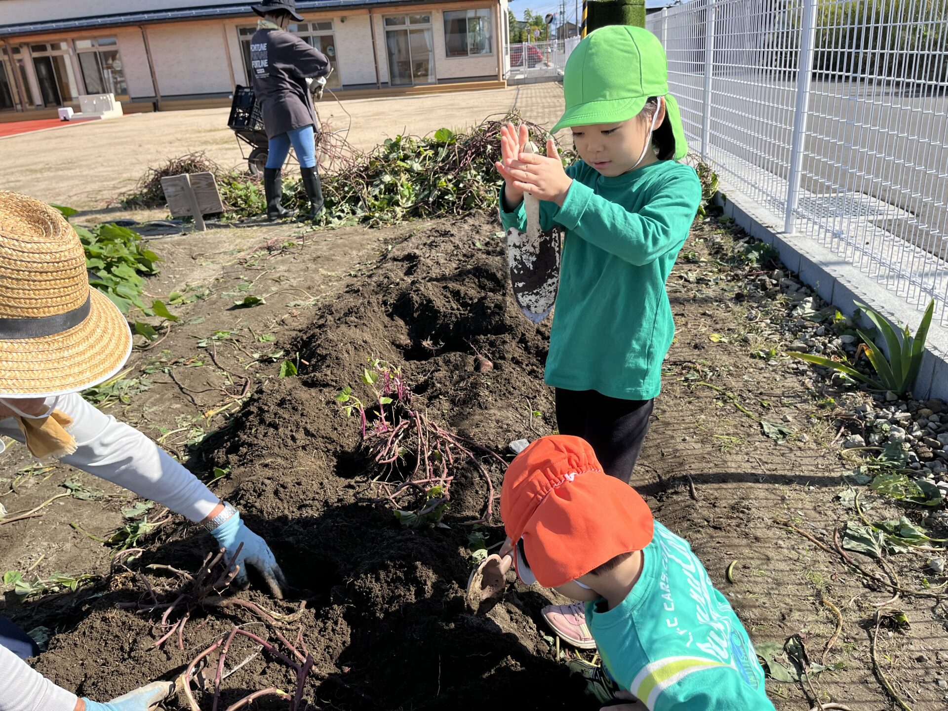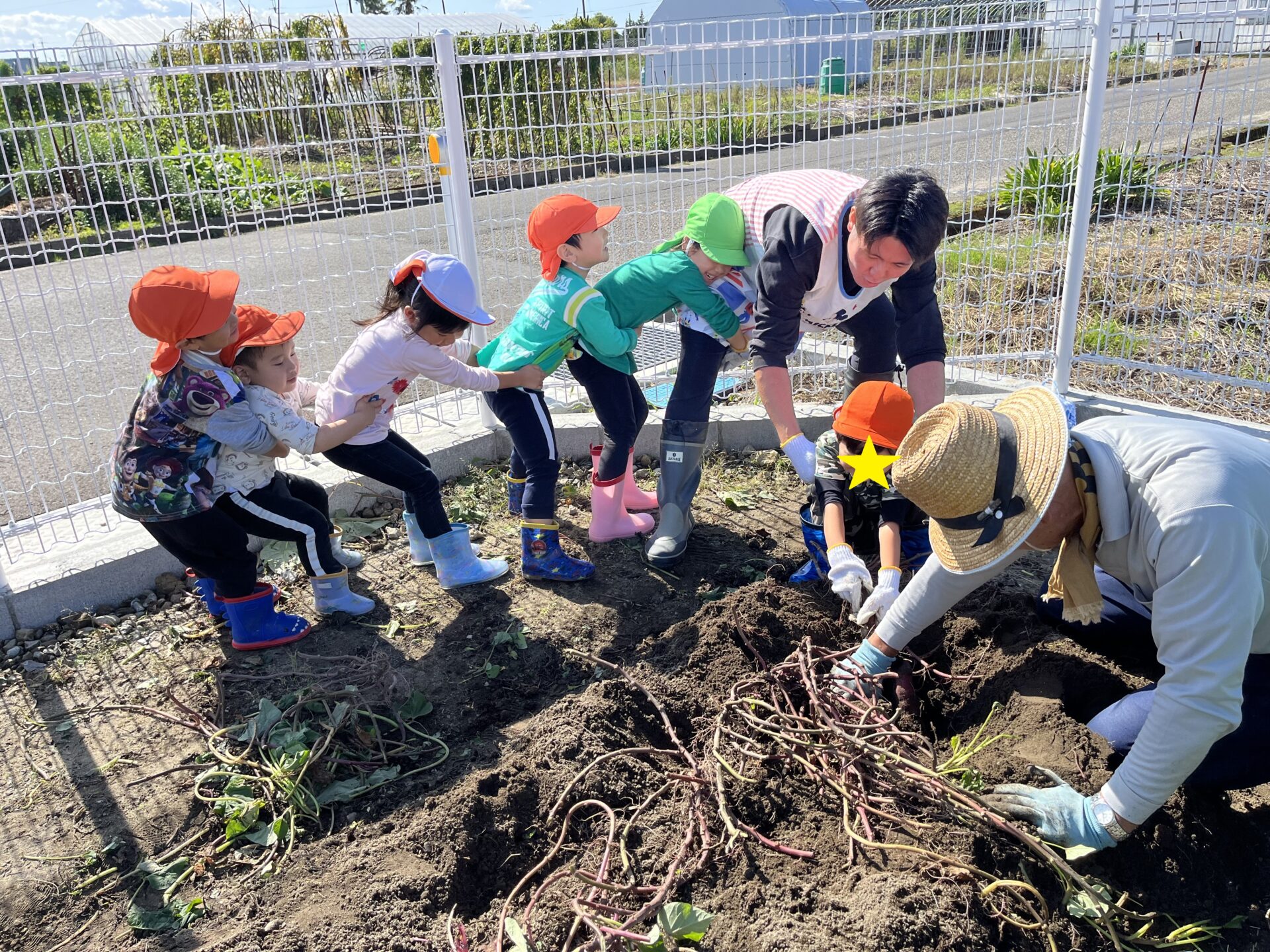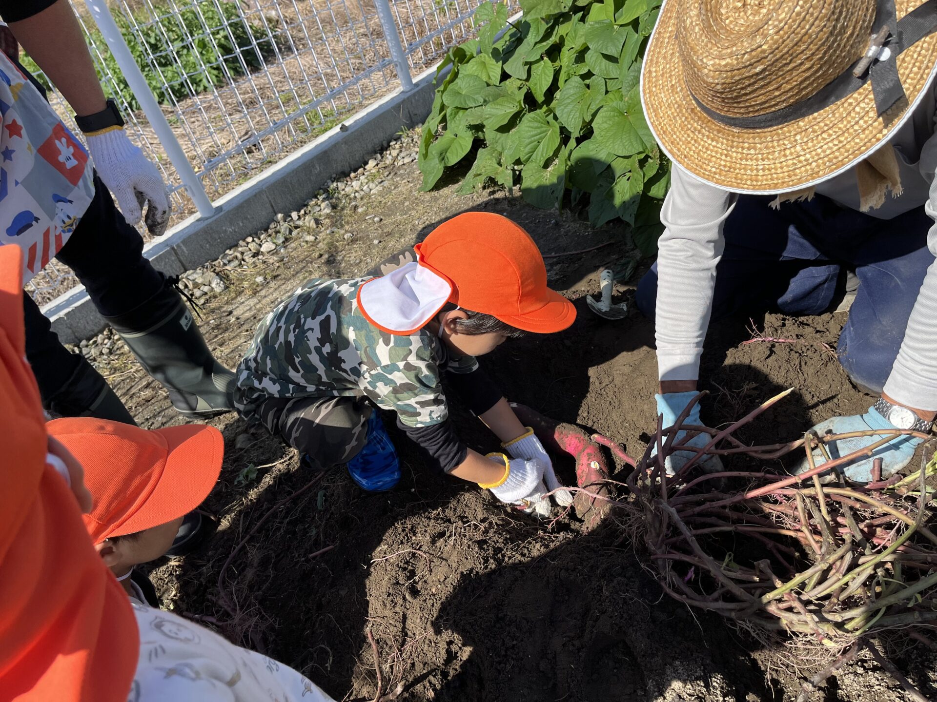 「とれた!」と、あっという間に抜けるおいももあれば、「んーかたい~!抜けない~!」となかなか抜けないおいももあり、「うんとこしょ!どっこいしょ!」と、力を合わせて頑張りました!