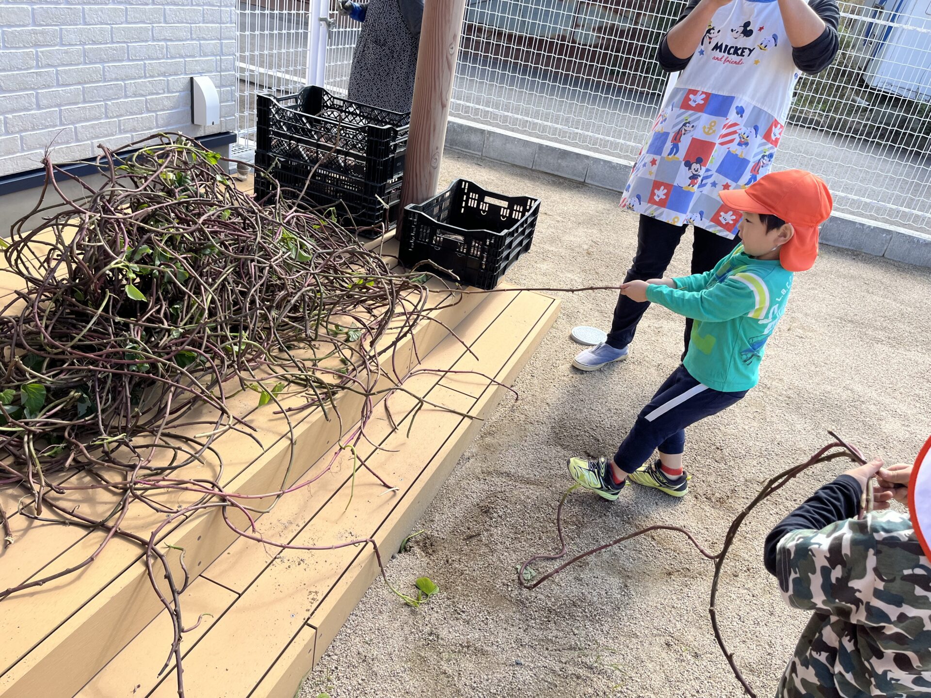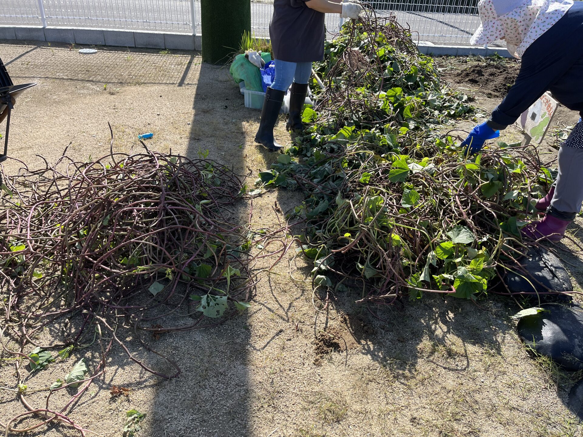 葉っぱやツルを片付けて、おいもが堀りやすいようにお手伝いしていました。
