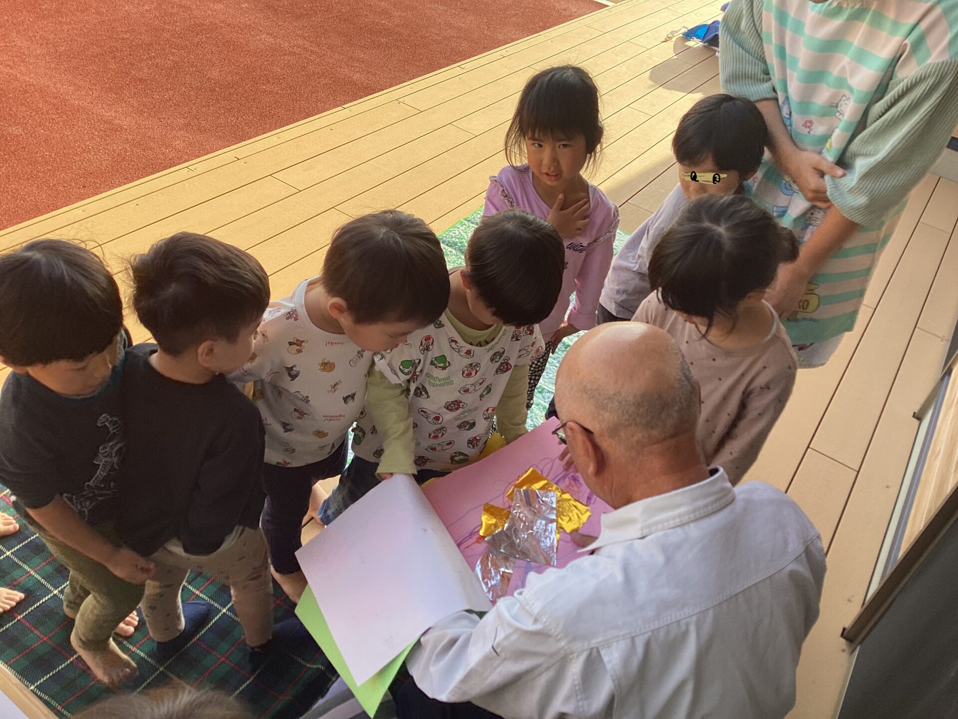 お礼の言葉と絵のプレゼント!1枚1枚、説明をしていた3・4歳児でした。