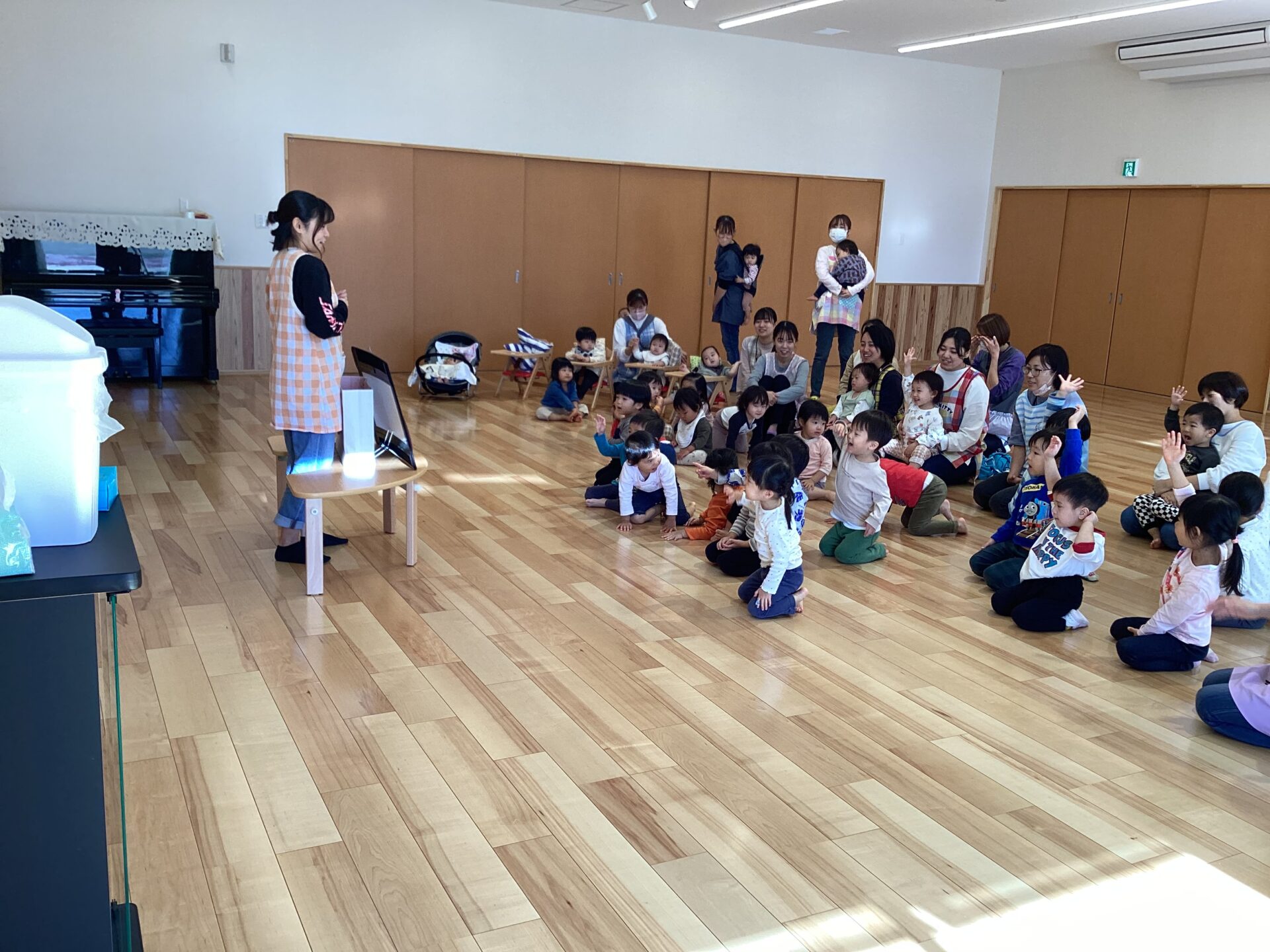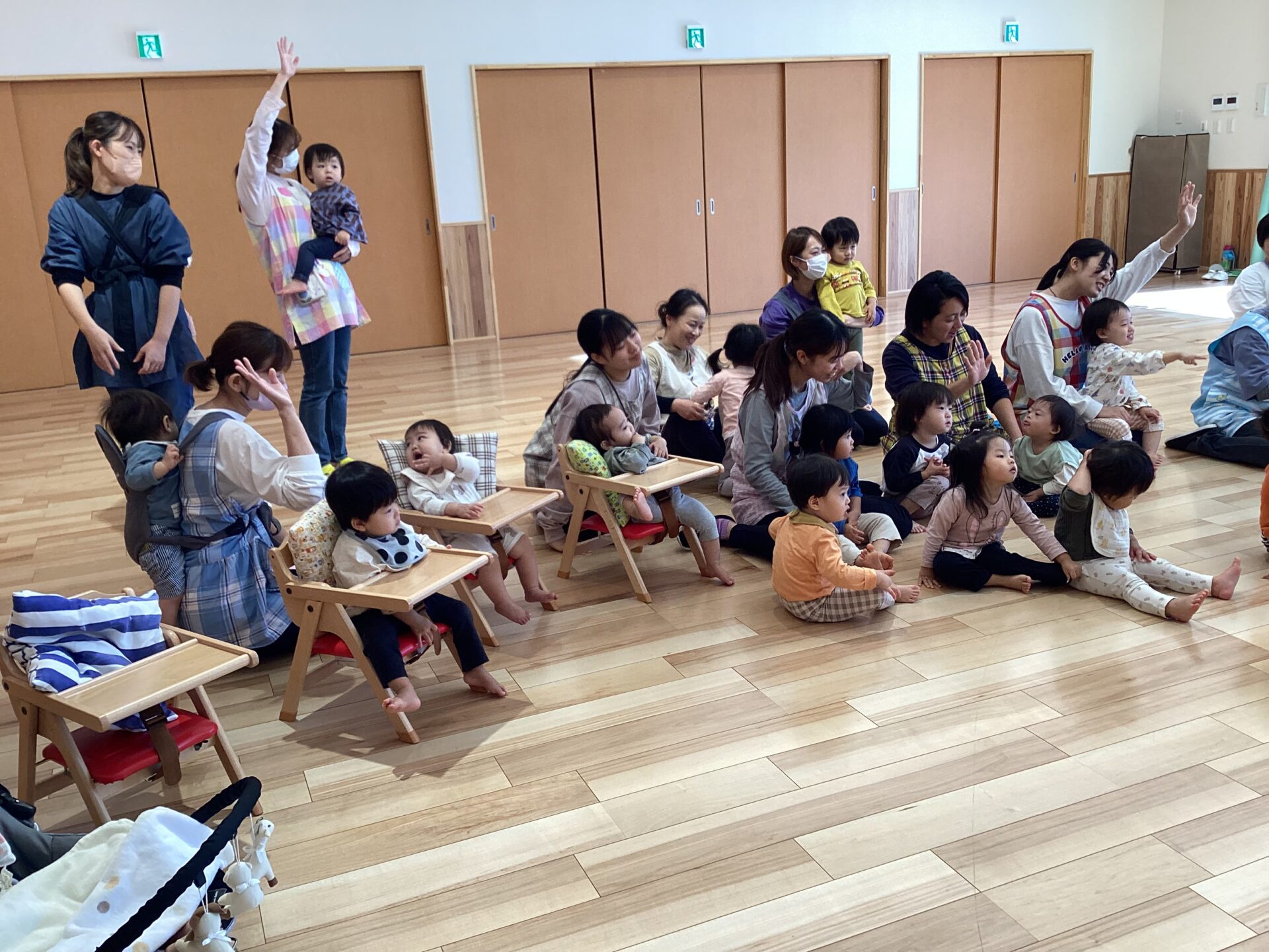 保育者の問いかけに、手を挙げて応える子どもたちです。