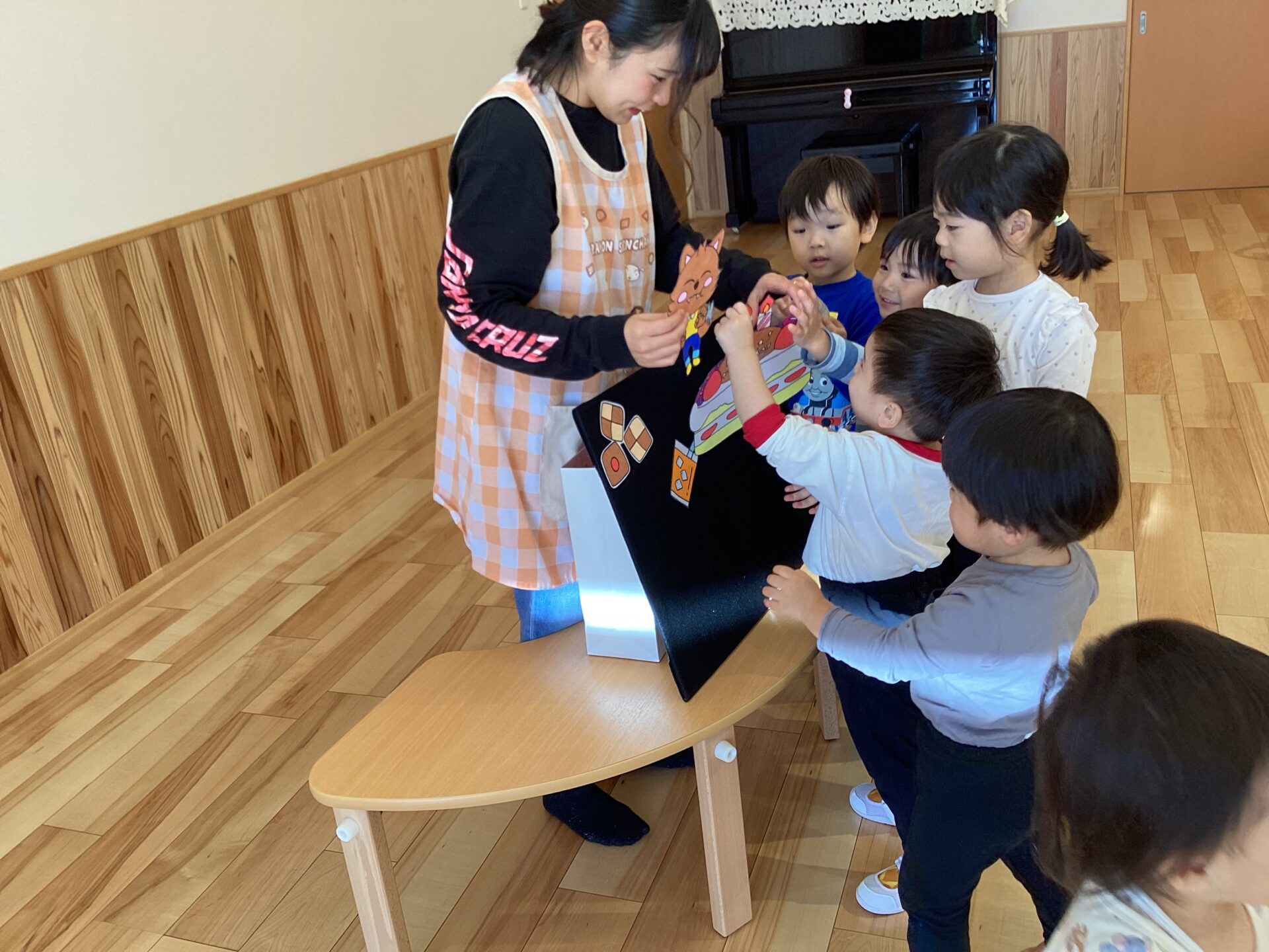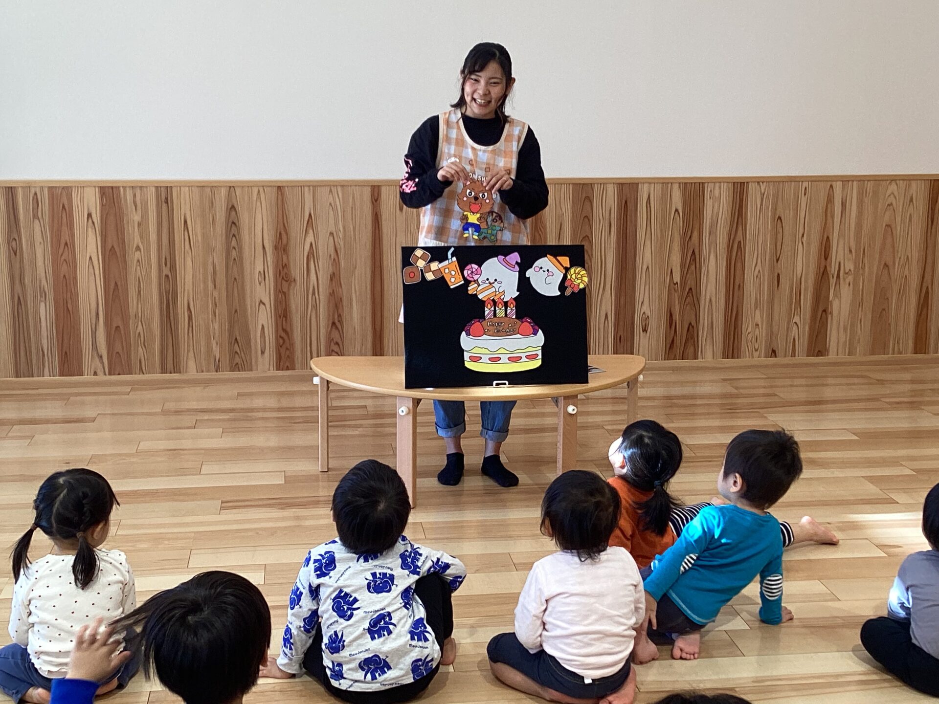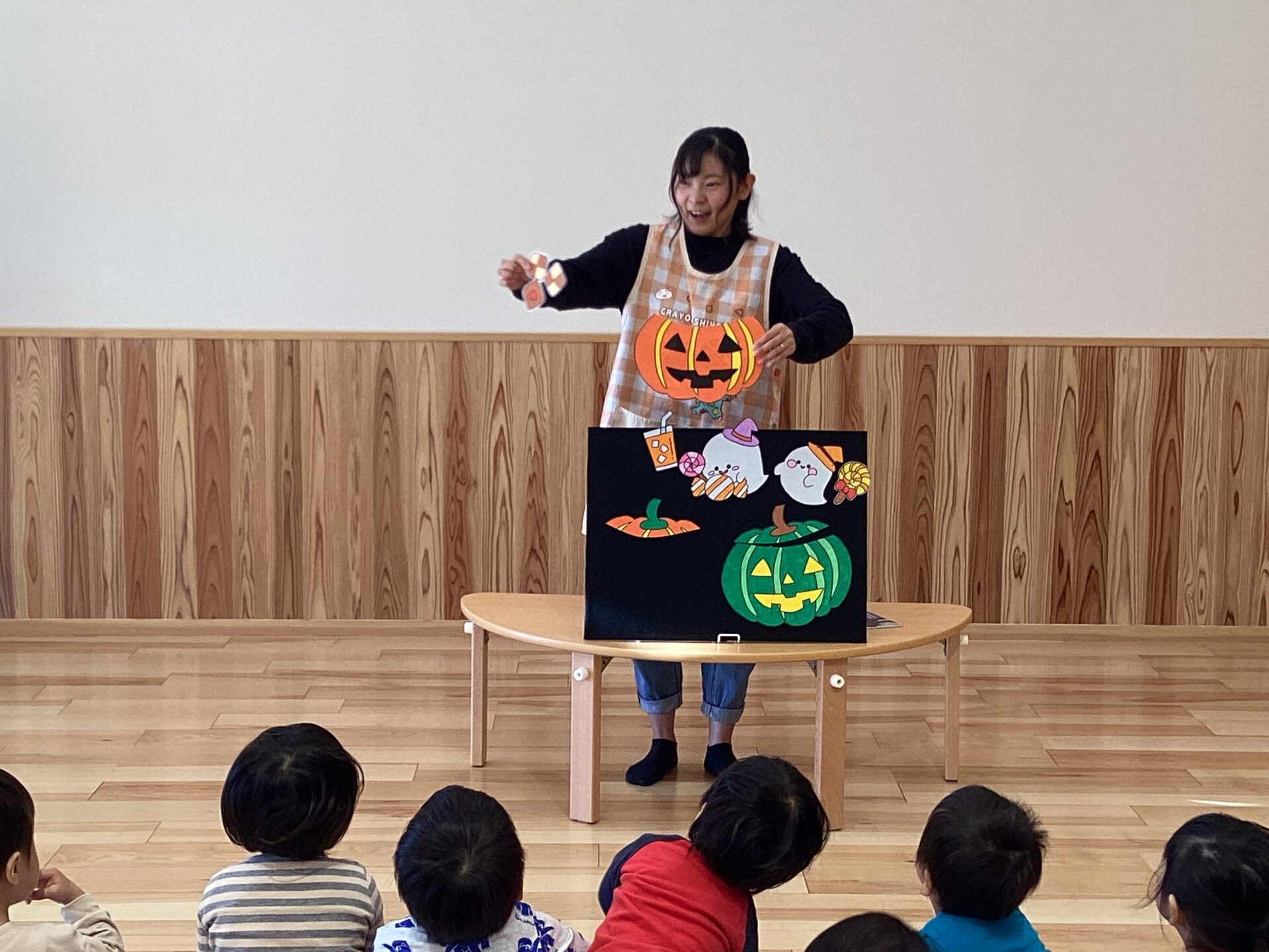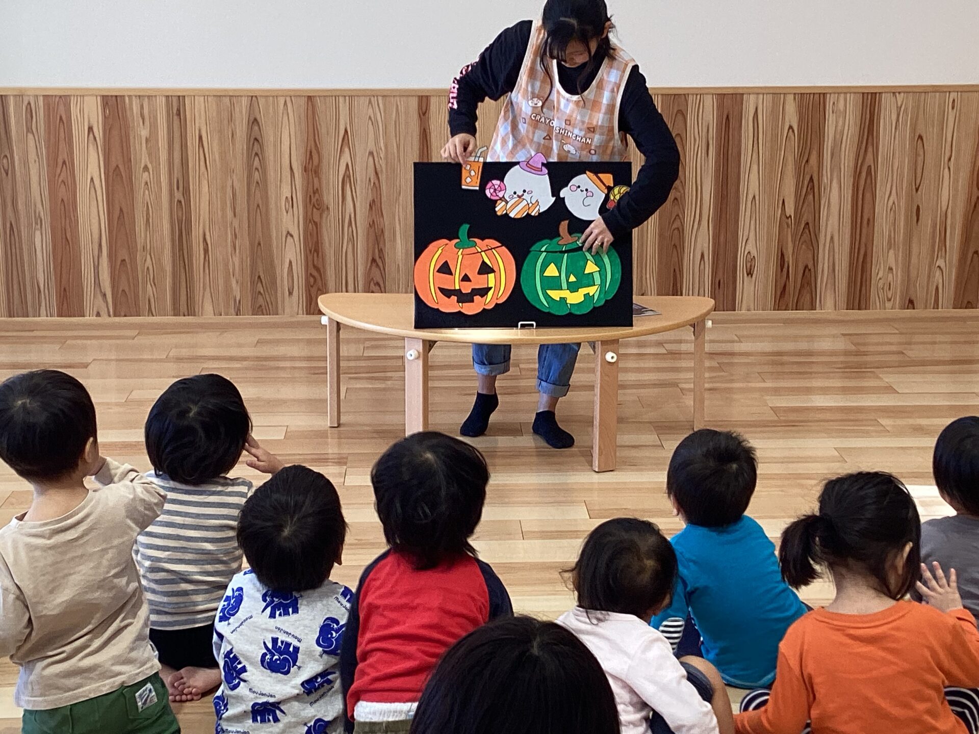 10月末にある、ハロウィンにちなんだお話のパネルシアターを、みんなで見ました。