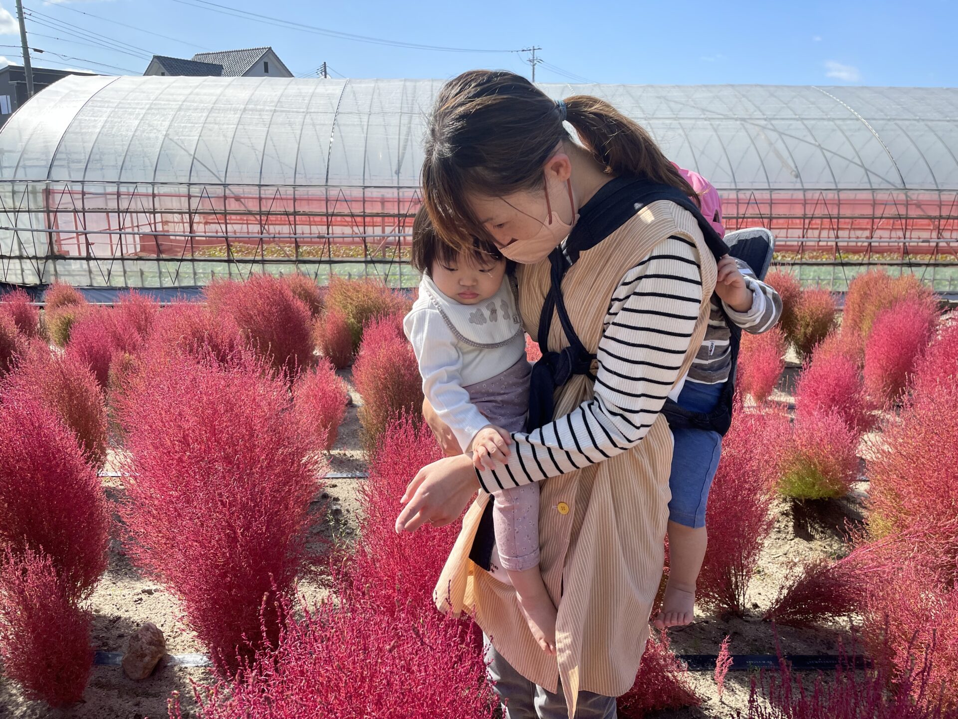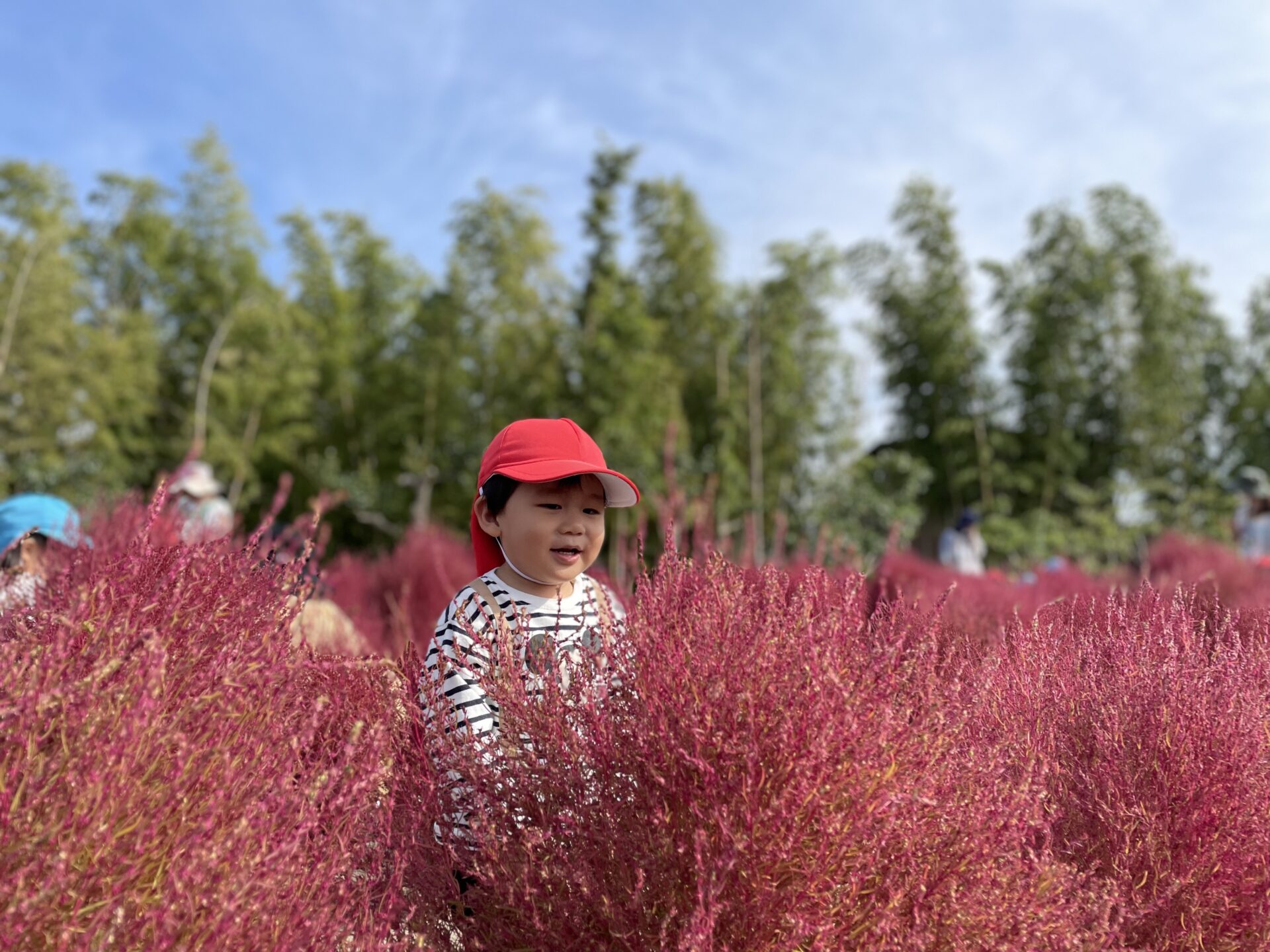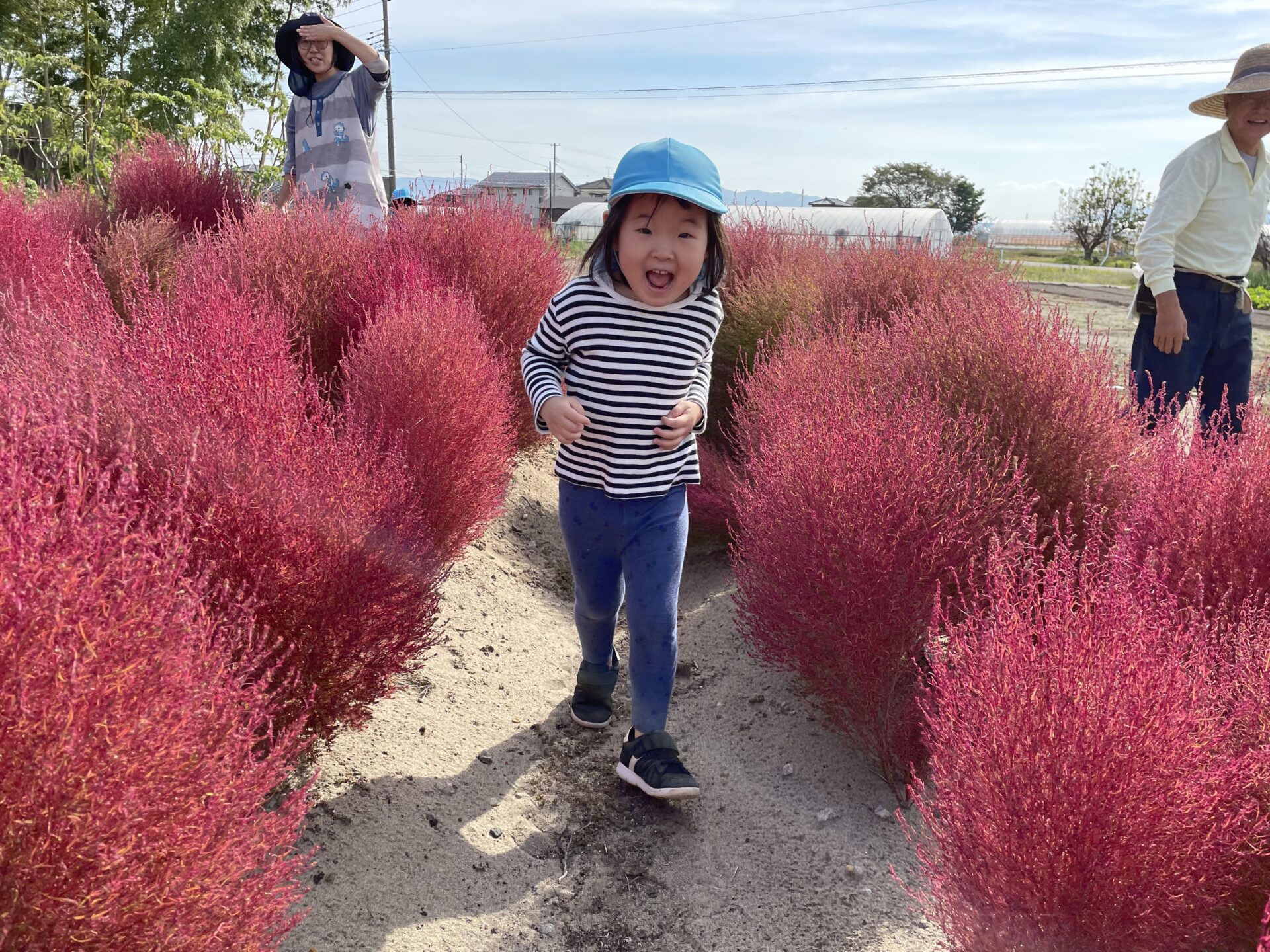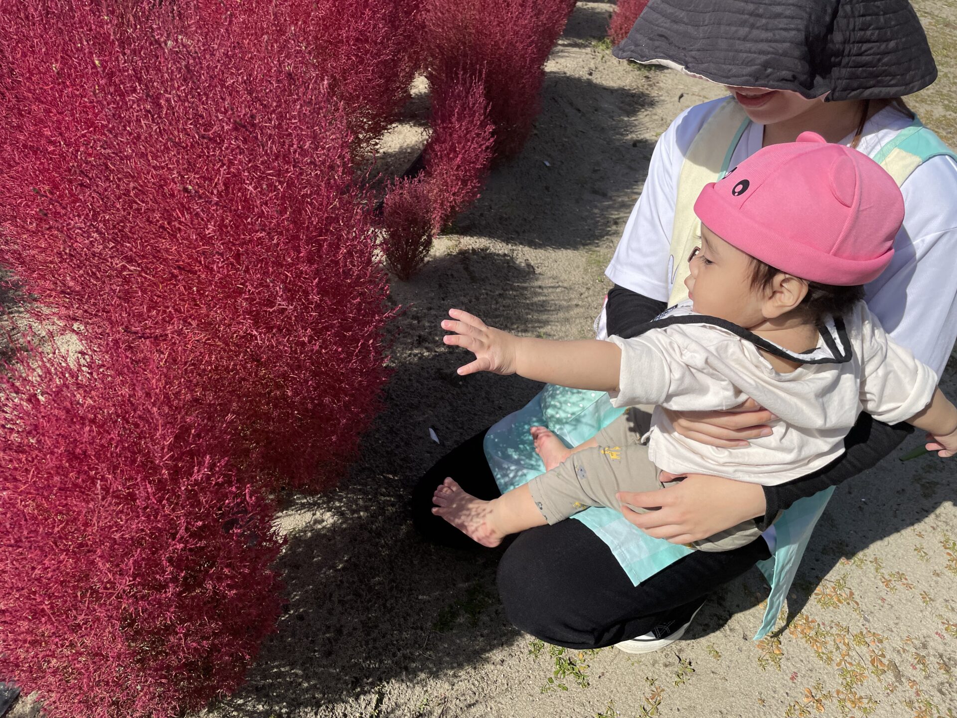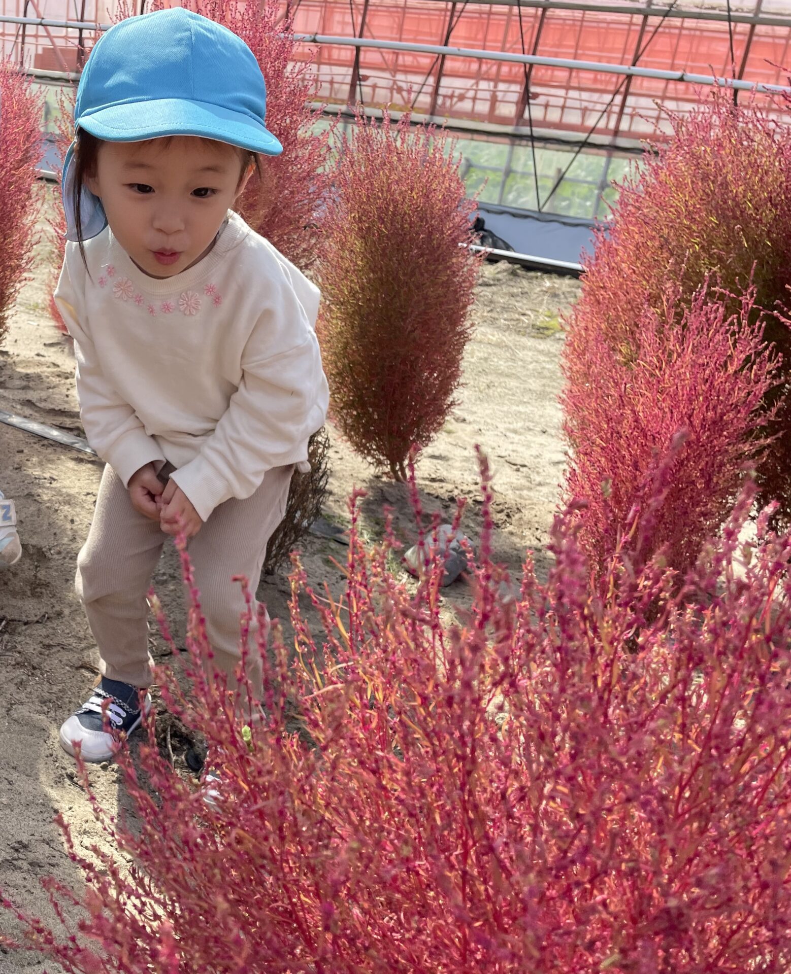 みどり色の時から見ていた子どもたちは、真っ赤に変身したコキアにビックリでした。