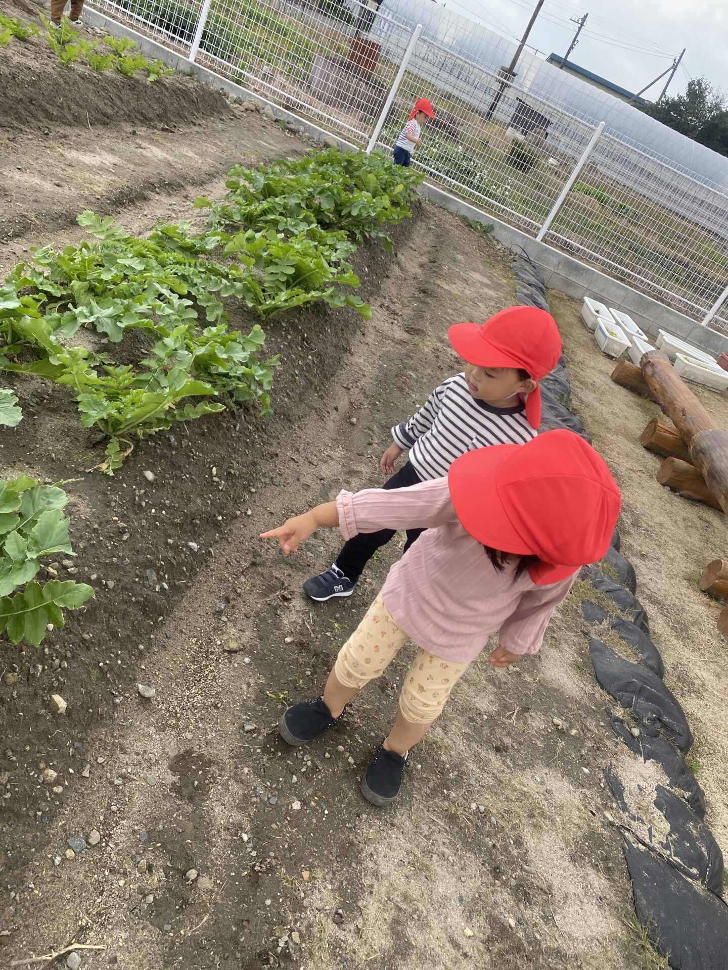 畑へ行くと、だいこんの成長に気付き、「葉っぱあった!」「大きいね~」