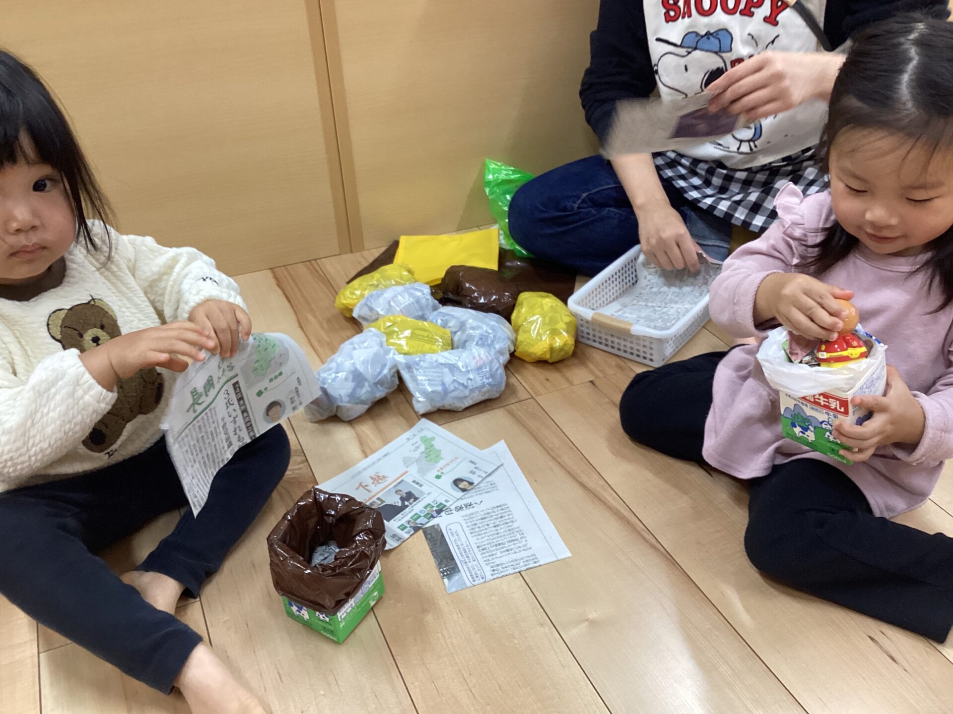 ぐしゃぐしゃっと、新聞紙をカラーポリ袋に詰め、お豆を作りました。