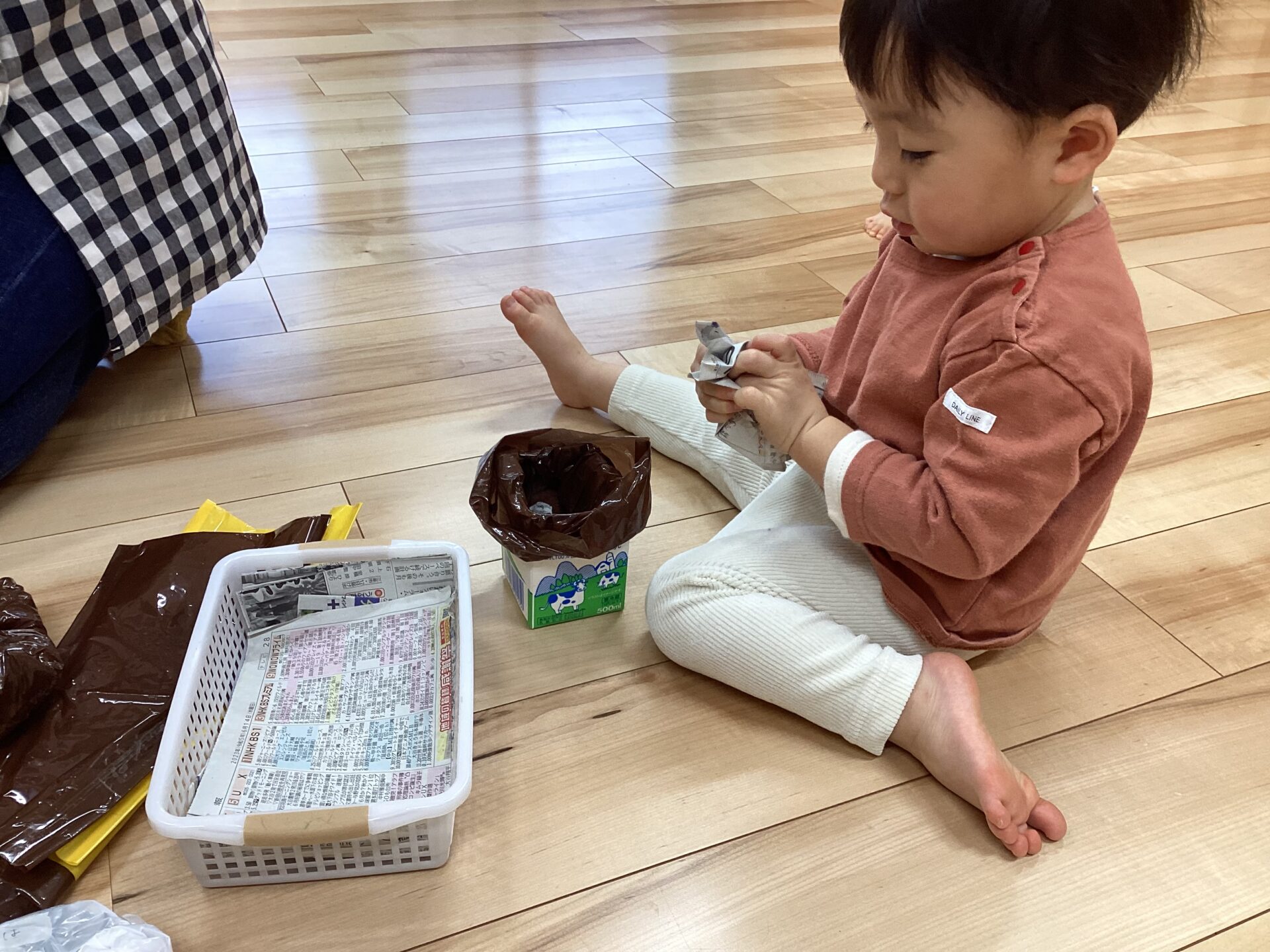 (自由に新聞紙をやぶったり、丸めたりすることは、手や指先の力を養うことにつながります)