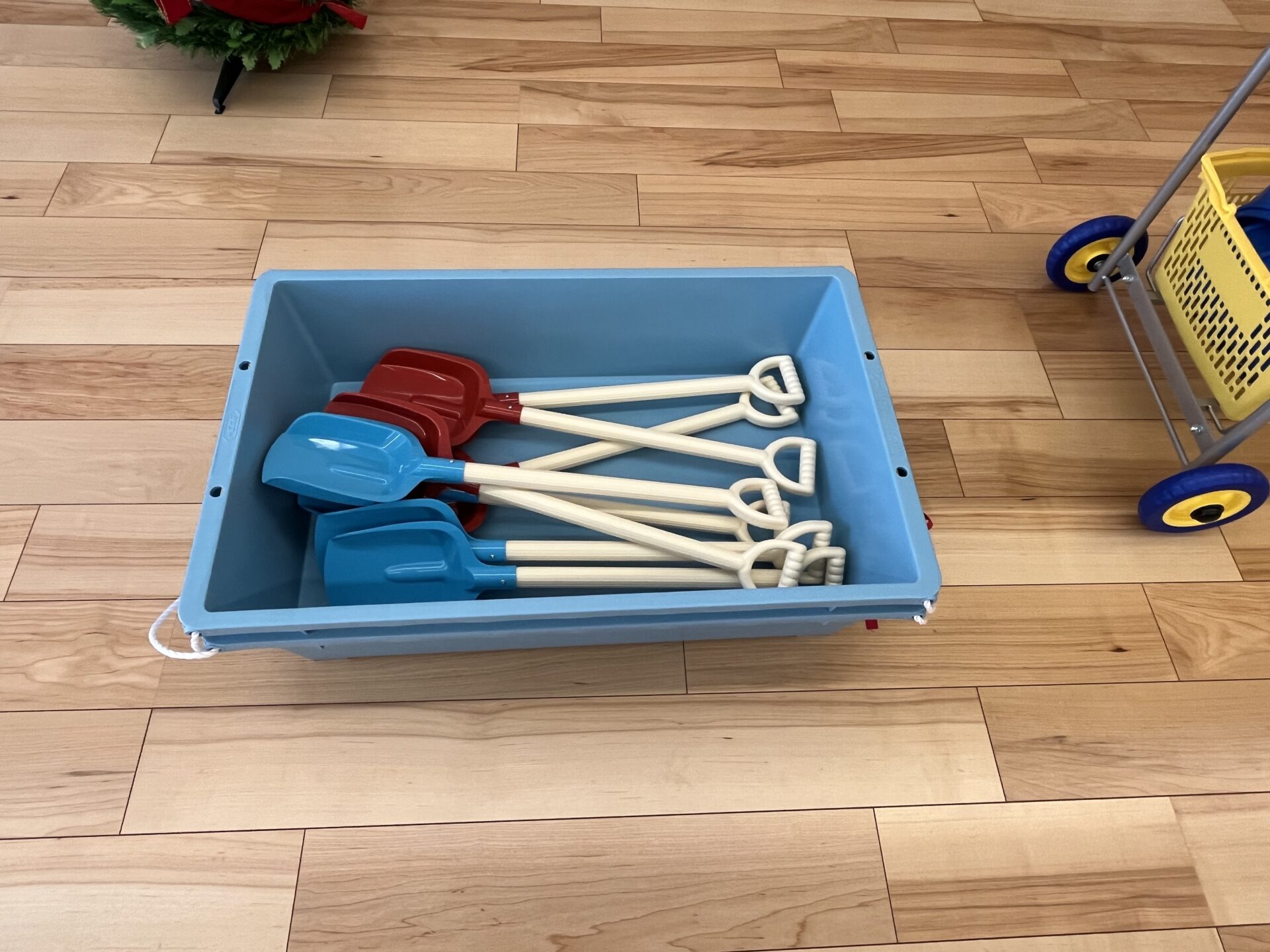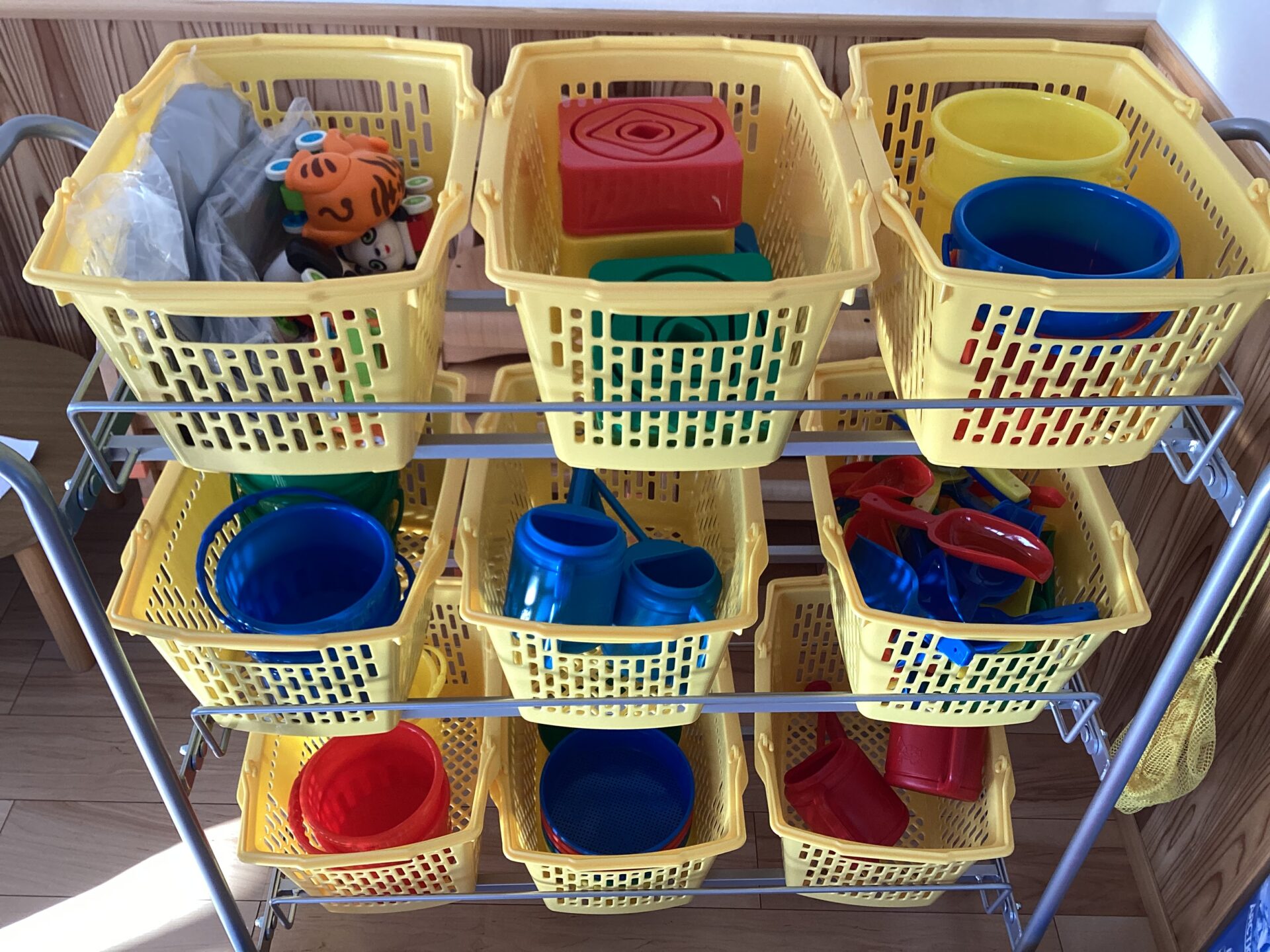 お片付けワゴンに入った、シャベルやざる、じょうろにバケツなどの砂場セット!