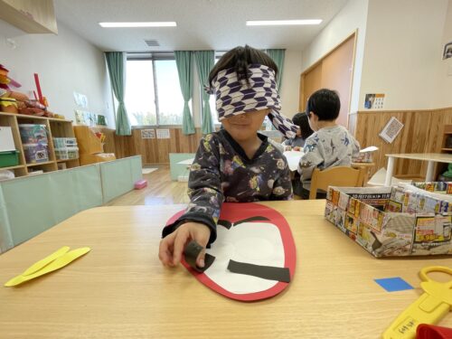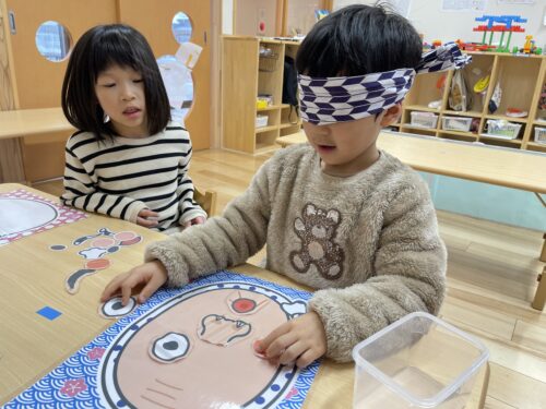 ゆき組(3歳児)は、まゆげをハサミで切ったり、目、くち、ヒゲと顔のパーツを作り、福笑いにチャレンジ!