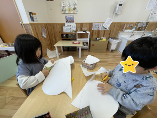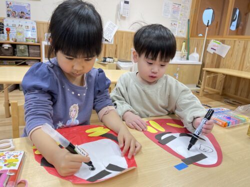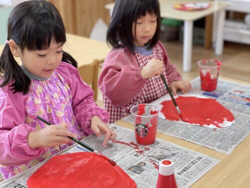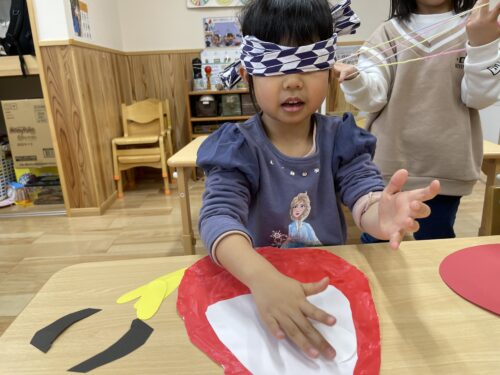 そら組(4歳児)は、だるまの形をハサミで切り、絵の具で塗るところからです。顔のパーツも出来上がり、福笑いにチャレンジ!