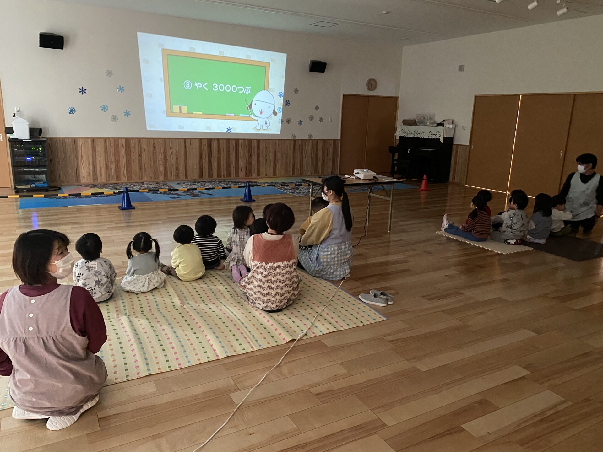 ホールへ集合し、DVDを視聴しました。画面の『ごはんぢゃわんくん』という、ごはんのような?犬のような?キャラクターを見つけ、「なに?なに?」と、不思議そうな顔をしています。