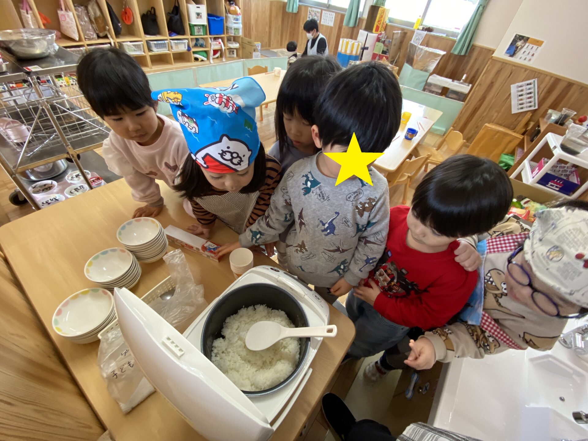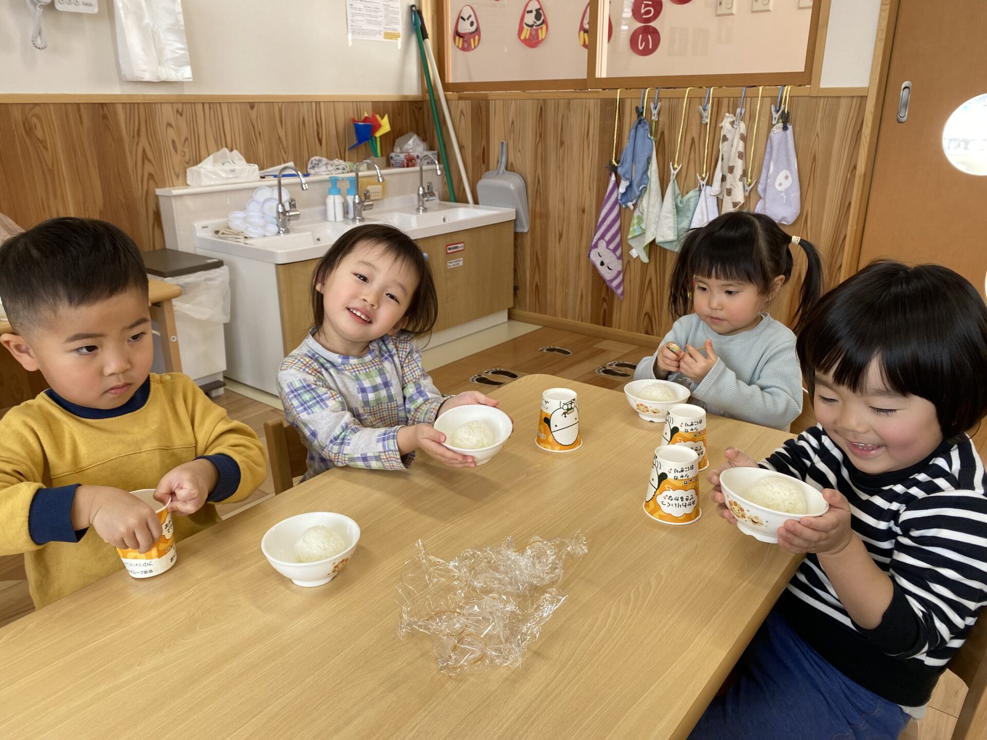 にじ組(2歳児)・ゆき組(3歳児)・そら組(4歳児)が、シャカシャカおにぎり作りに挑戦です。