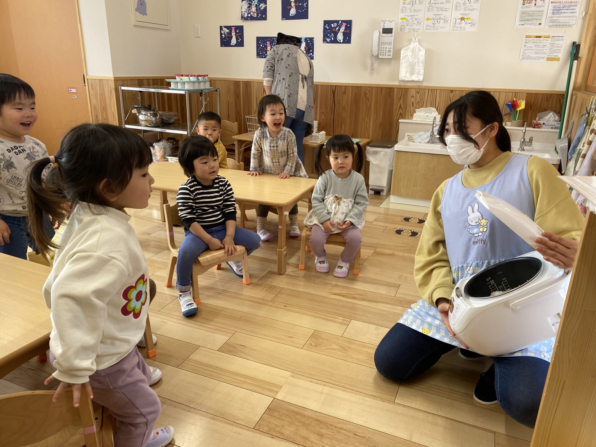 おこめの話しでは今年、そら組(4歳児)が田植えから精米まで体験したので、「知ってるよ~」なんて自信満々な声も!