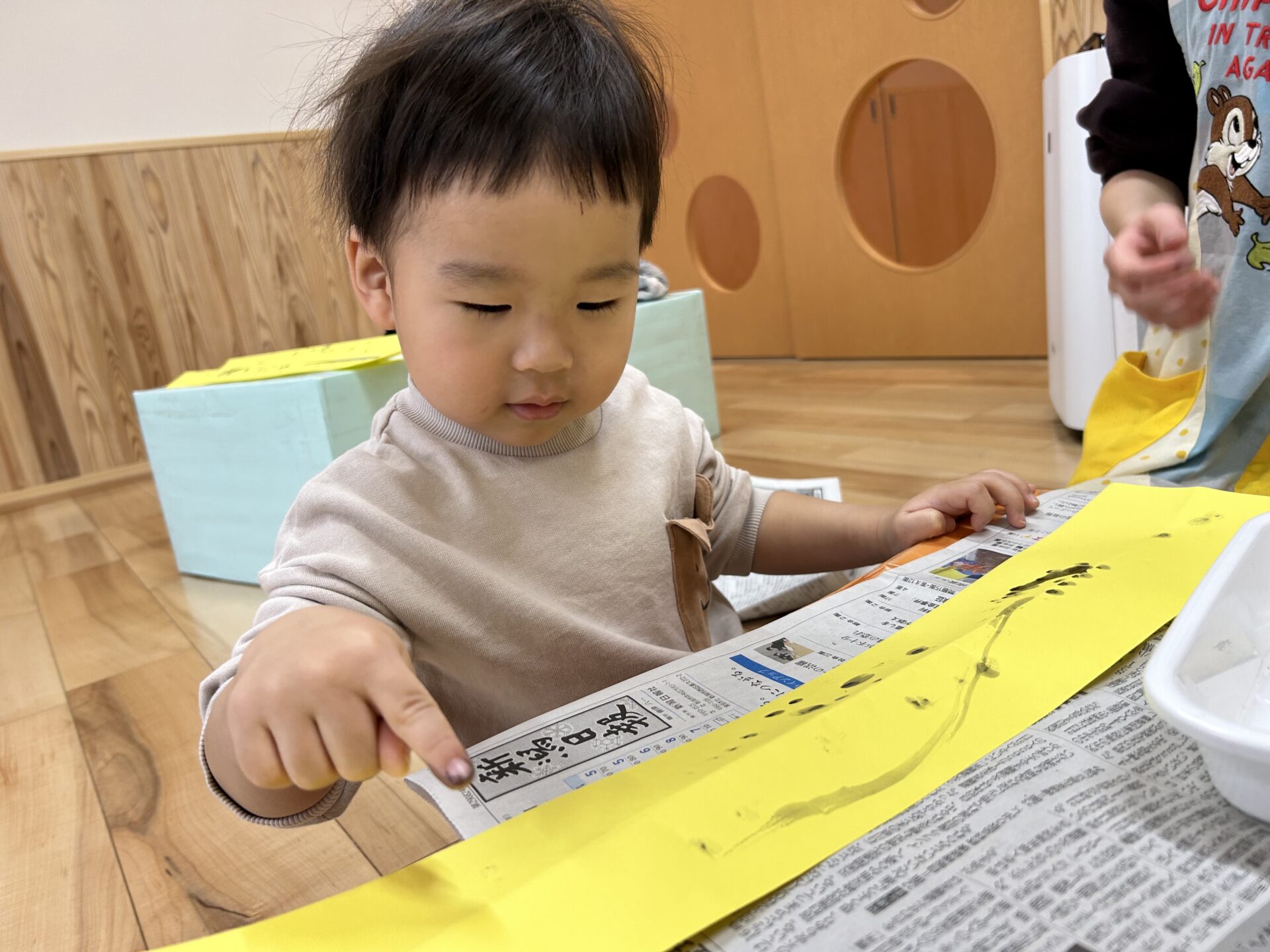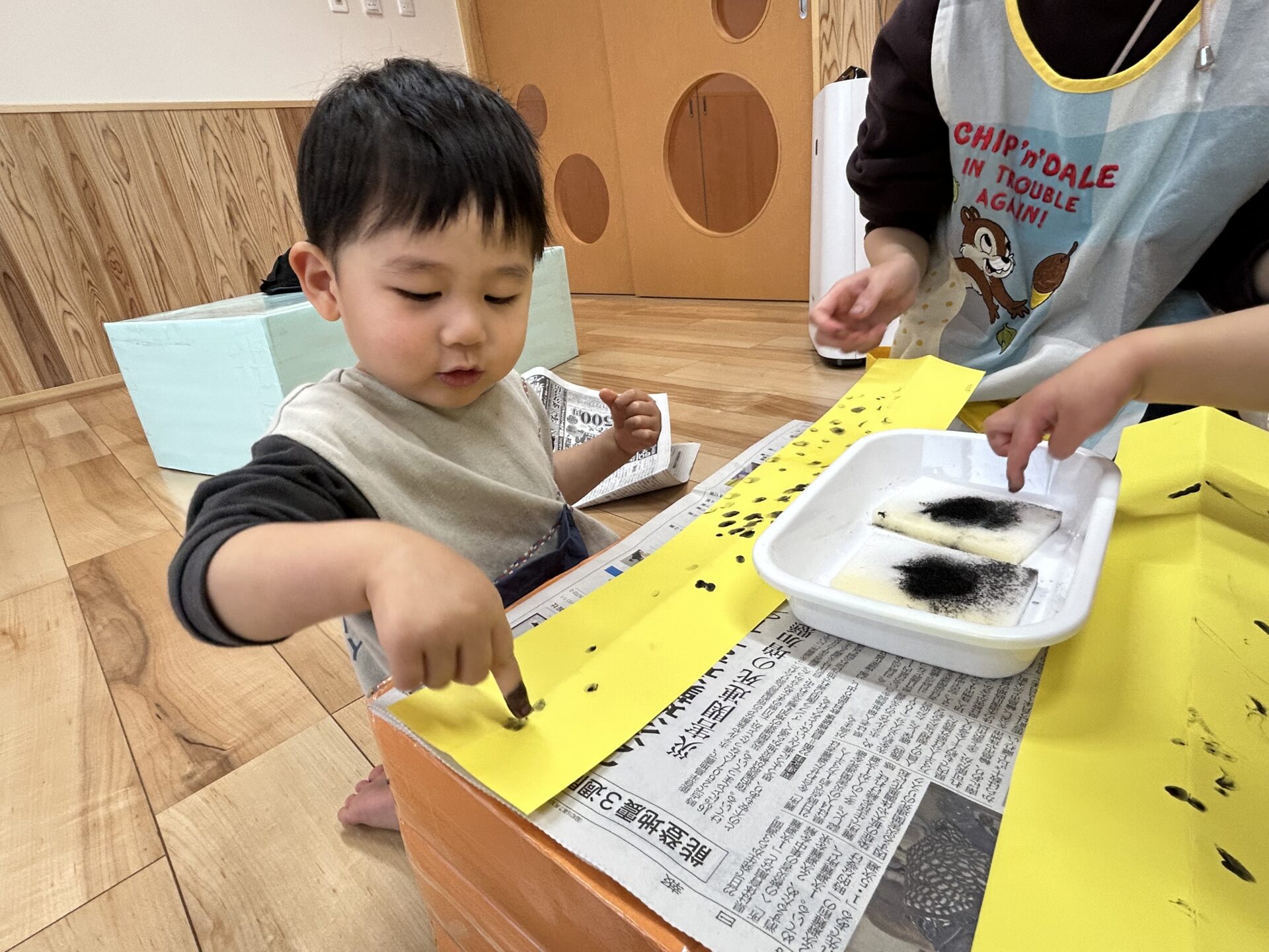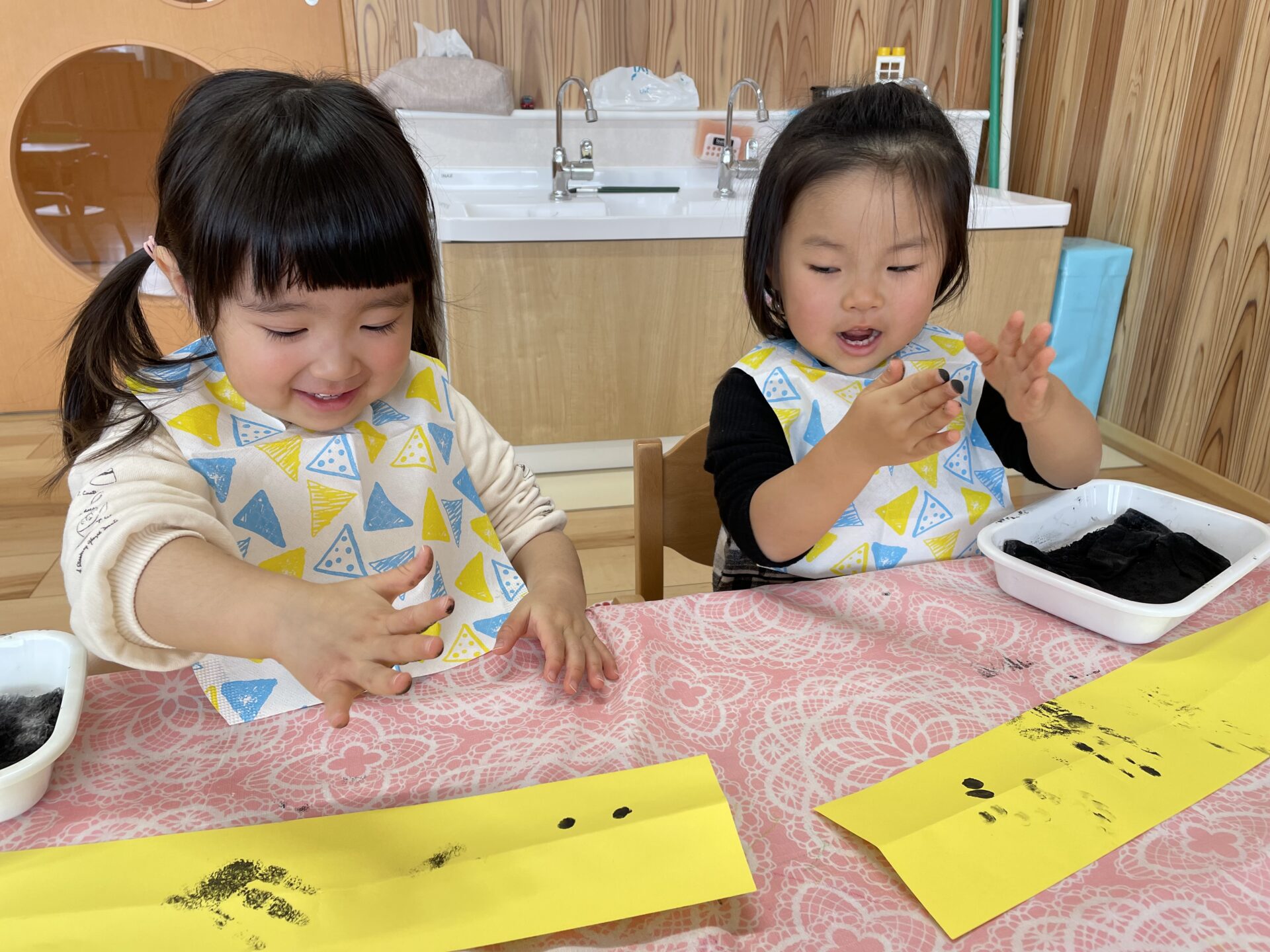 黒の絵の具で、ちょんちょんと指スタンプ♪
