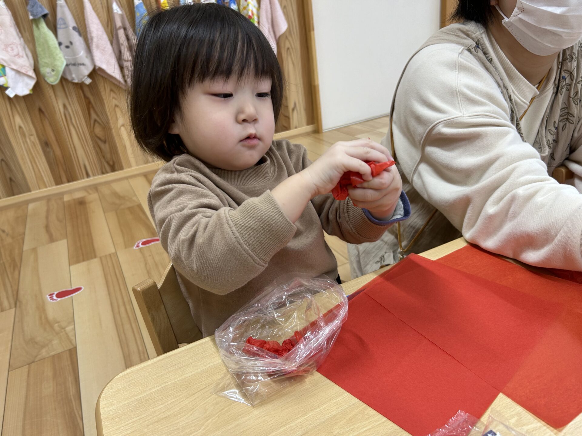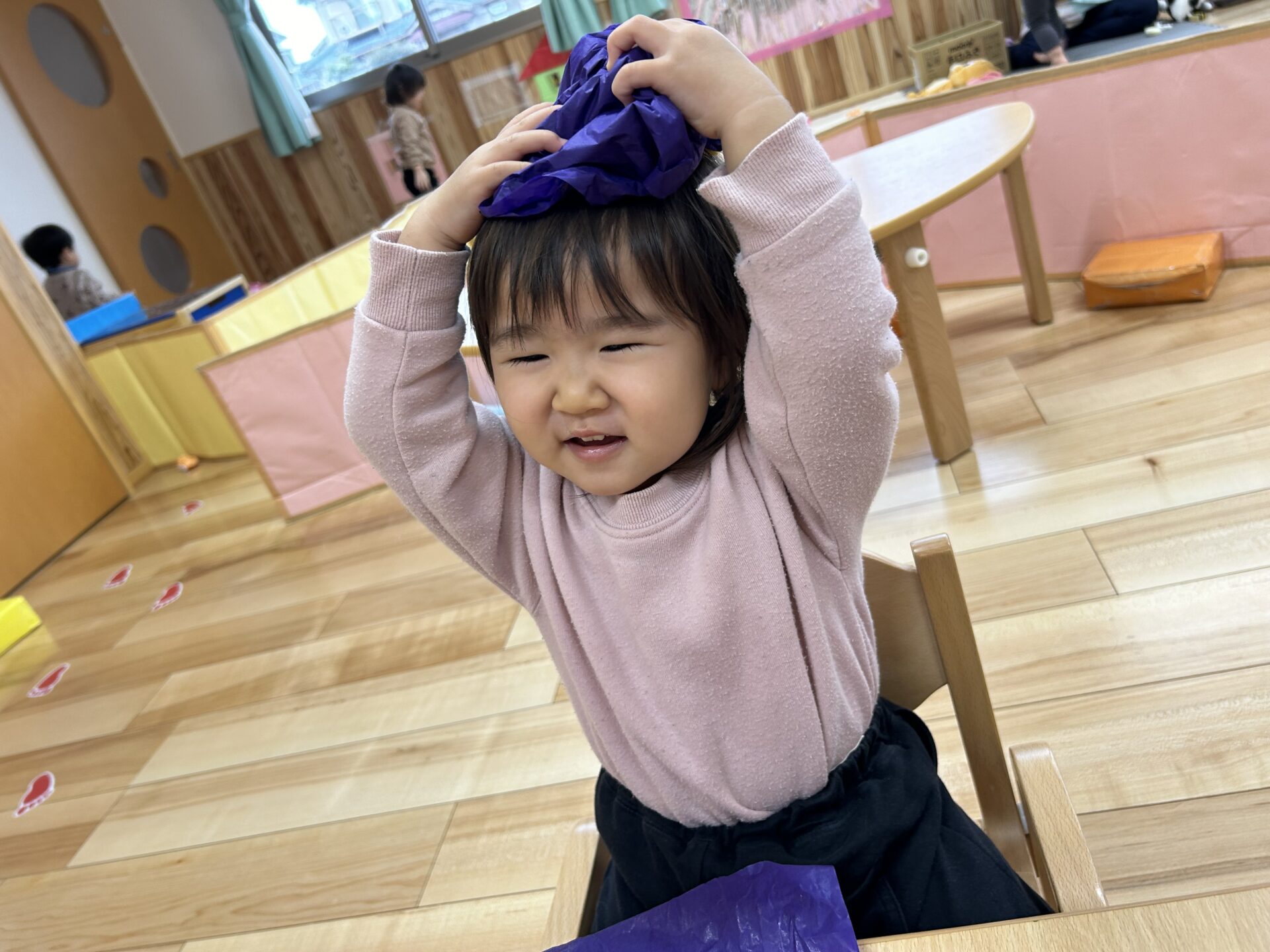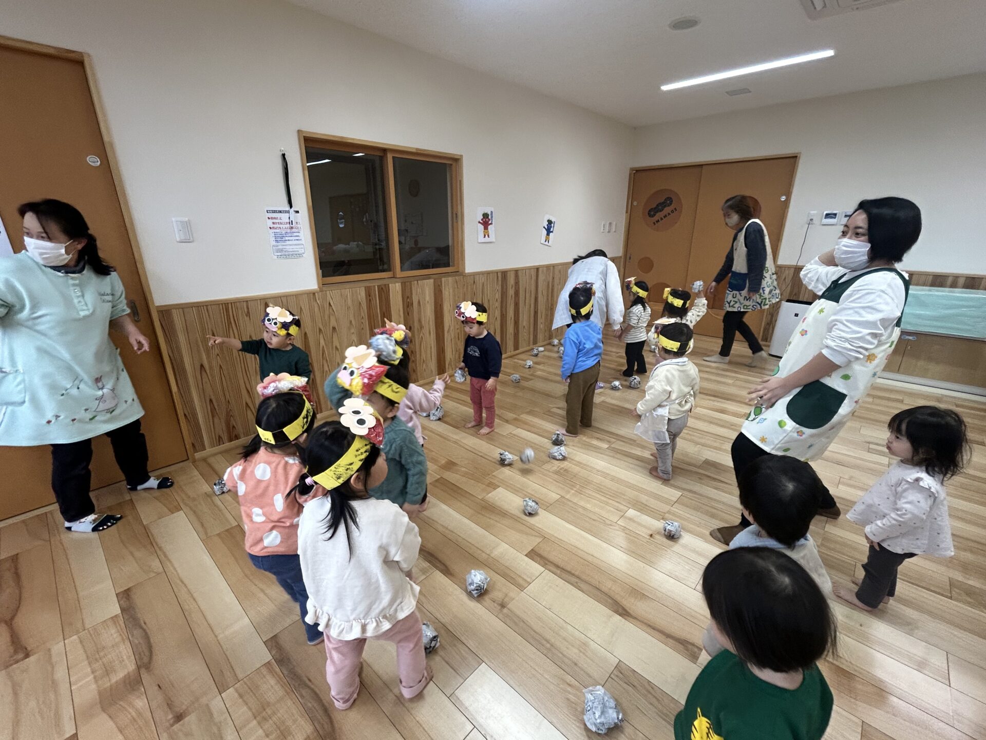 怖いながらも、自分を、友だちを、保育者を守るために「オニはーそと!」と、力いっぱい豆(丸めた新聞紙)を投げました。