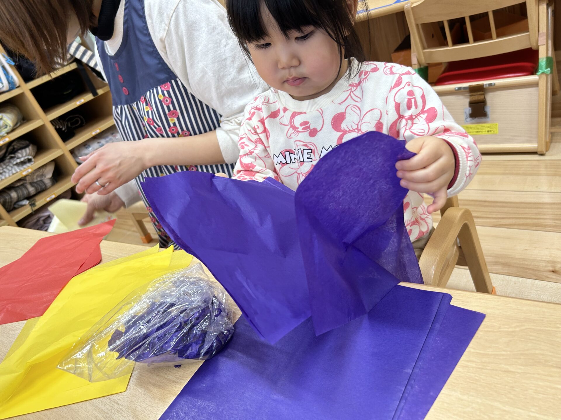 花紙をクシャクシャと丸め、袋に詰めていきます。