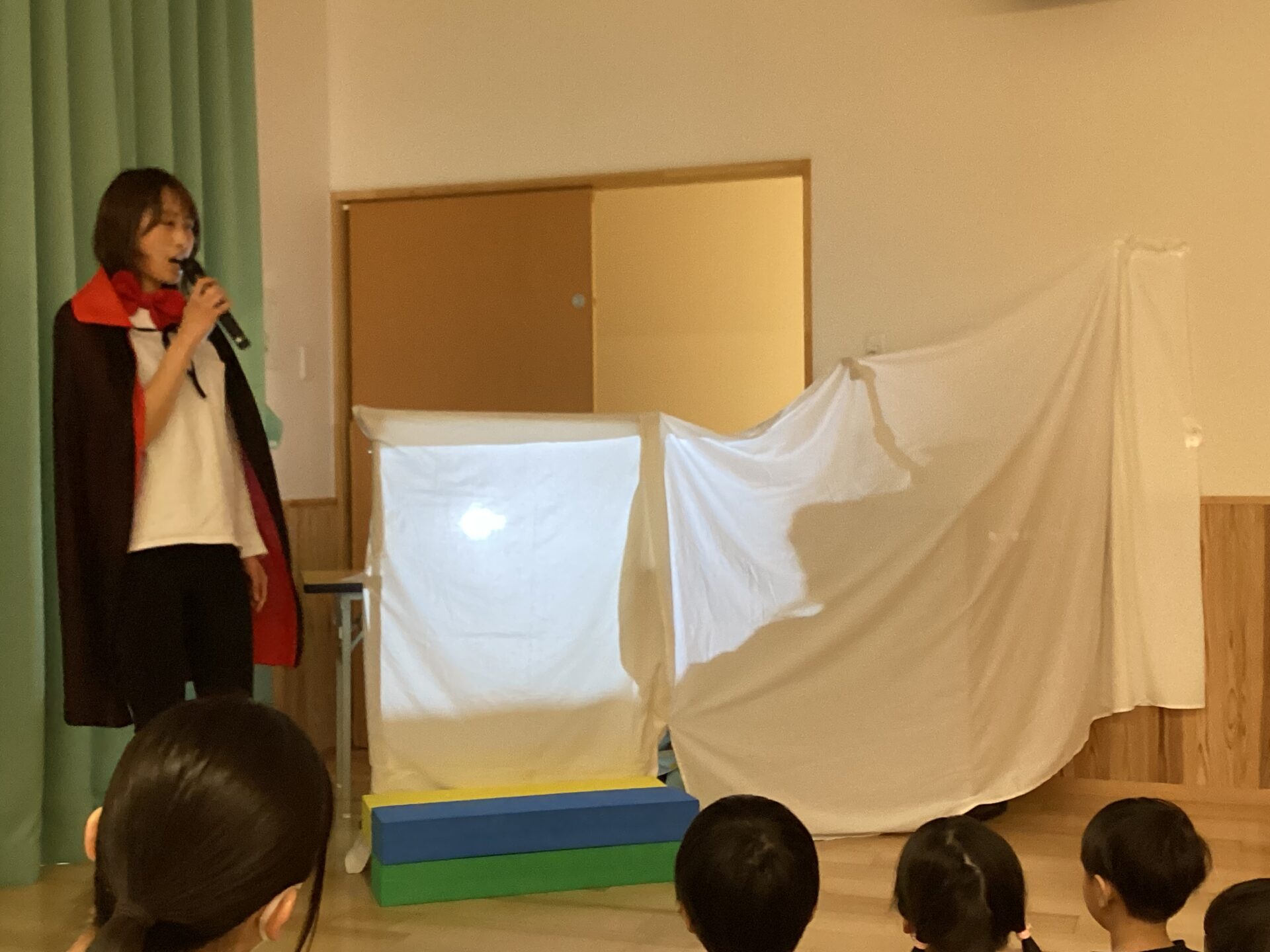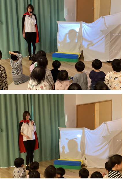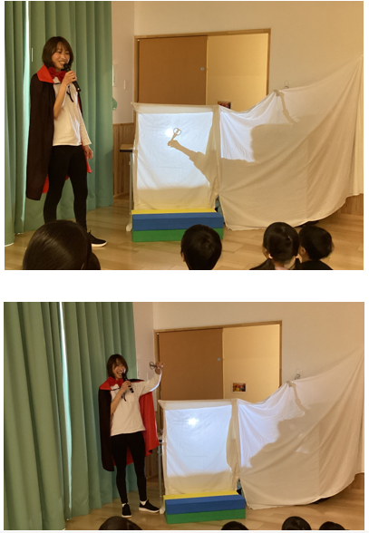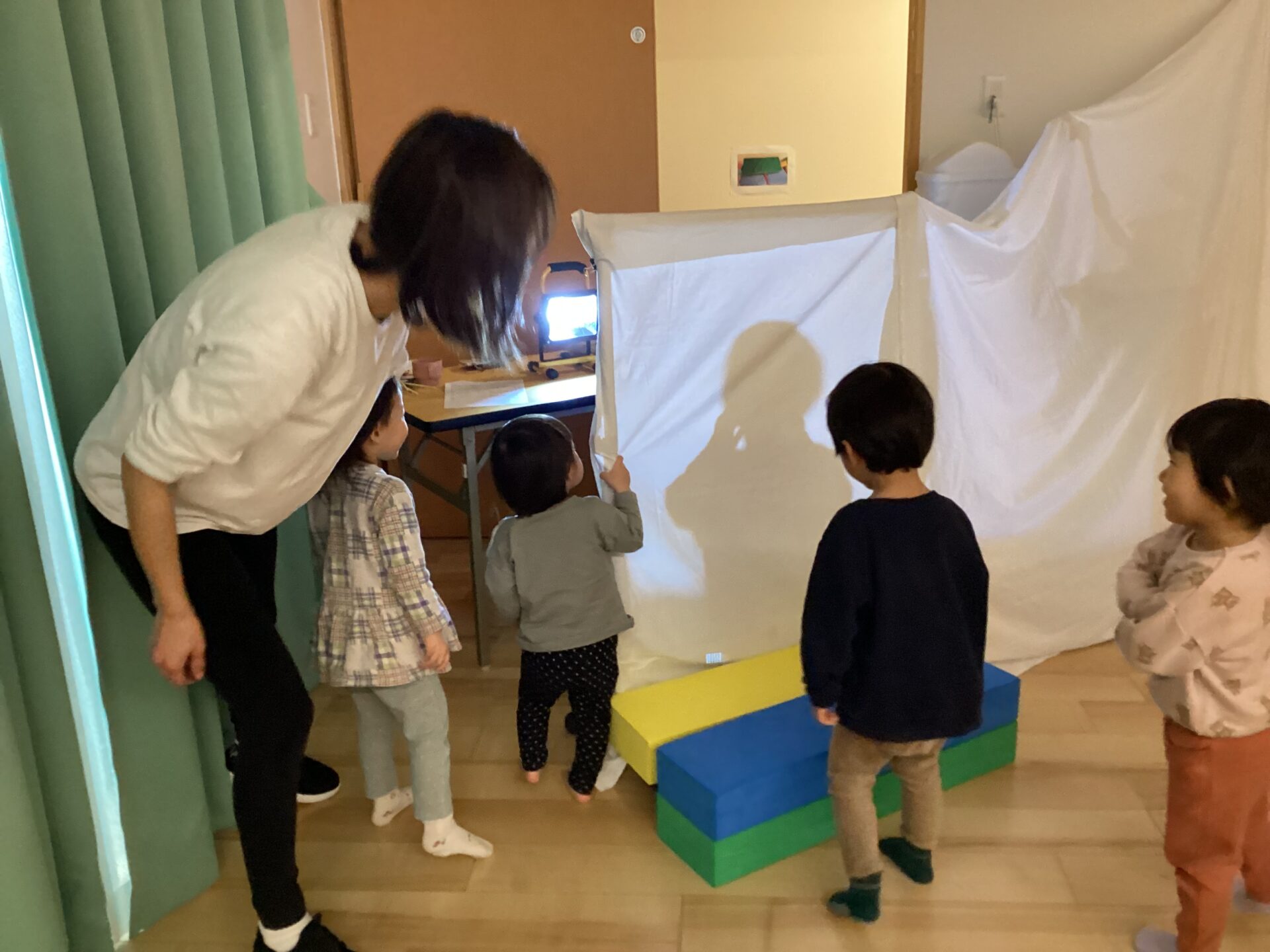 真っ白なシーツに映し出される影を見て、「これは何だろう?」と、みんなで一緒に考えます。