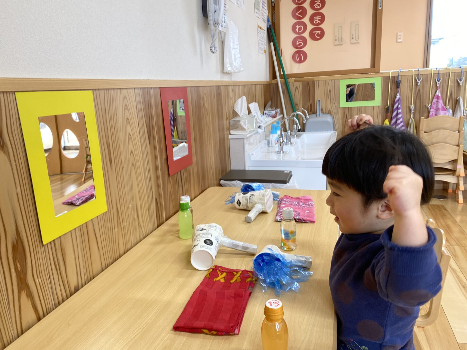 日ごろから買いものやお出かけで、お家の方と店員さんとのやり取りを子どもたちは、よ~く見ています。「どれにしますか??」「これくださ~い!」など、敬語を使ってやり取りを再現しています😲普段話している言葉と、店員さんになりきって話す言葉を使い分けられるなんて・・・驚きです!!