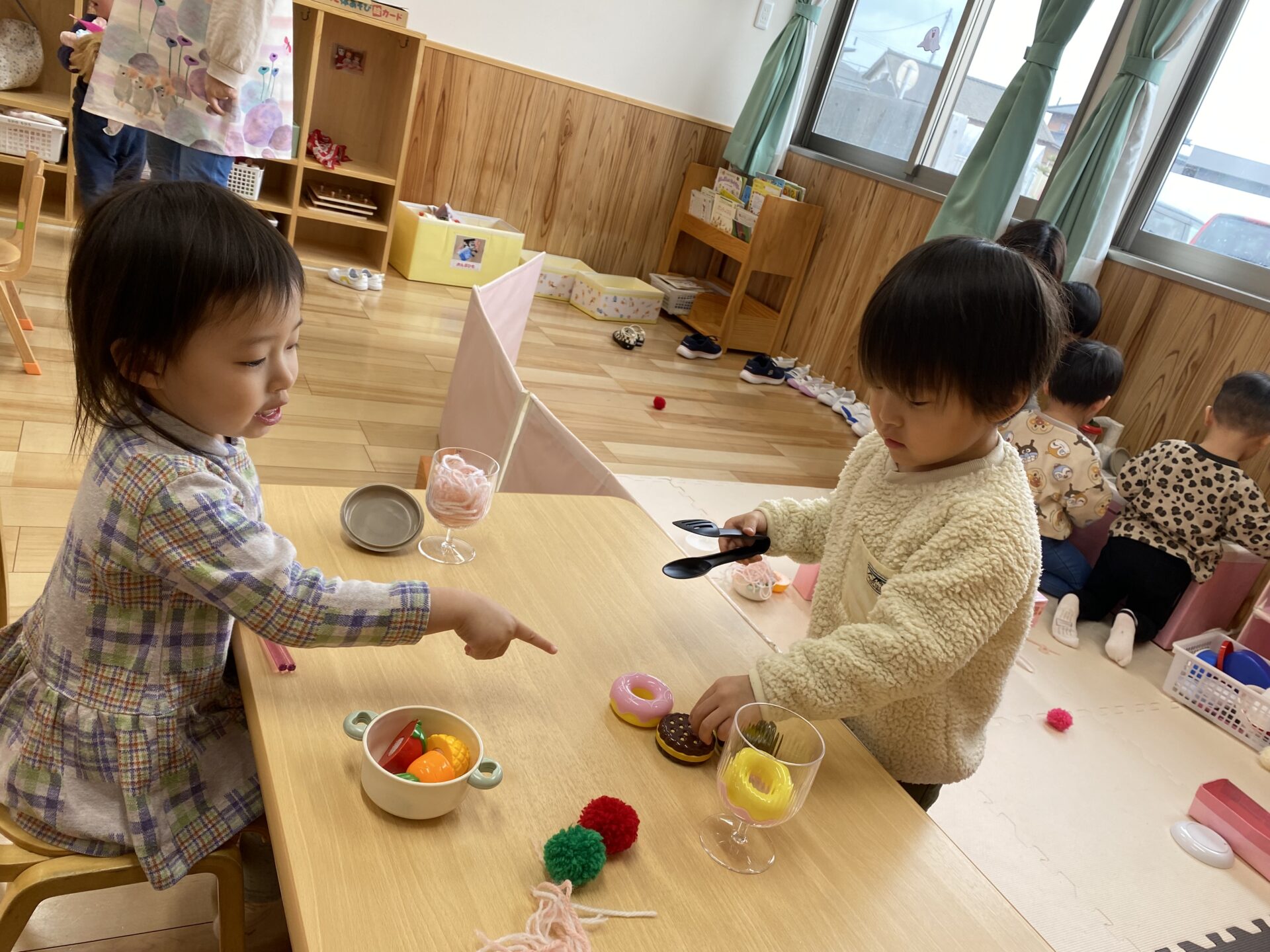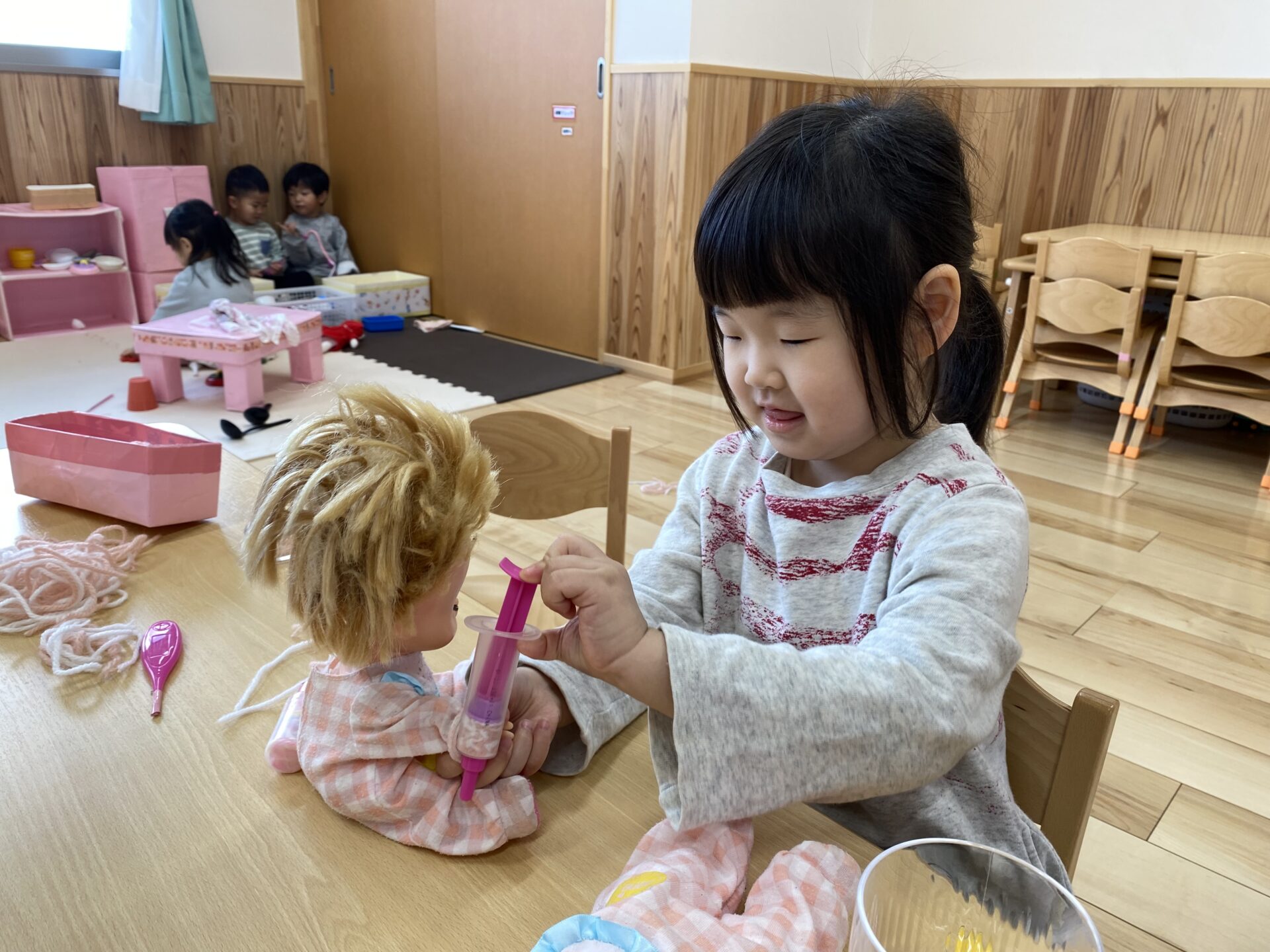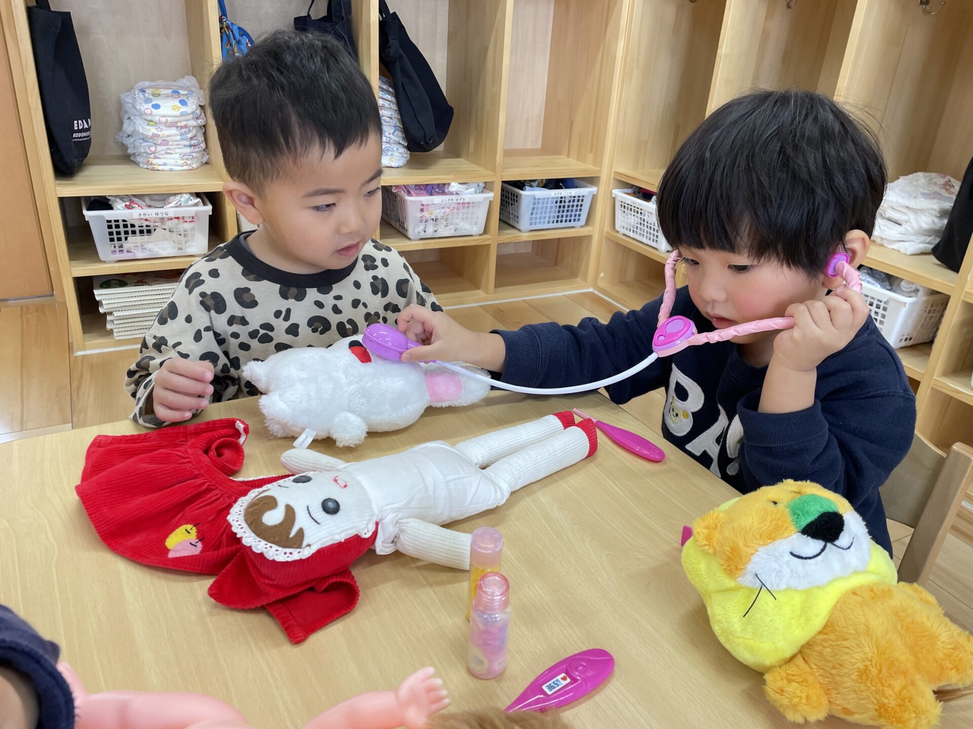 にじ組(2歳児)は、お友だちとごっこ遊びをすることが大好きです🎶お医者さんや店員さん、お客さんなど、その日の気分によって、お友だちと役になりきって楽しんでいます。そんな子どもたちの姿を、ご紹介いたします。