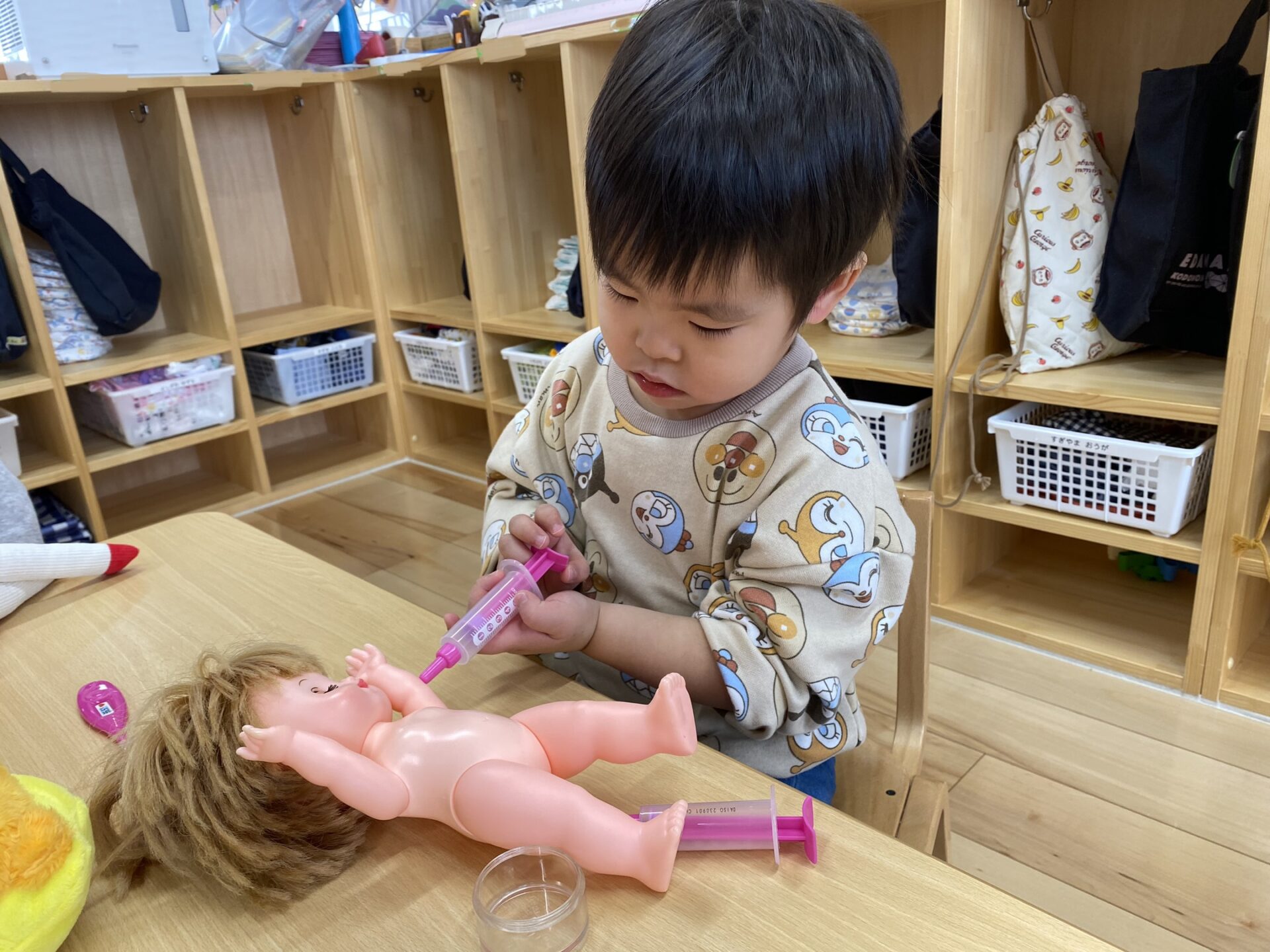聴診器や体温計、注射器などを使い、お友だちやお人形に「お熱ですか~?」「注射しますよ。チクッ!」と診察しています✨診察が終わると、しっかりとお薬まで処方してくれる、凄腕のお医者さんたちです🧑⚕️🩺