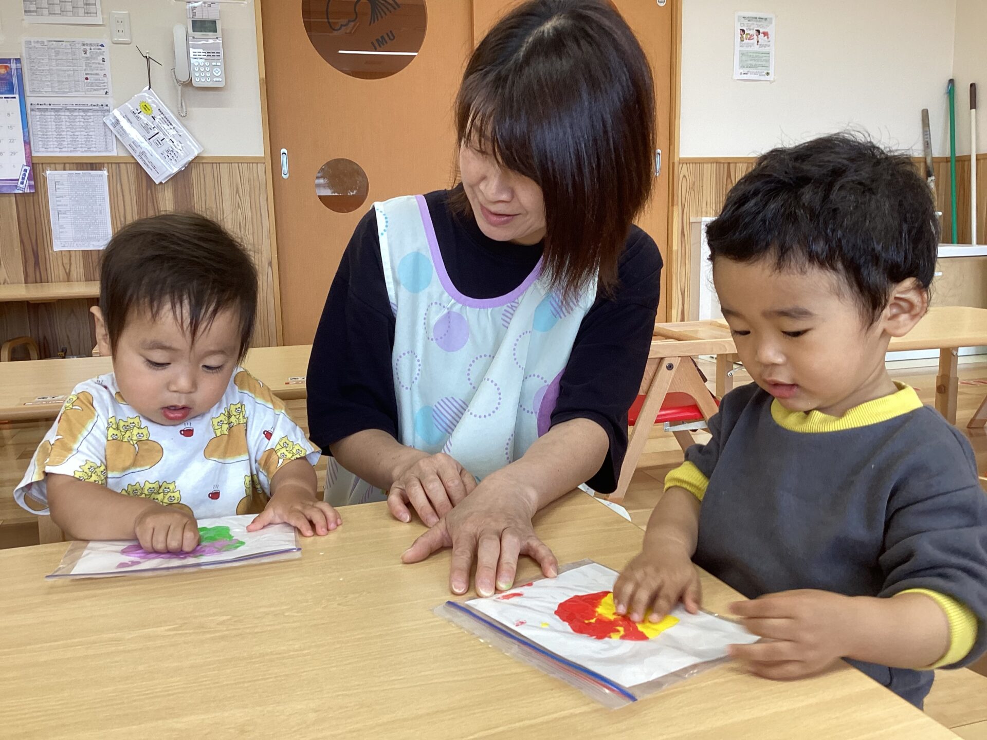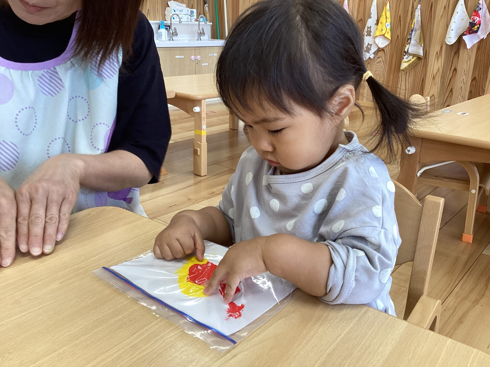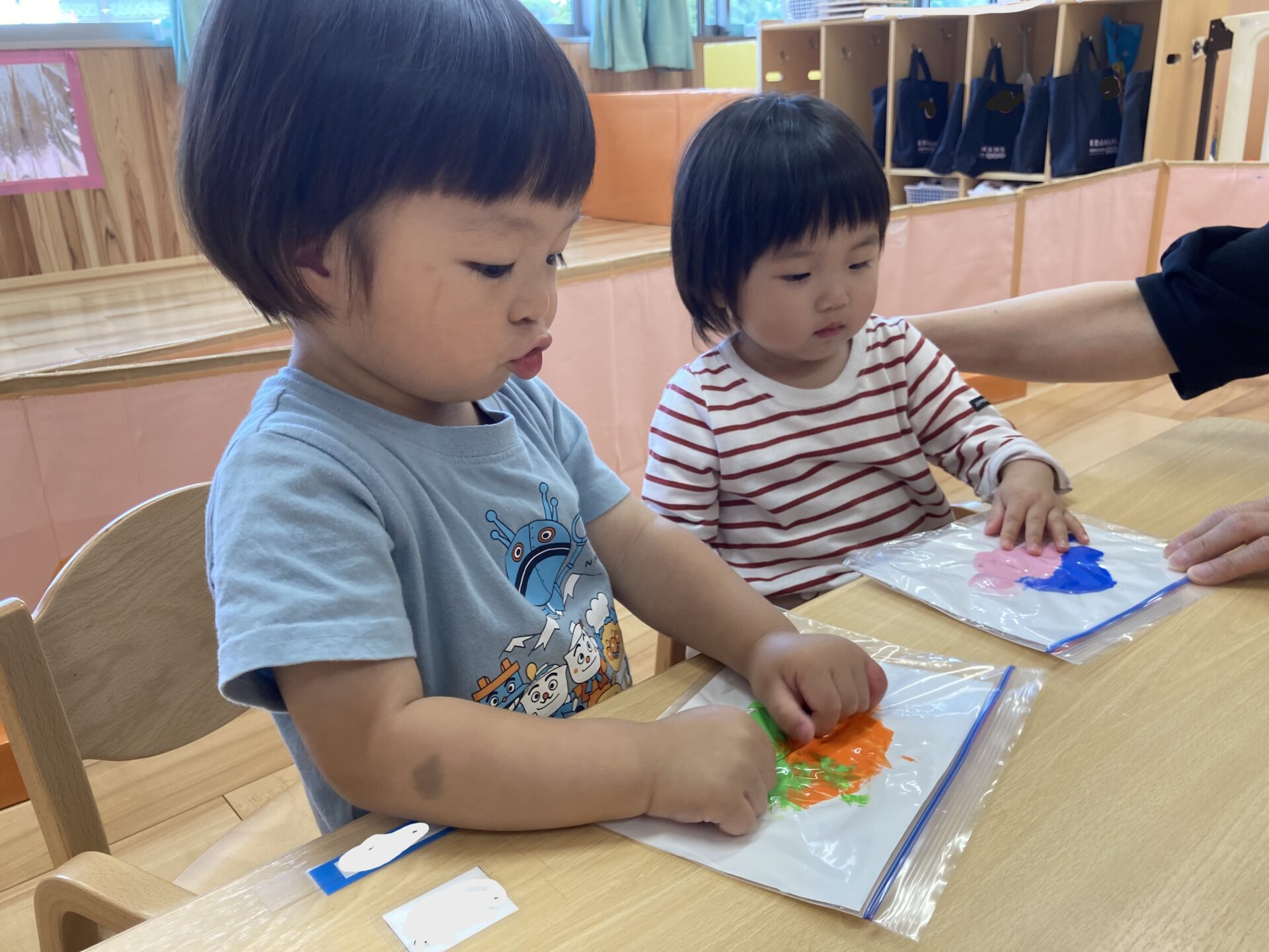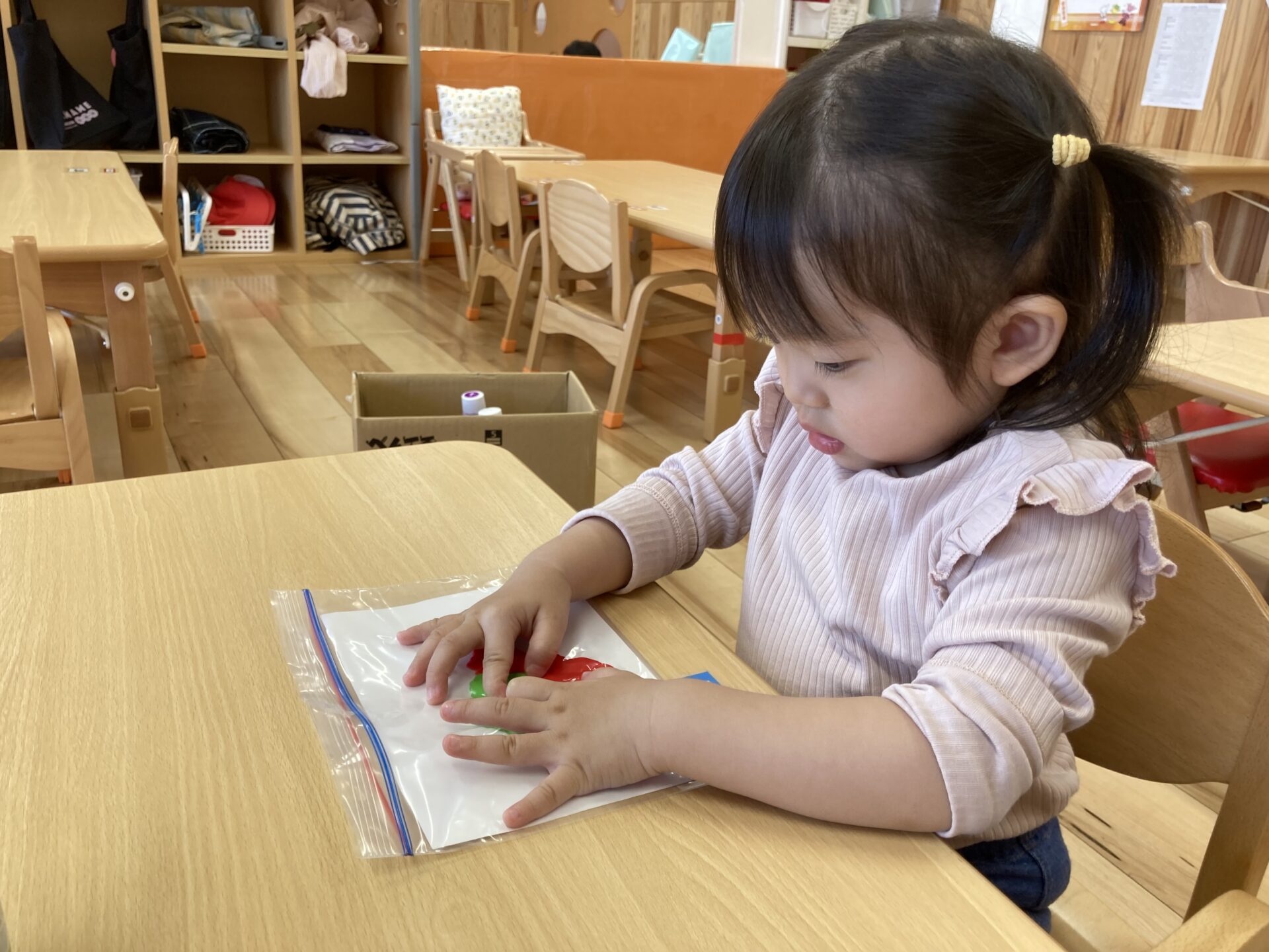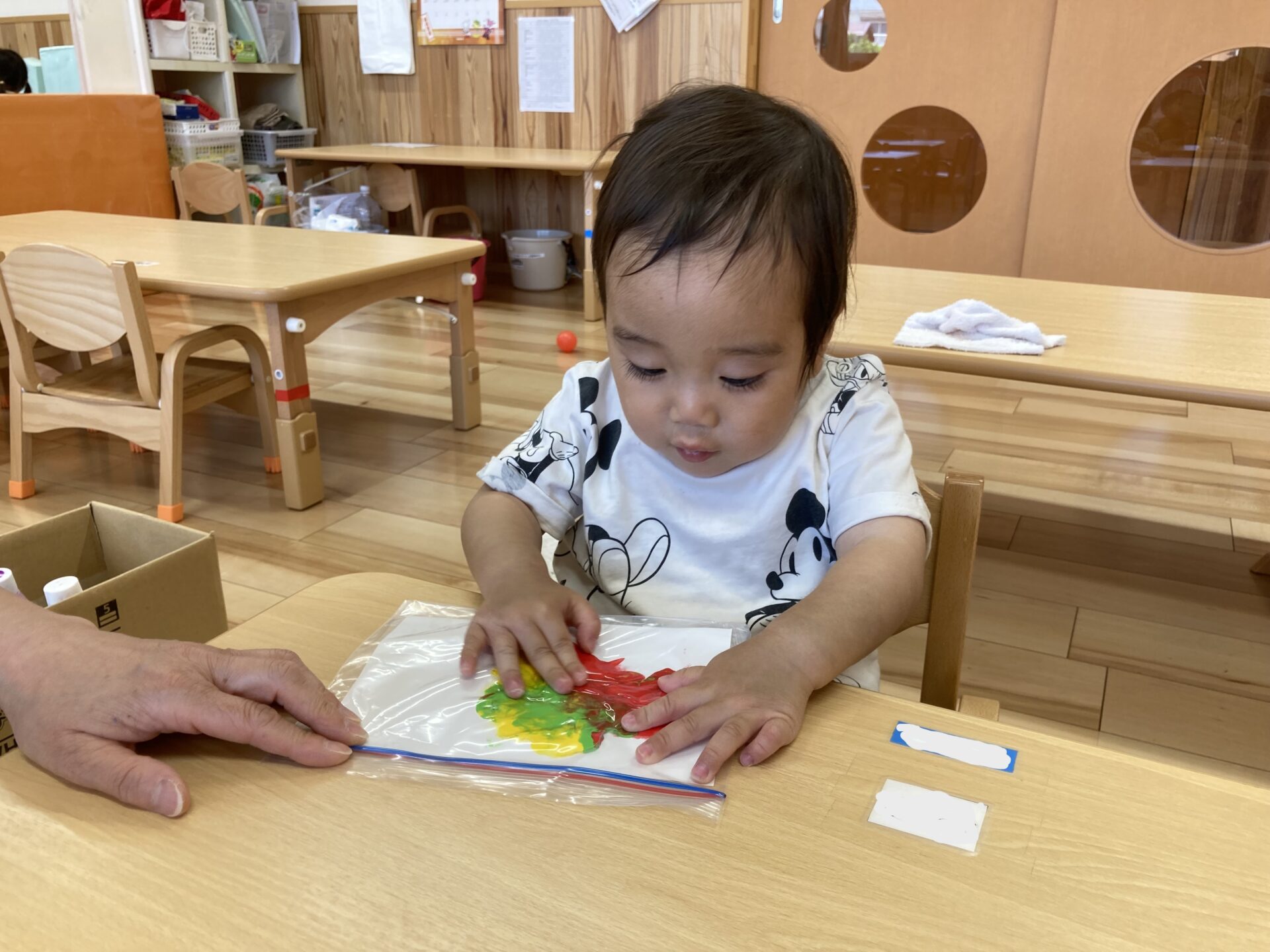絵の具をジップロックに入れ上から触れるという感触あそびを楽しみました。