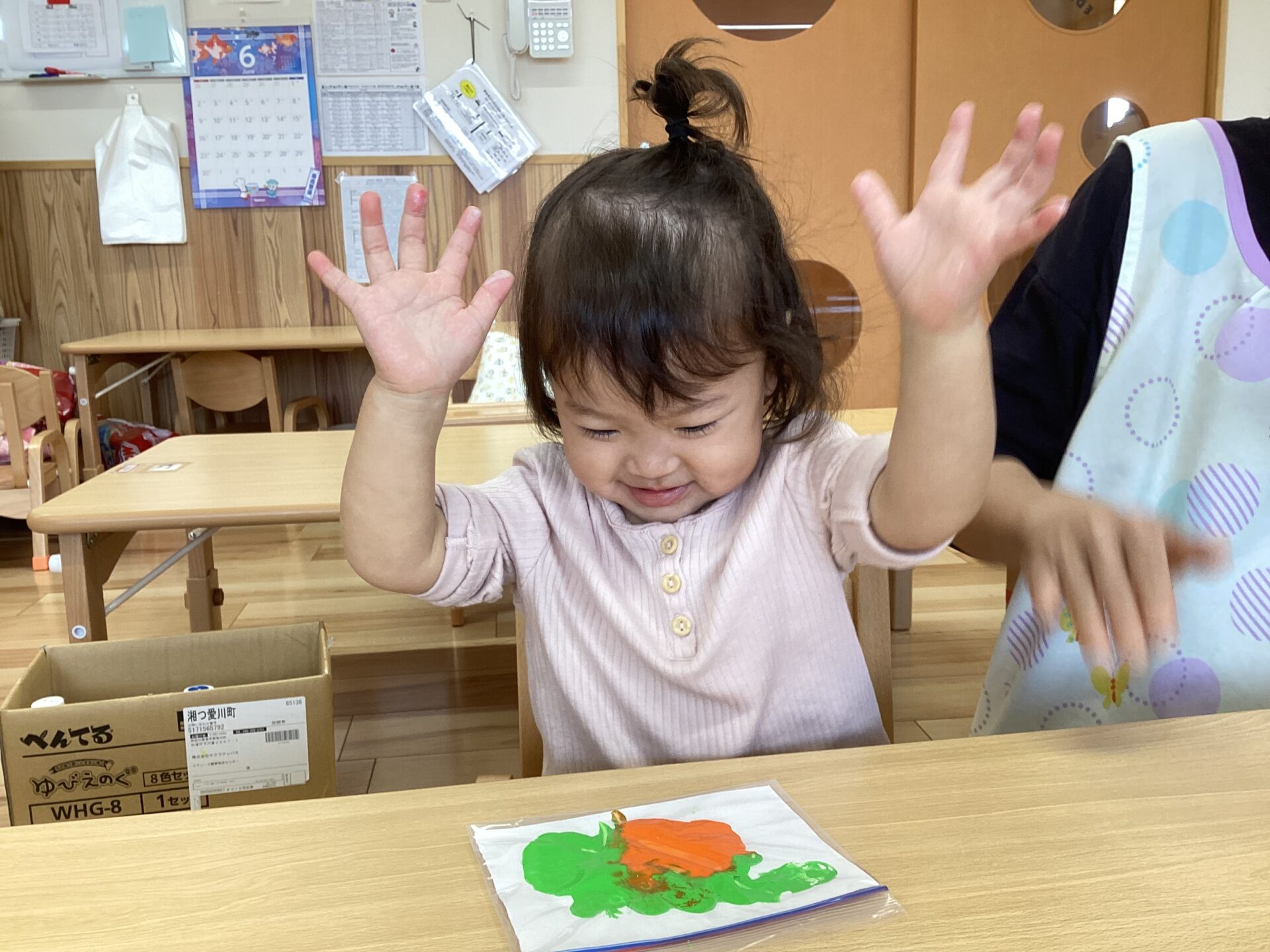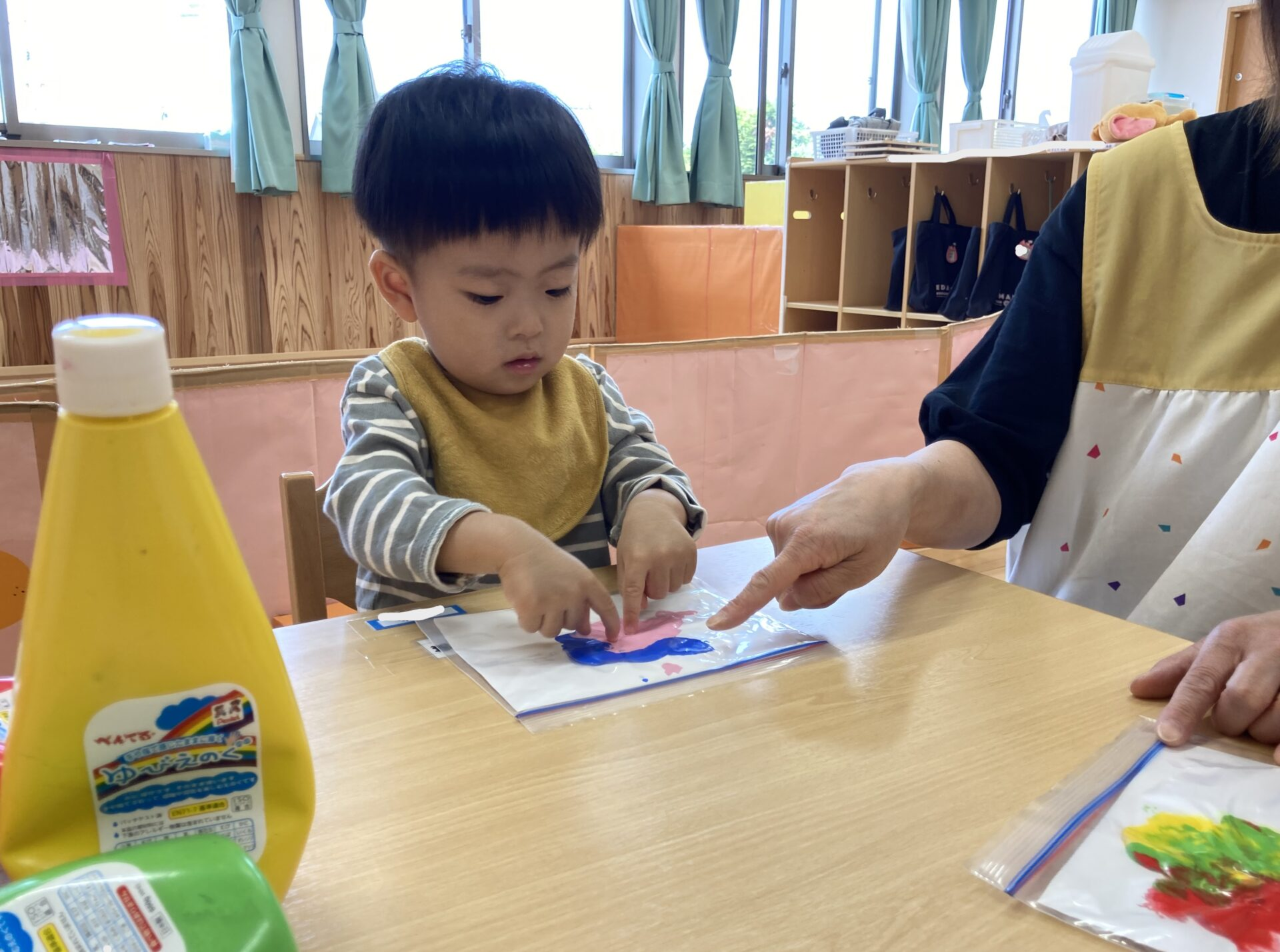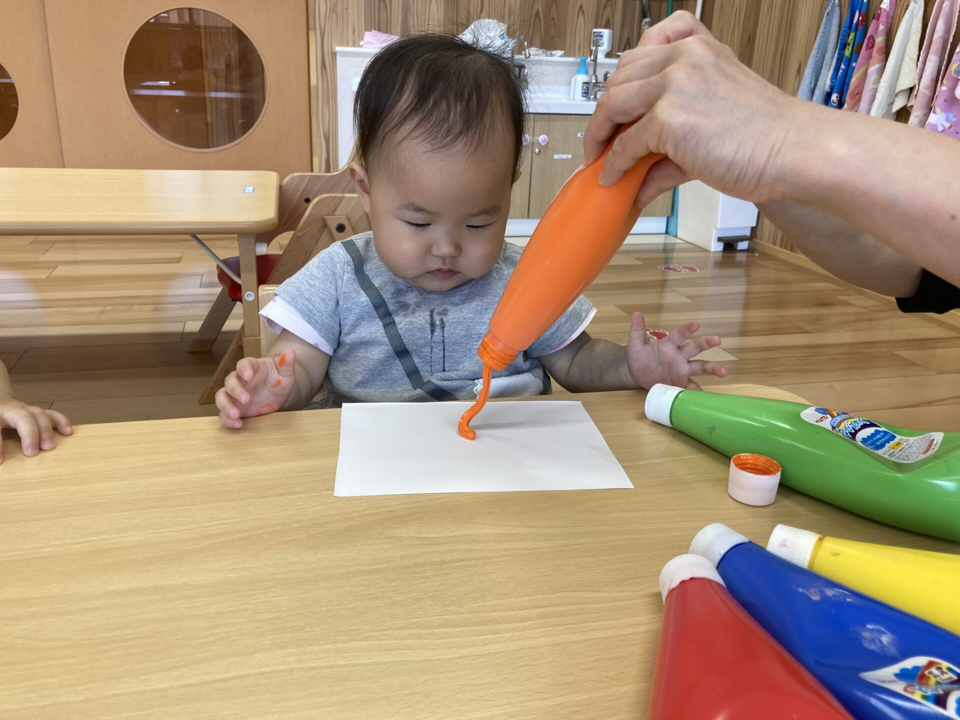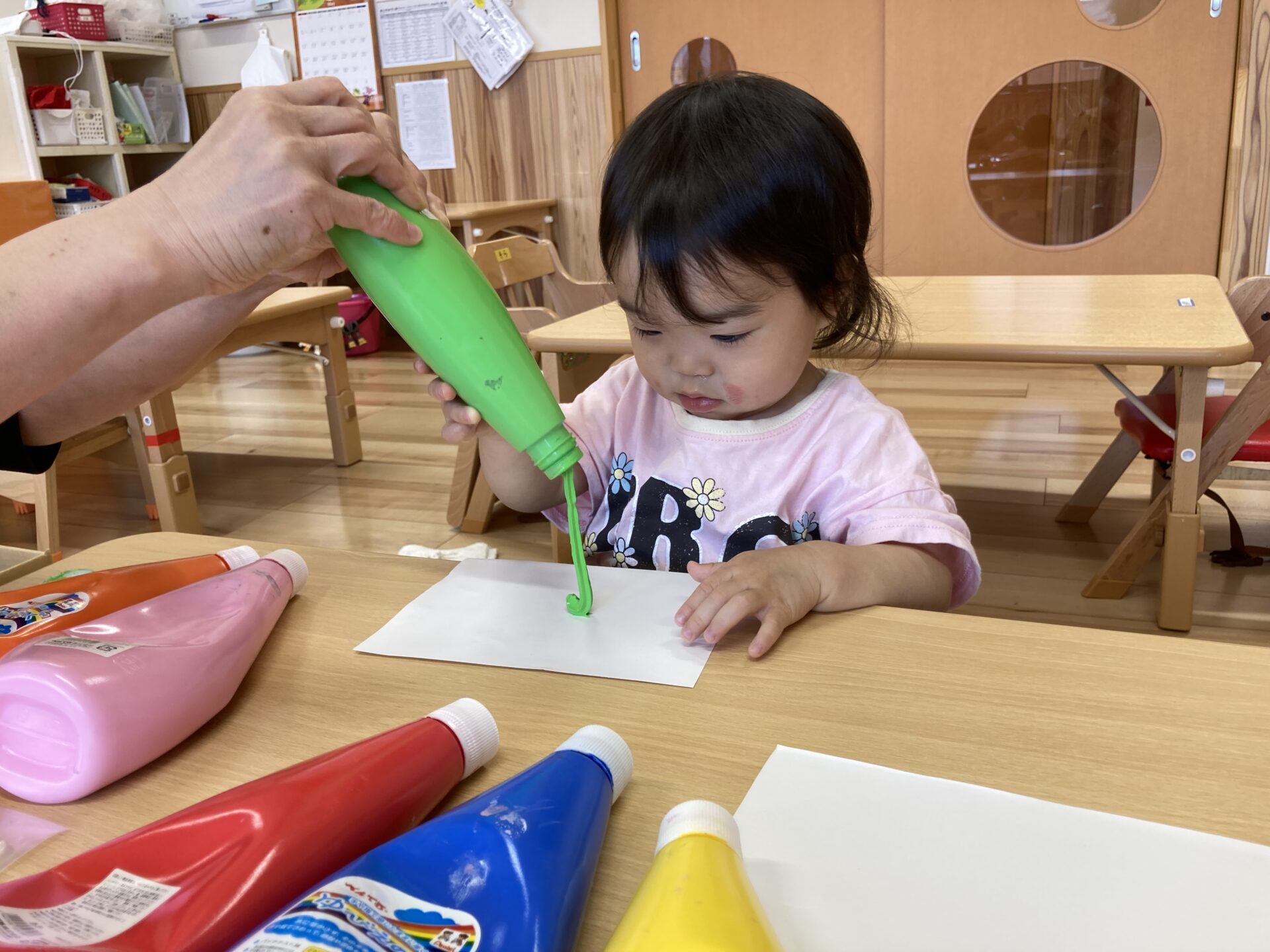好きな色を選んで、保育者と一緒に絵の具を出してみました。