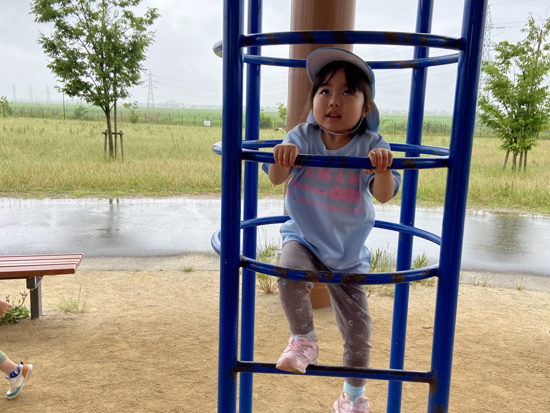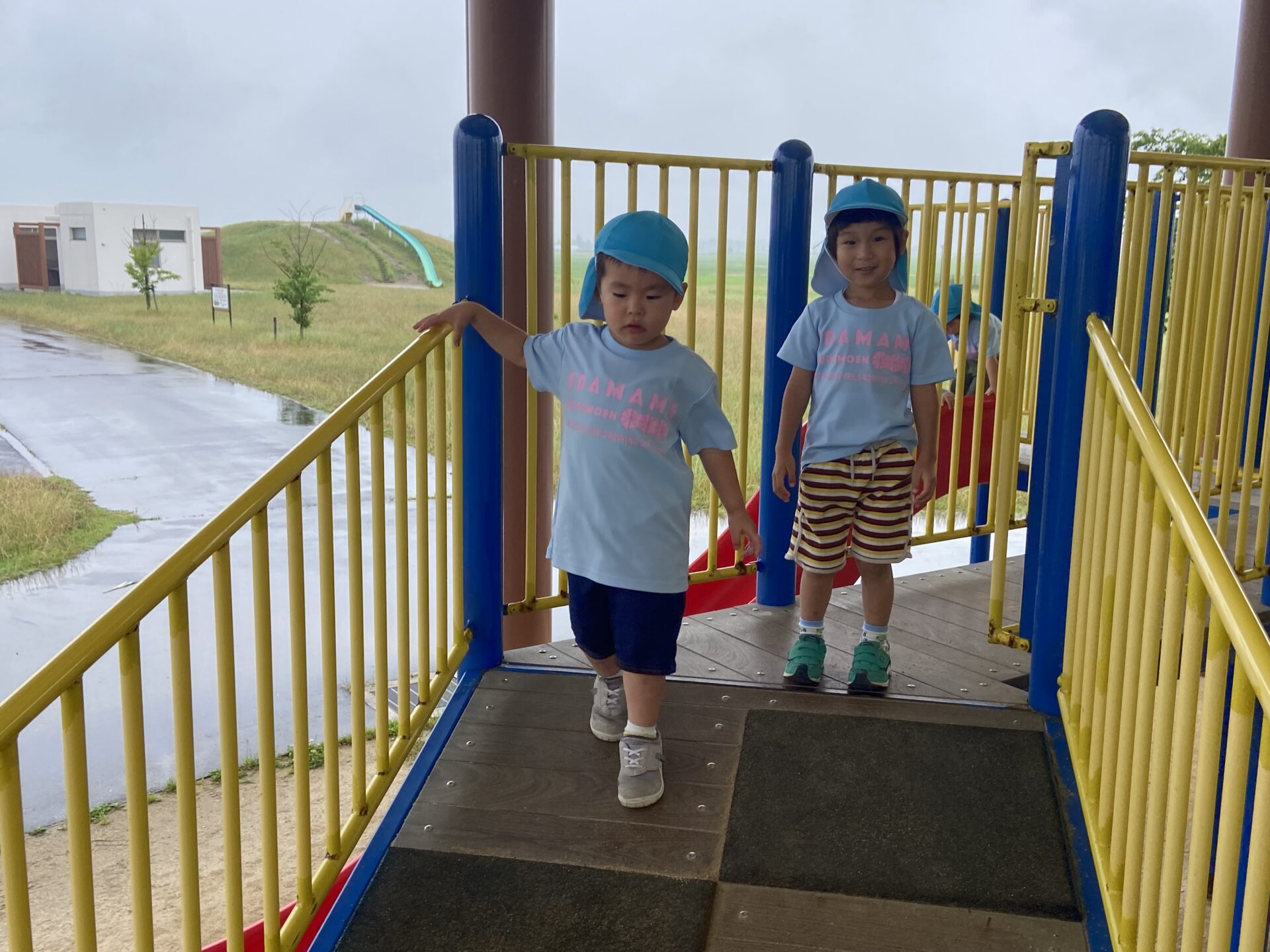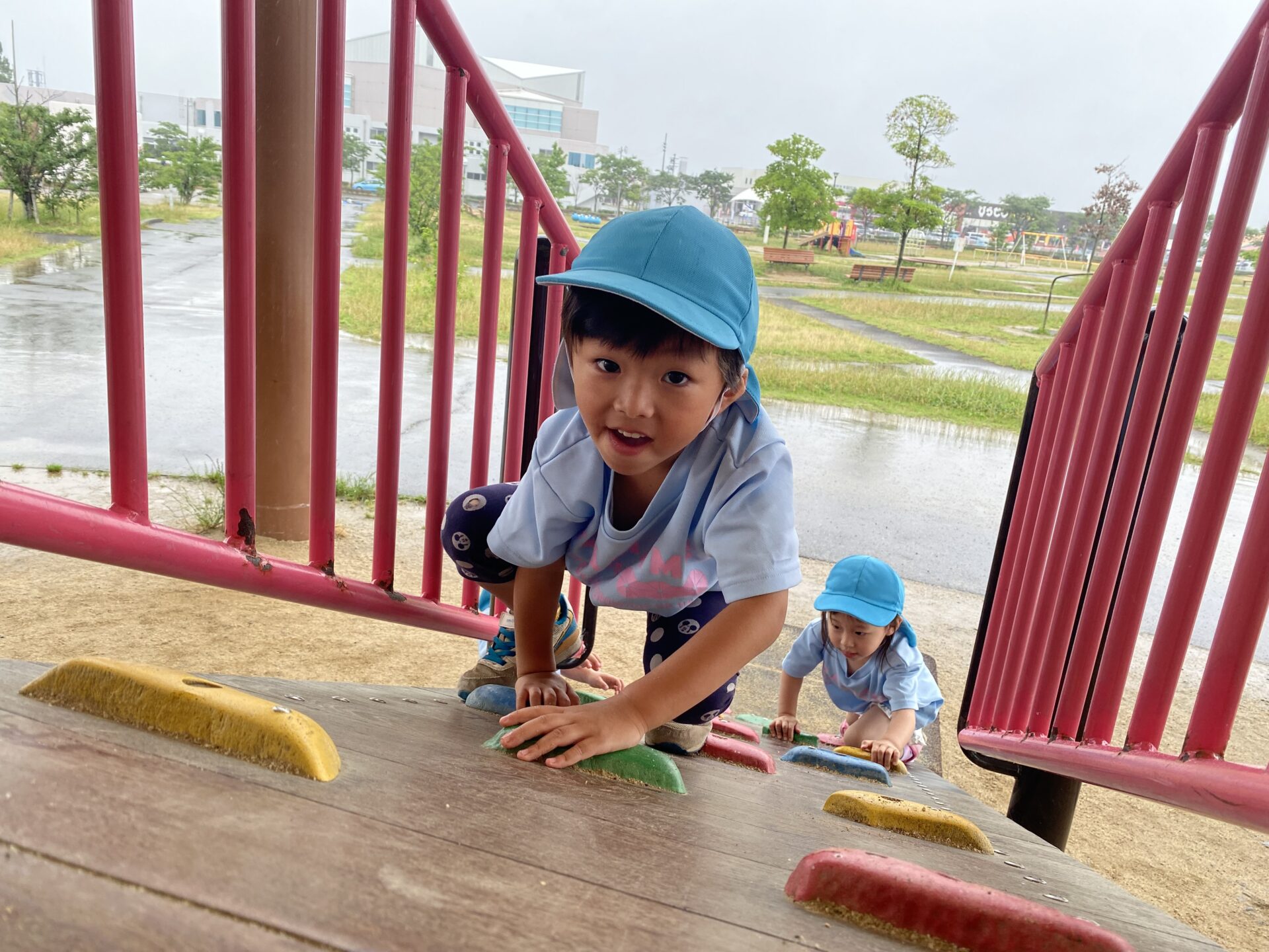 お天気は、あいにくの雨で、子どもたちは「雨降ってるね。」「公園行けないかな?😥」と不安そうに窓の外を眺めていましたが、保育者が「屋根が付いているところで遊ぶから、公園行けるよ!」と話すと「やったー!!」と大喜びでした✨