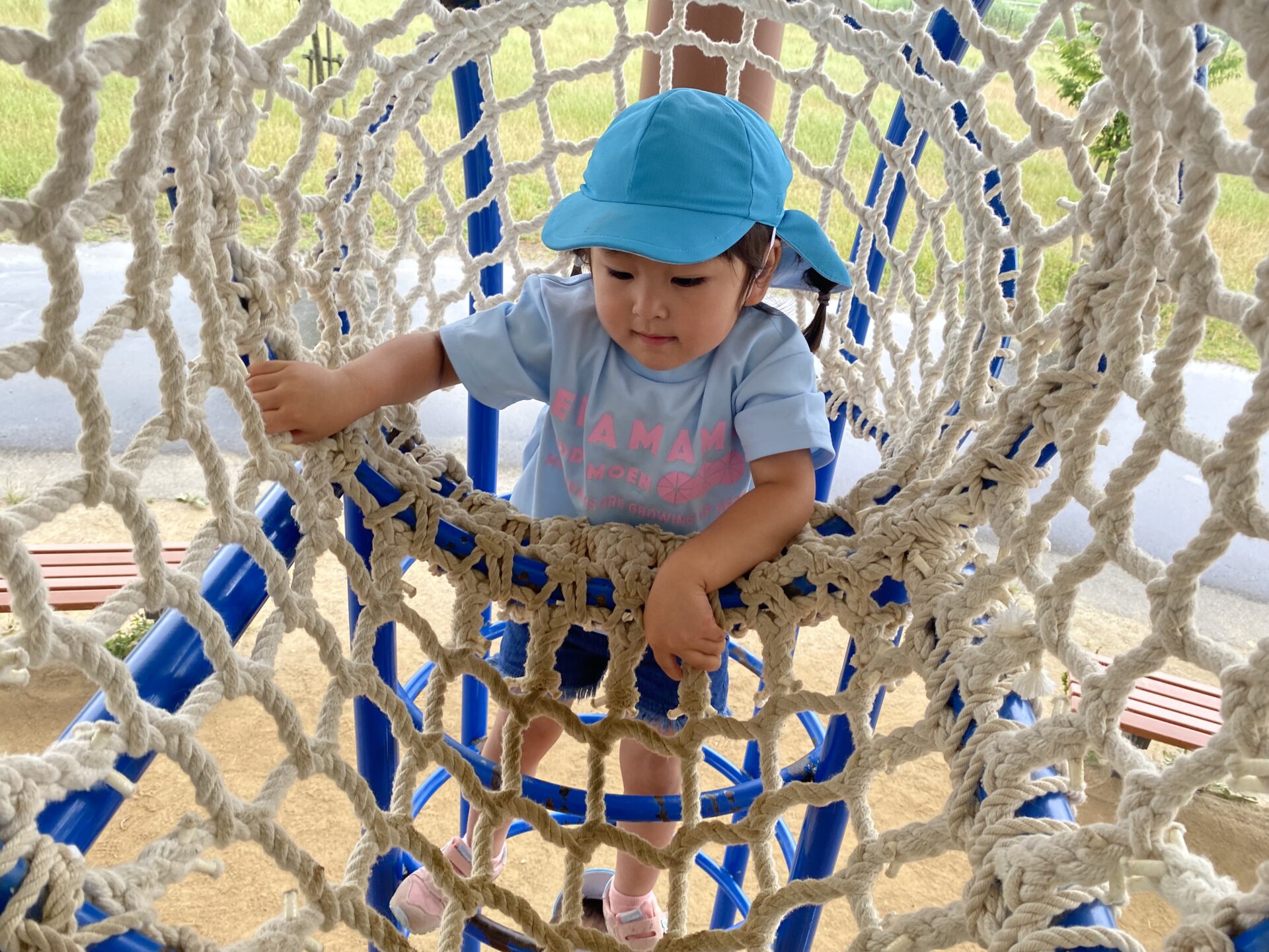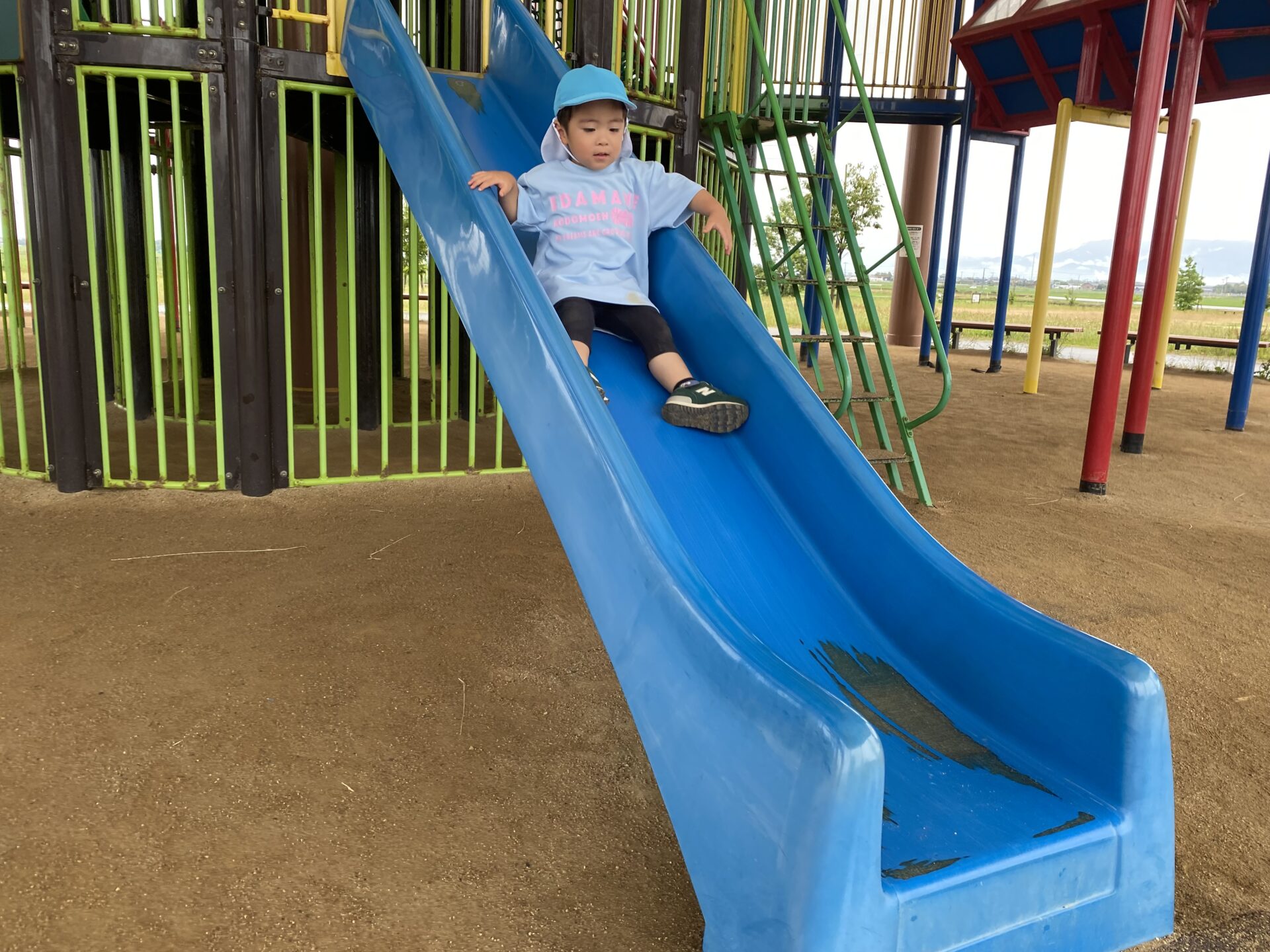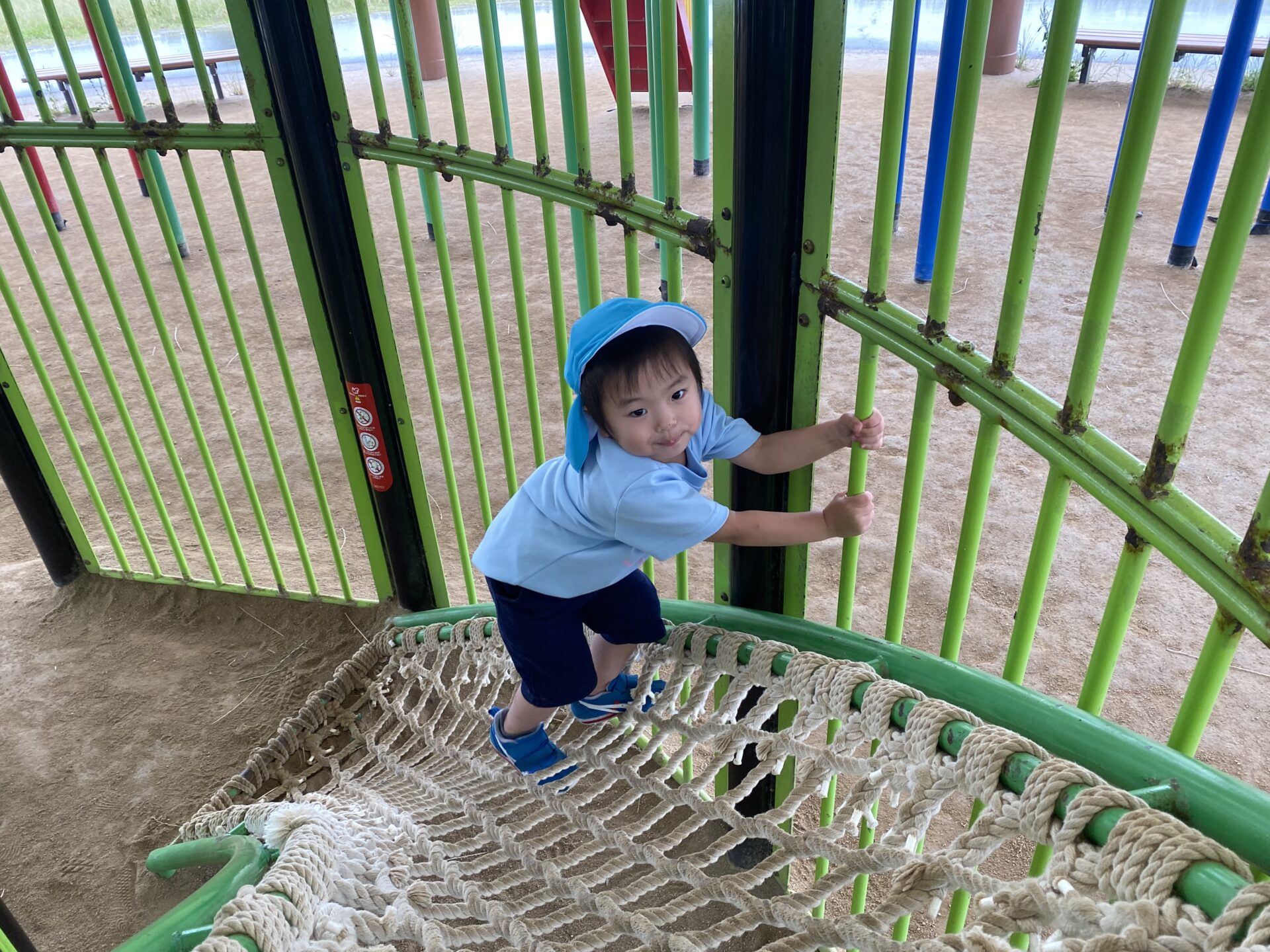 高い滑り台に「こわい…」と言いながらも、挑戦すると「楽しい!もう1回やる✨」と何度も滑ったり、ロープネットにも「ここ1人でできるんだよ!」と登ったりして、楽しみました😊