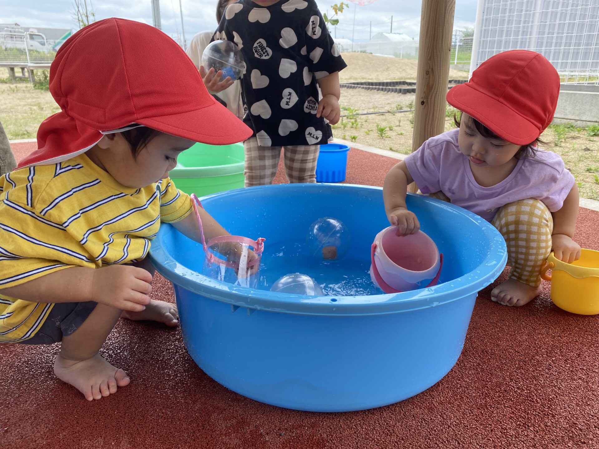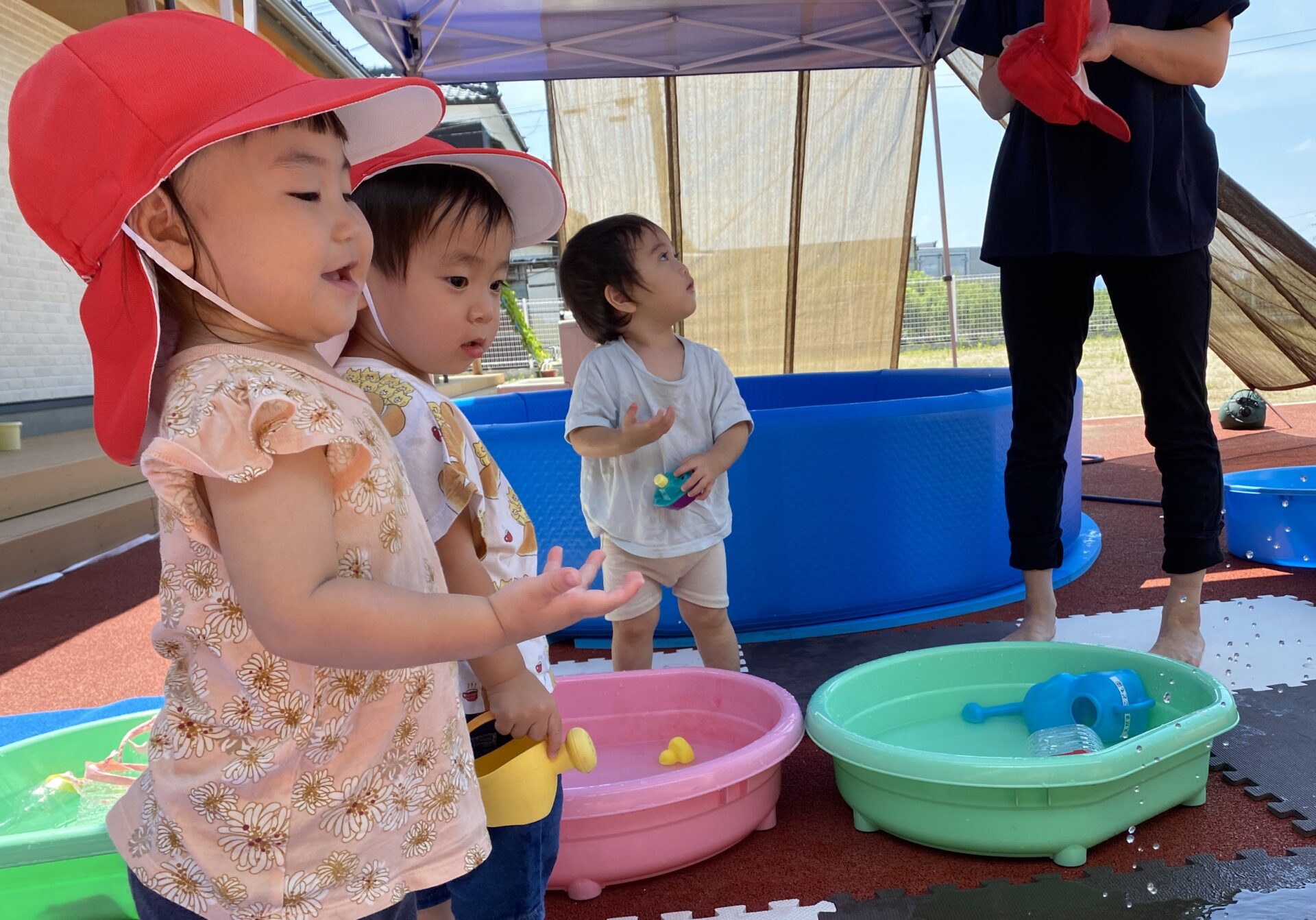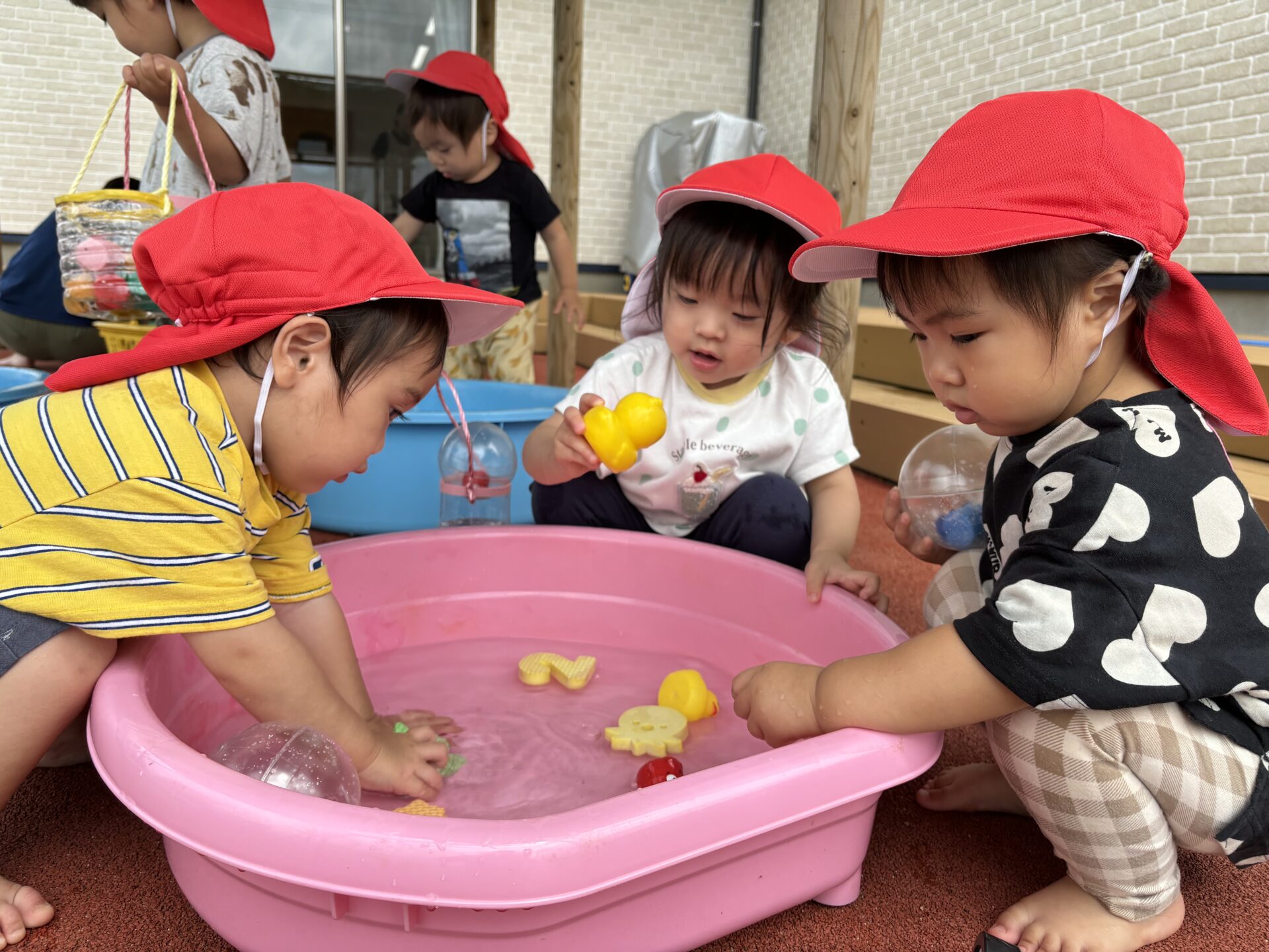 外へ出て、水の入ったタライや、水遊びのおもちゃを見つけると、子どもたちは目をキラキラさせます。