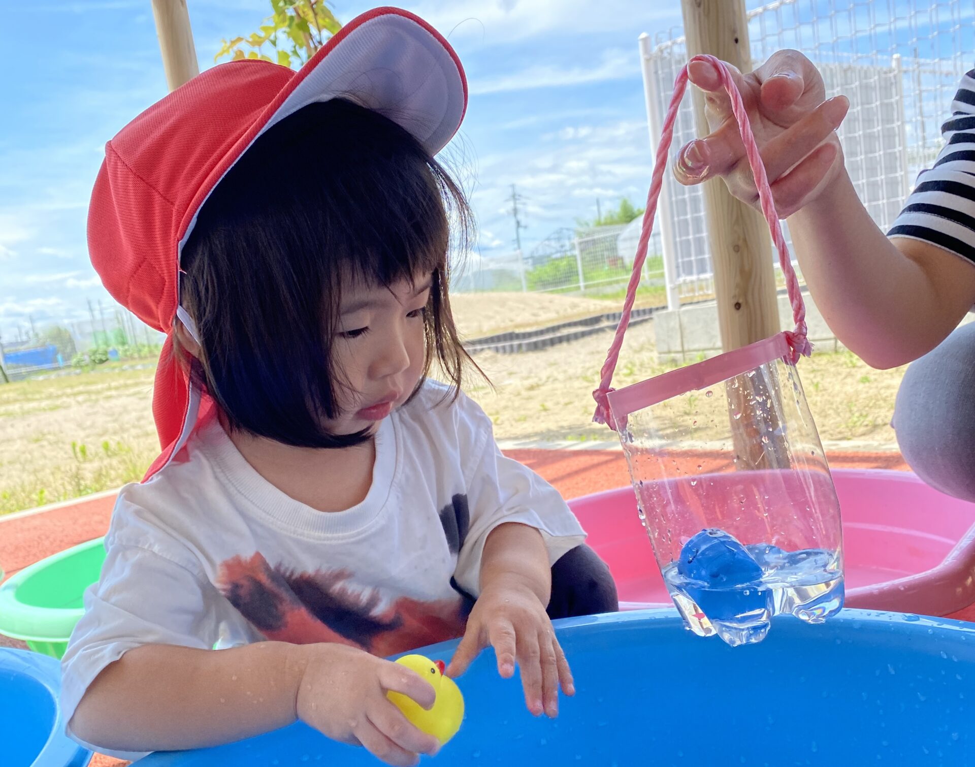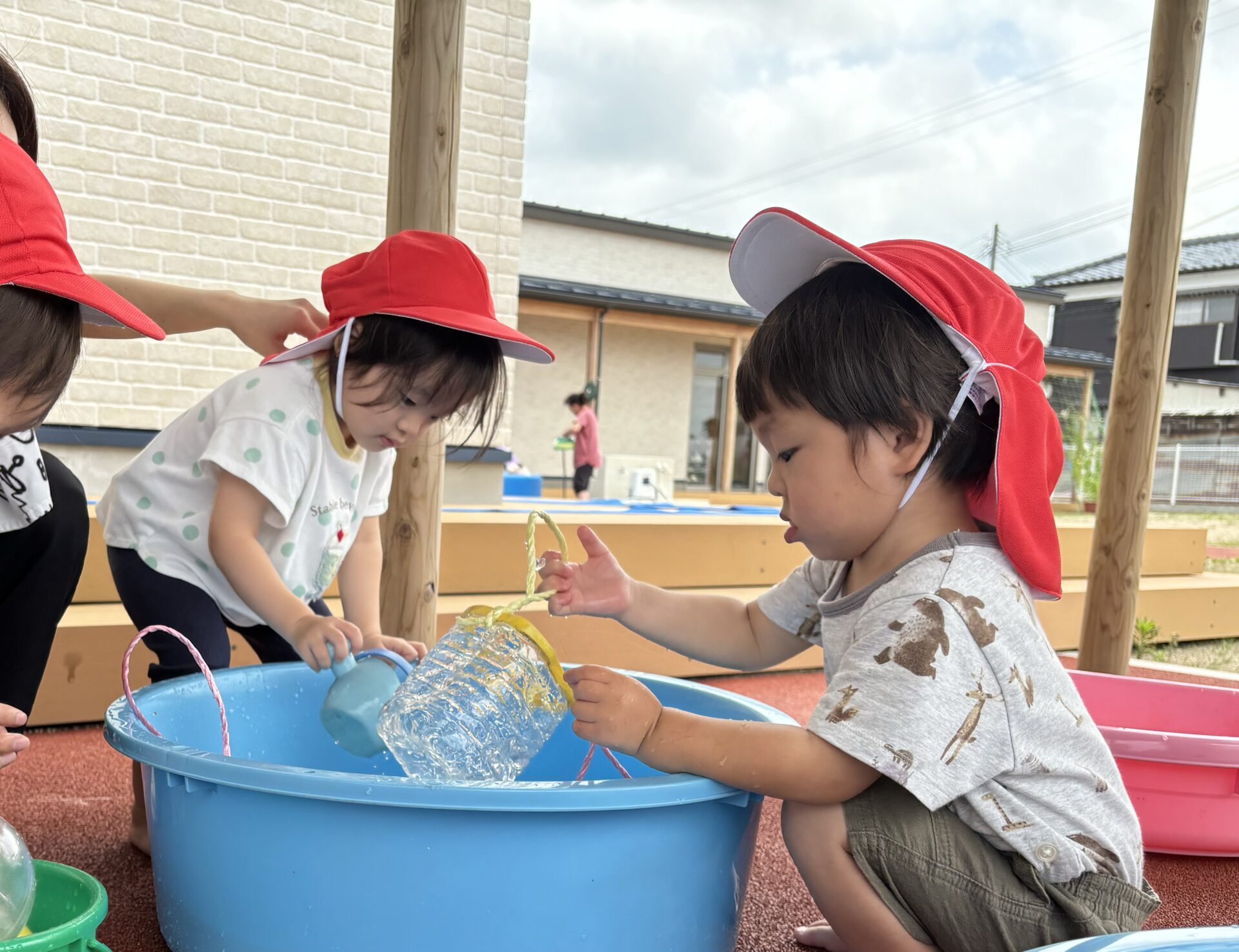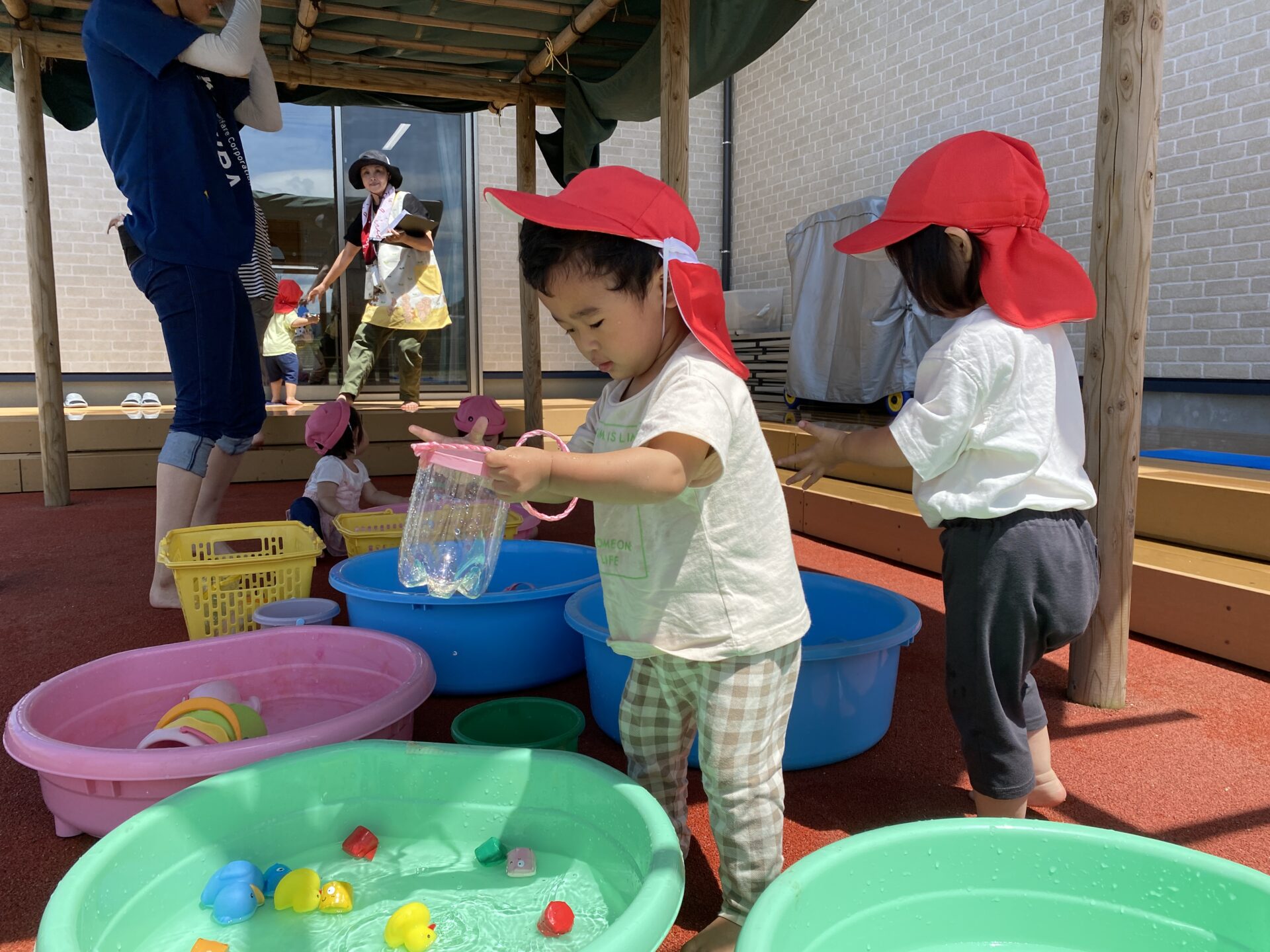 外へ出て、水の入ったタライや、水遊びのおもちゃを見つけると、子どもたちは目をキラキラさせます。