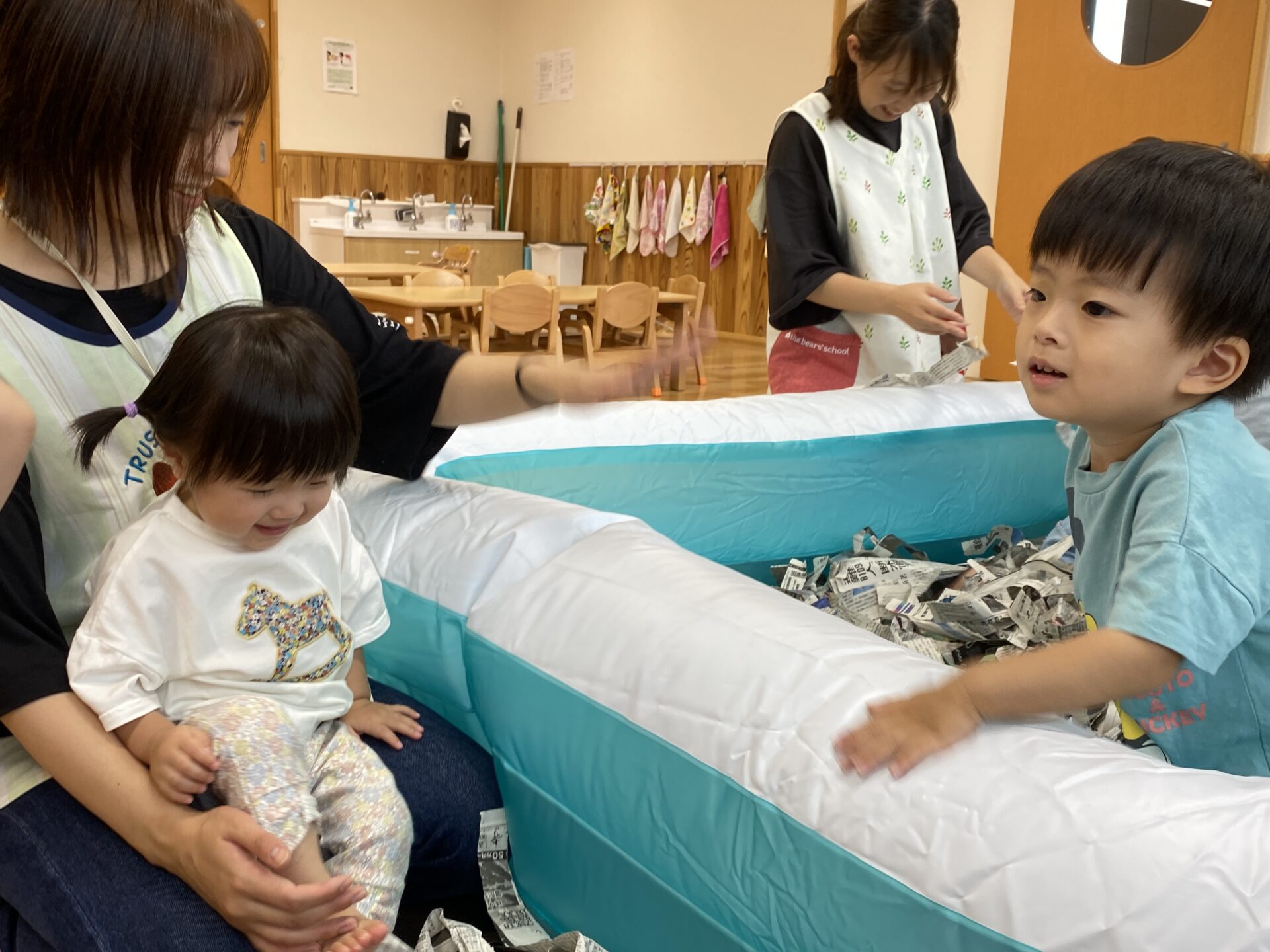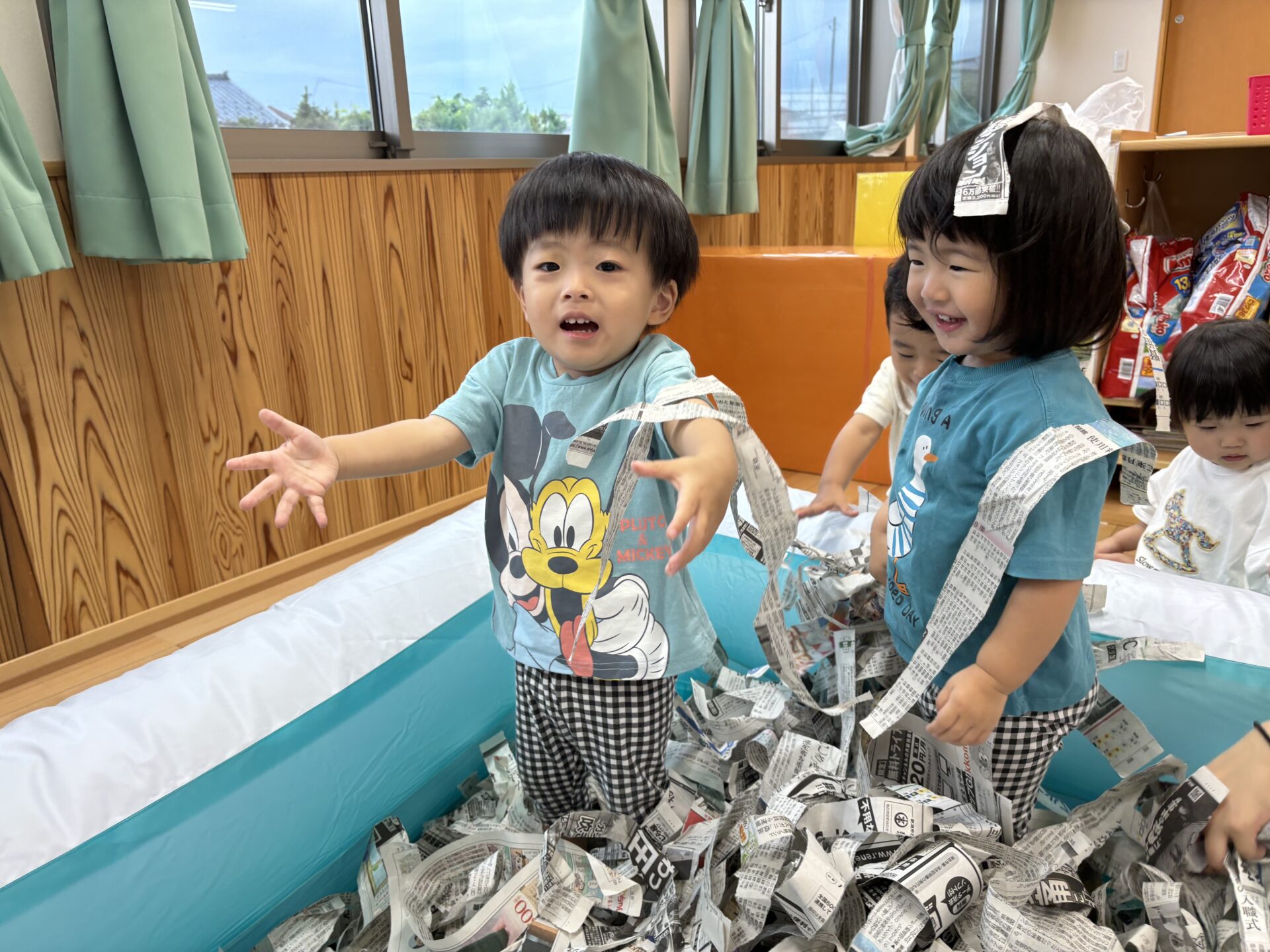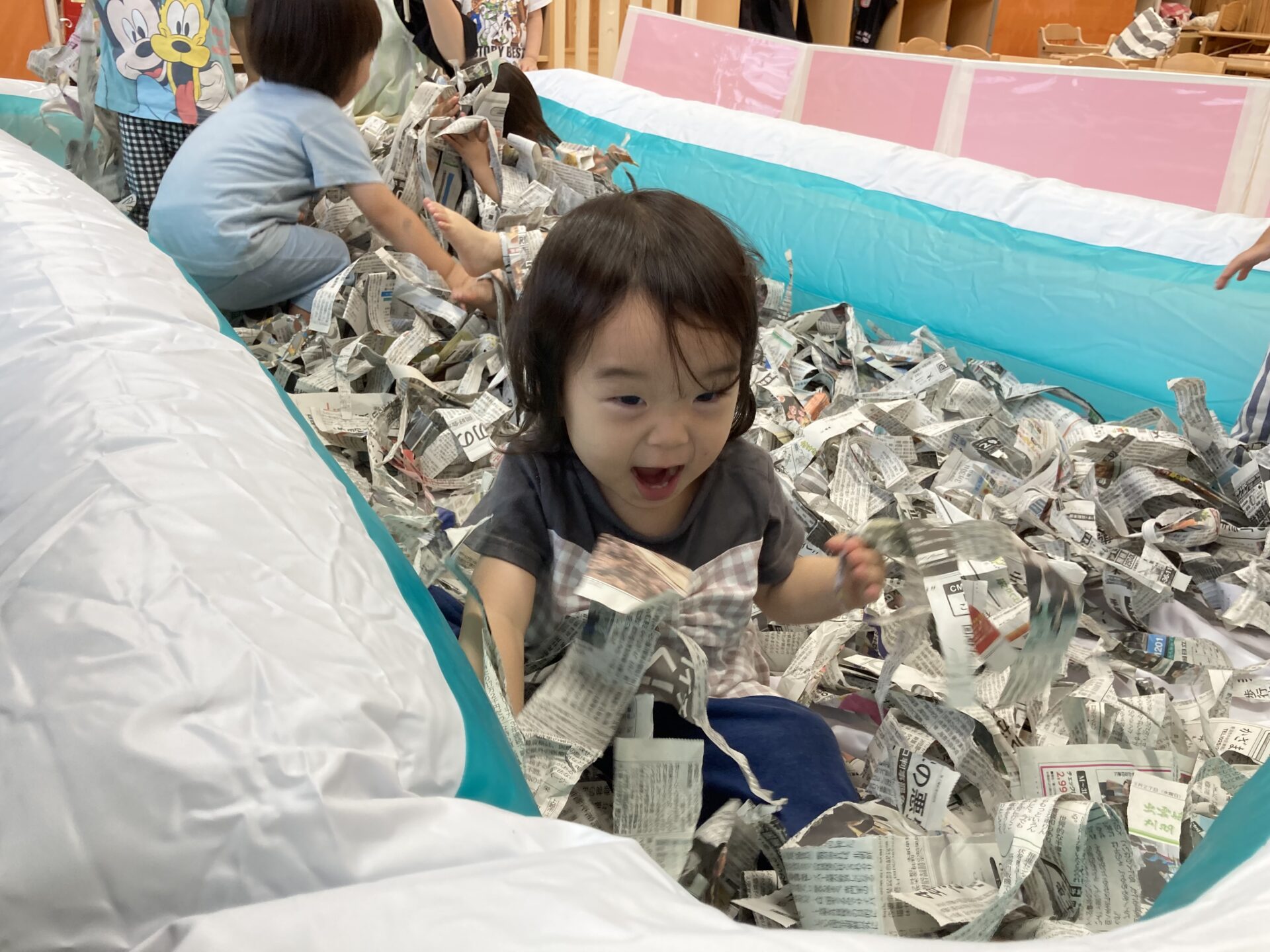 新聞プールは大人気!新聞紙の中に、かくれんぼをして「ばぁ~!」と、お友だちを驚かせる、可愛い表情も💕