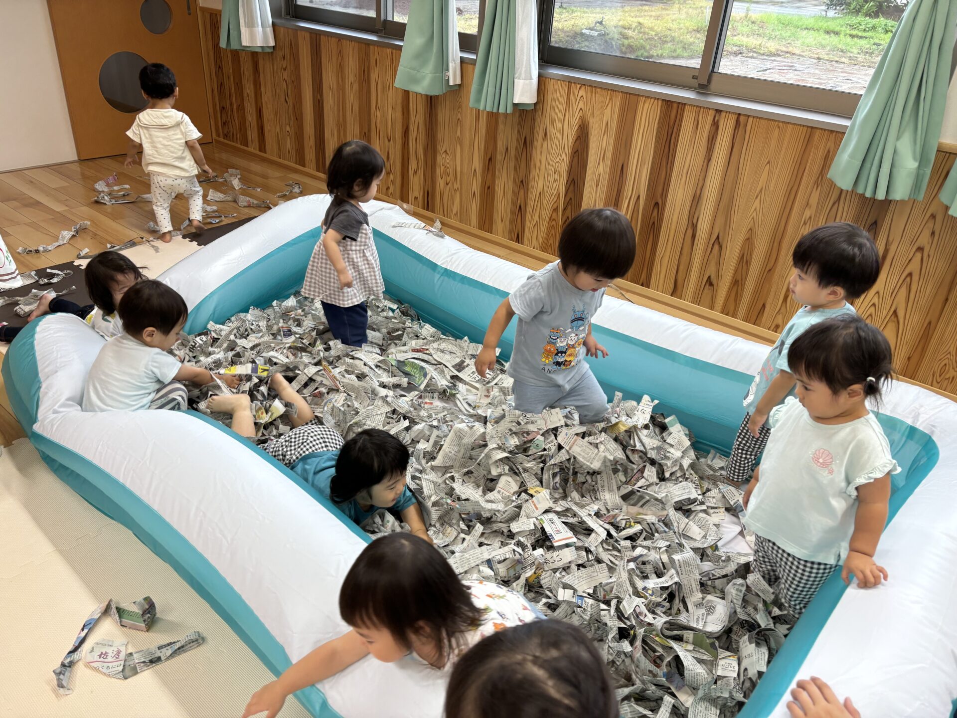そんな時は、保育室で新聞紙プールで泳いでいます🏊